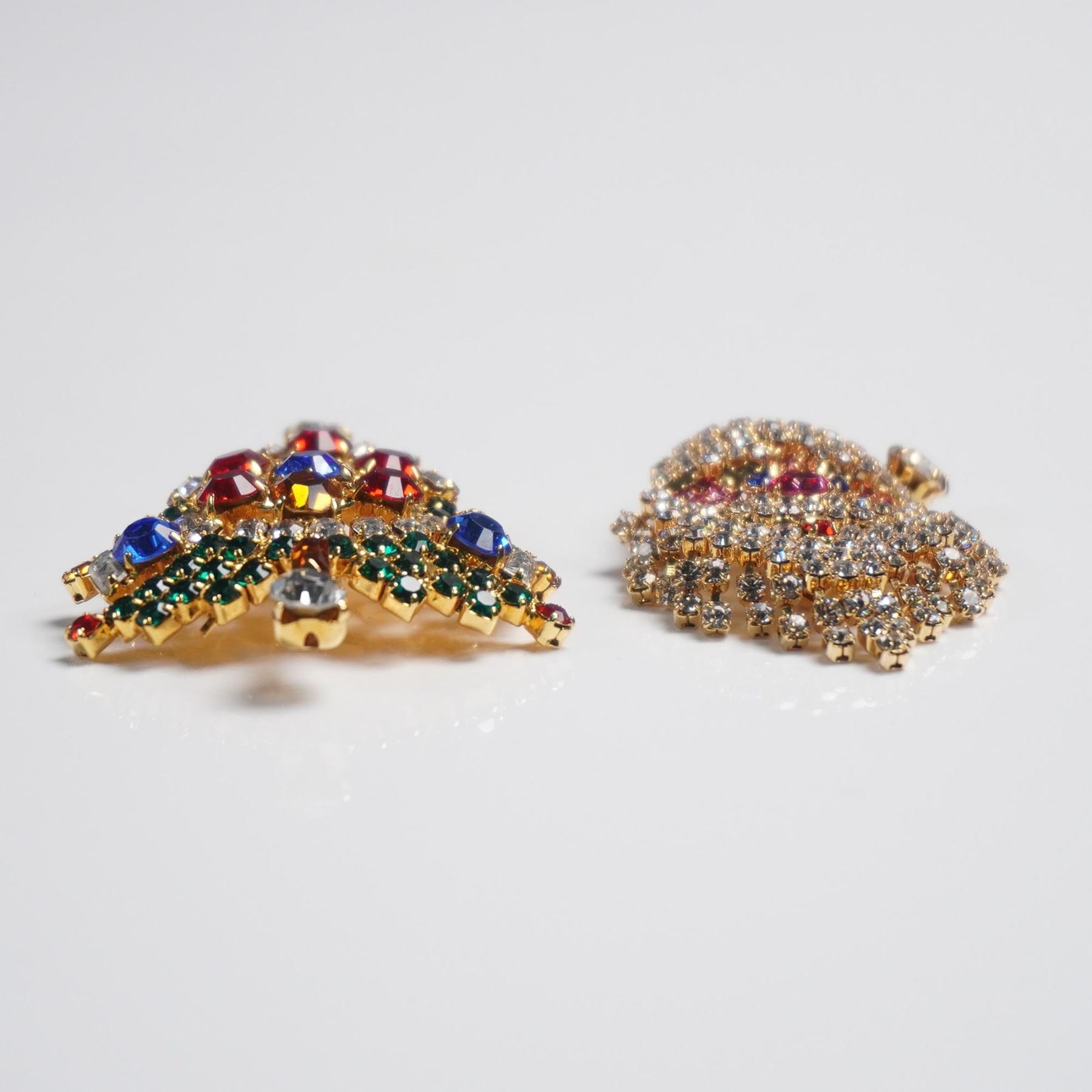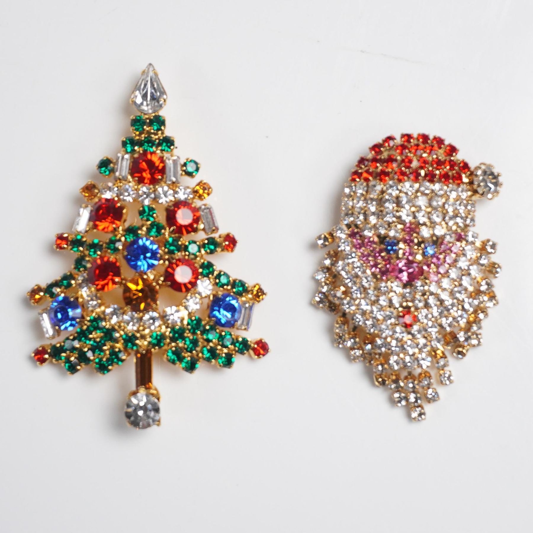 Festive 2-piece set of vintage-style rhinestone Christmas pins, featuring a sparkling Santa Claus face and a vibrant Christmas tree. The Santa pin is decorated with clear, red, pink, and blue rhinestones forming the classic holiday figure with cheerful detail. The Christmas tree pin, marked OTC on the reverse, is adorned with multicolored round and baguette rhinestones in a gold-tone setting and topped with a teardrop crystal "star." The tree measures approximately 2.75"H. Both pins are finished with secure pin backs and are perfect for seasonal wear or as collectible holiday jewelry.
