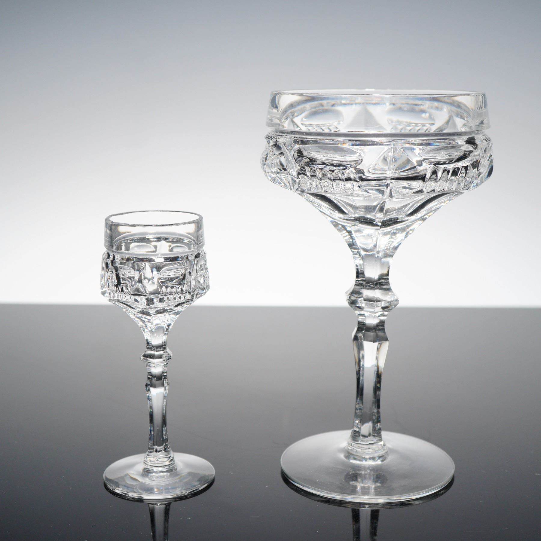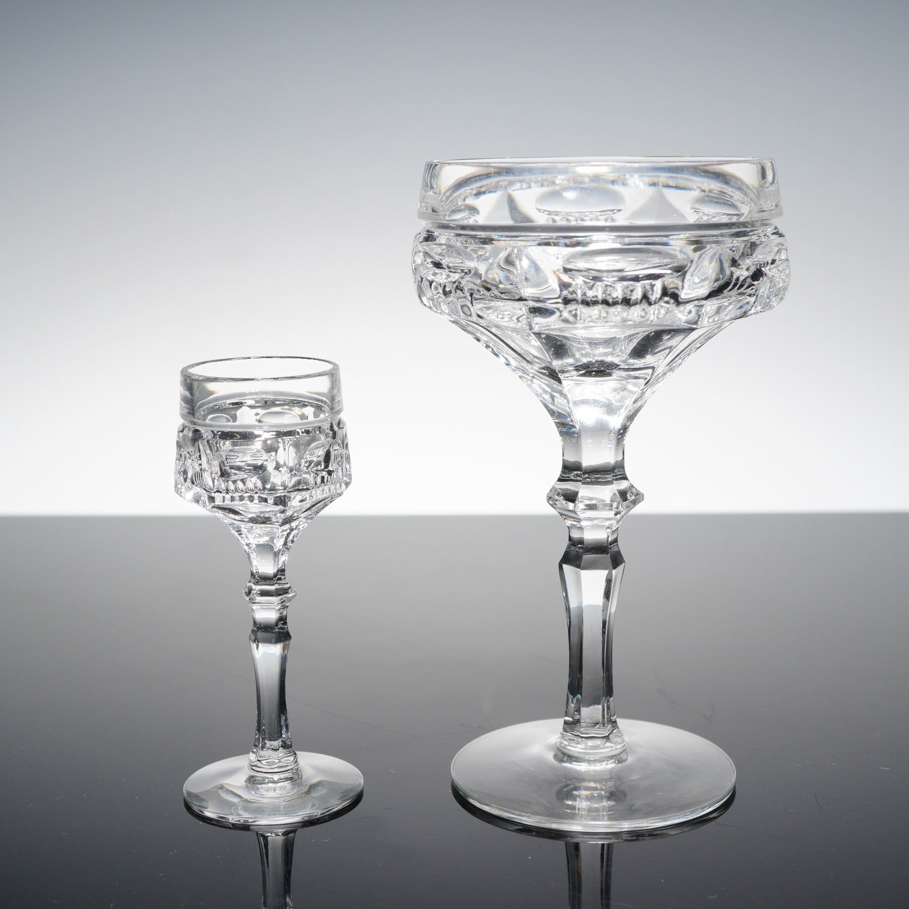 Two clear cut crystal stem glasses, including one champagne coupe and one cordial glass. Each features faceted detailing and hexagonal stems with polished bases.