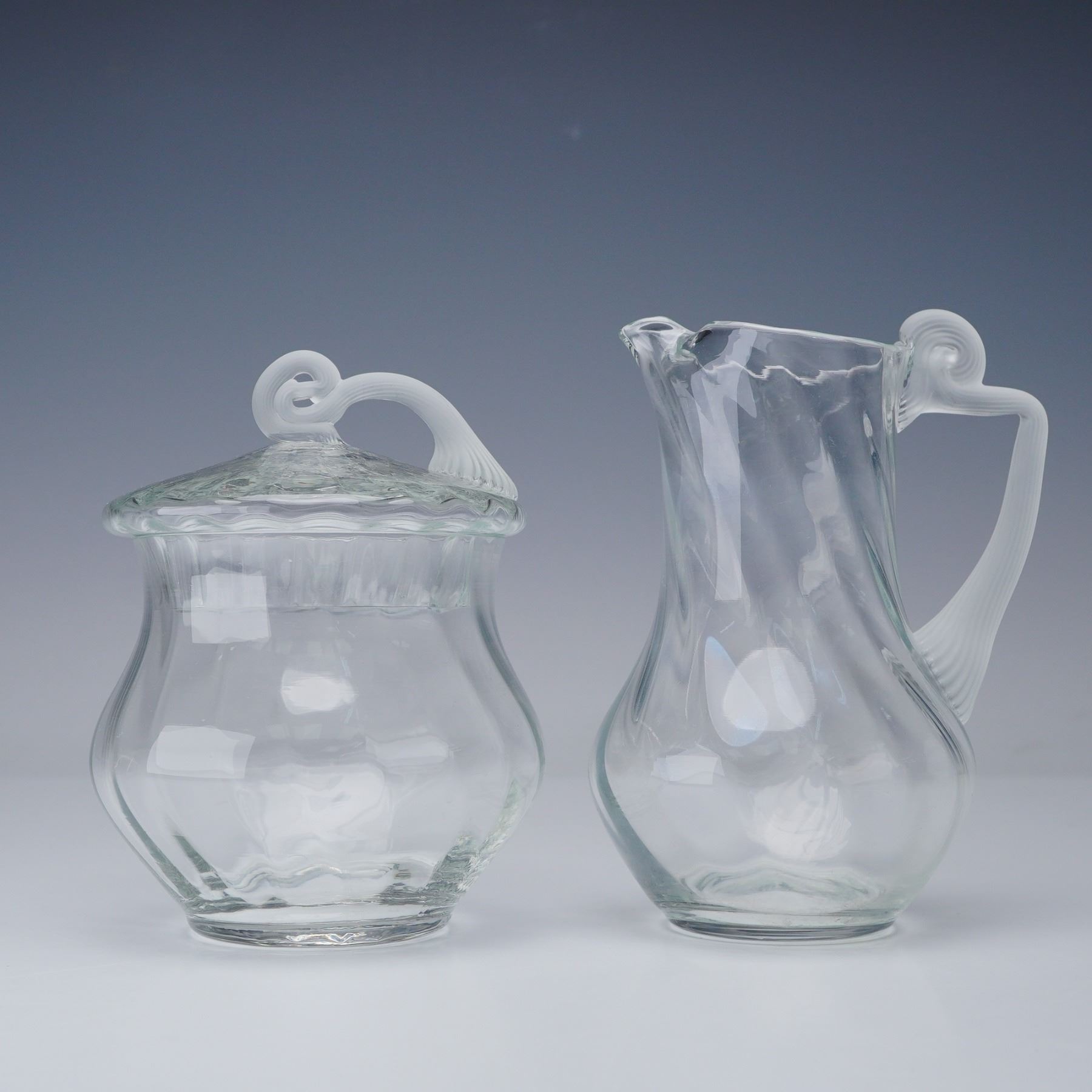 This clear art glass set includes a hand-blown creamer with a ribbed applied handle and shaped spout, paired with a matching sugar vessel and fitted lid. The creamer features a fluid, slightly twisted body with a white satin-finish handle formed in a curled motif. The sugar jar mirrors the same curving form and is topped with a coordinating lid, also finished with a curled, ribbed handle. Each piece displays subtle variations typical of hand-blown production, with clear glass bodies and applied white glass elements creating contrast in form and texture.