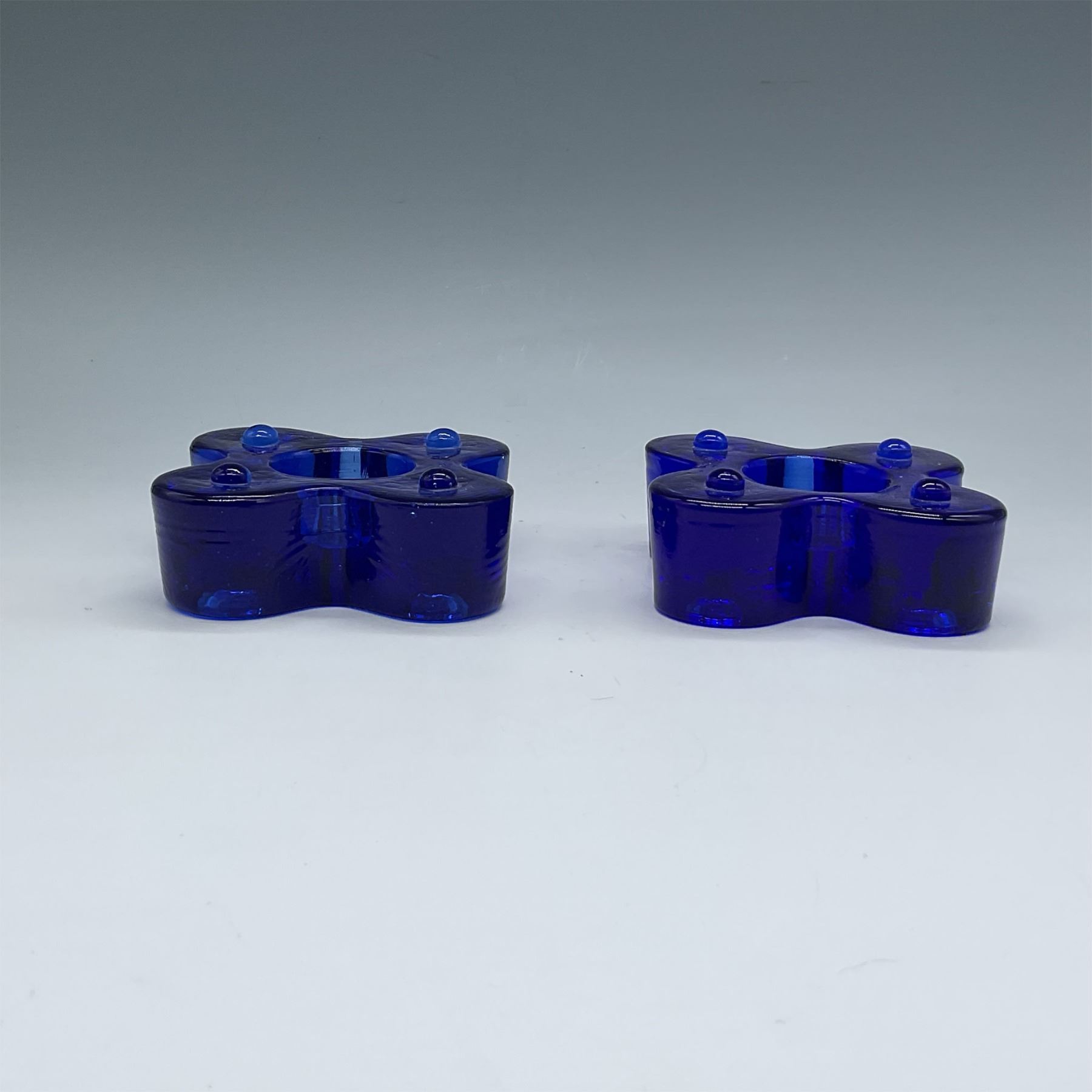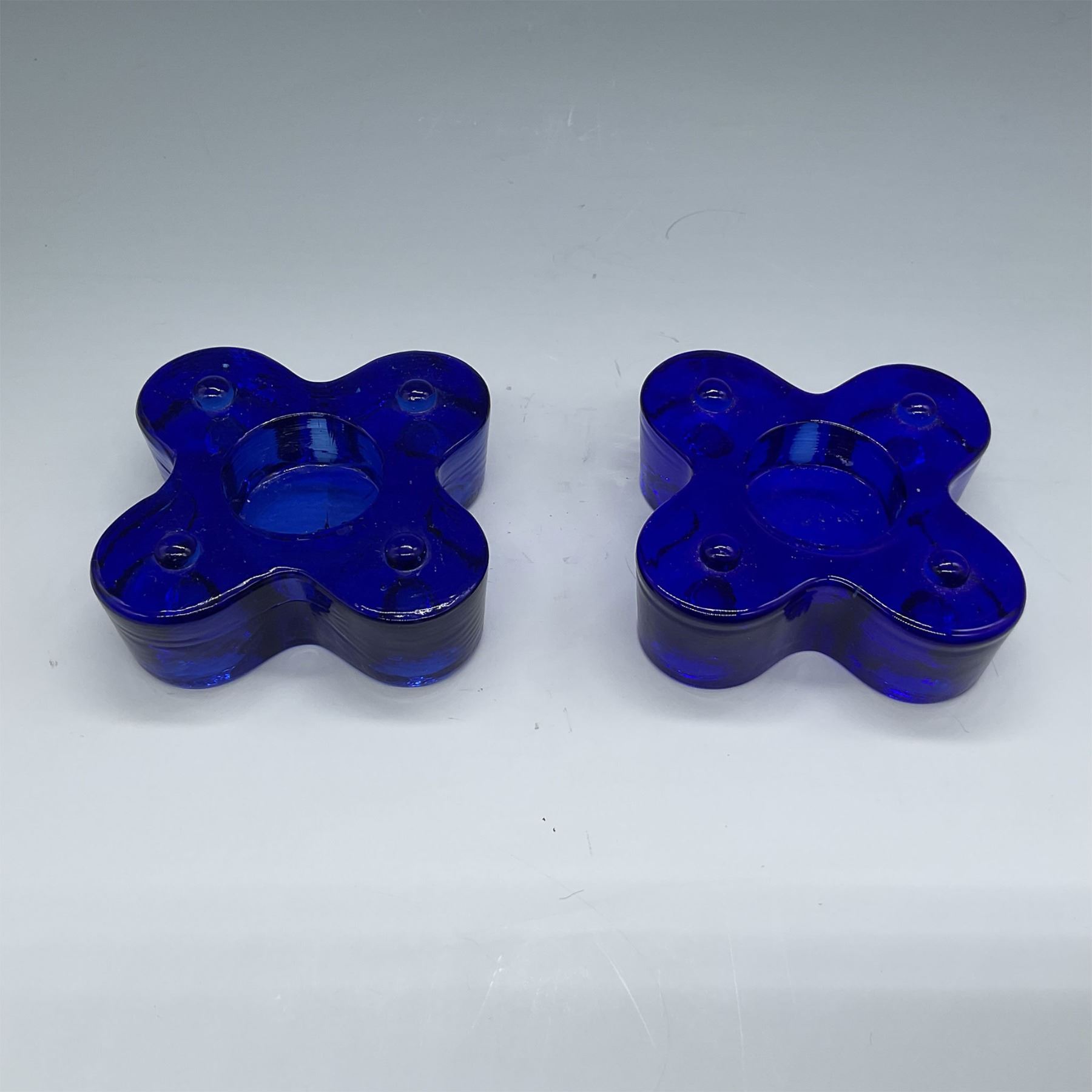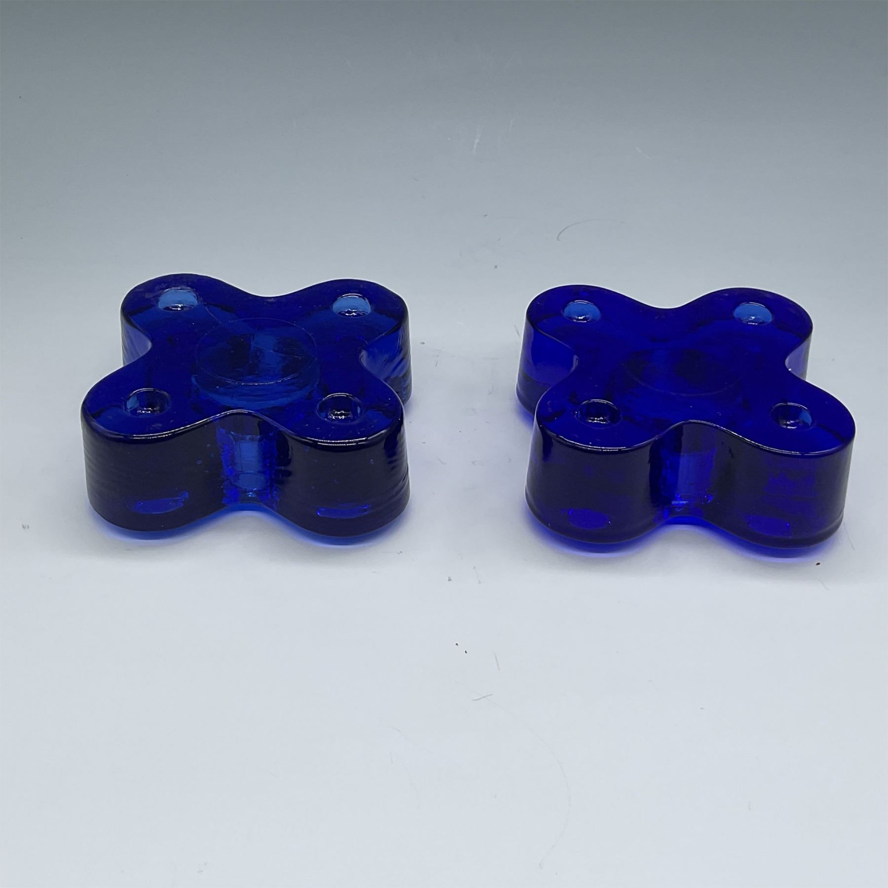 Set of two cobalt blue glass flower-shaped candle holders featuring a modern design. Each piece is crafted with vibrant cobalt blue glass, with a central holder suitable for votive candles. The base of each holder is designed with small, rounded protrusions for stability and added aesthetic detail. These elegant pieces are perfect for adding a pop of color and sophistication to any table or décor.