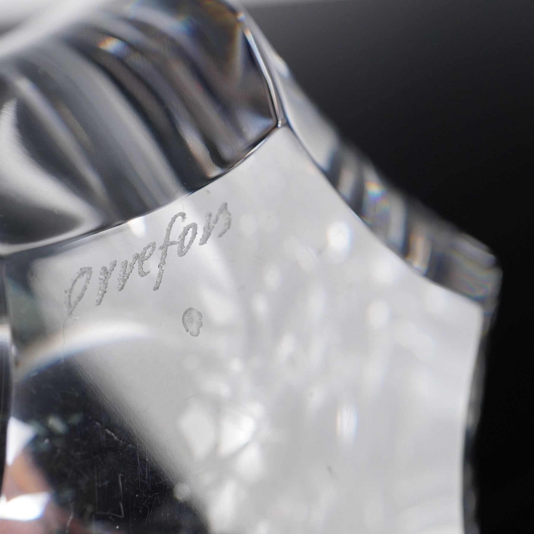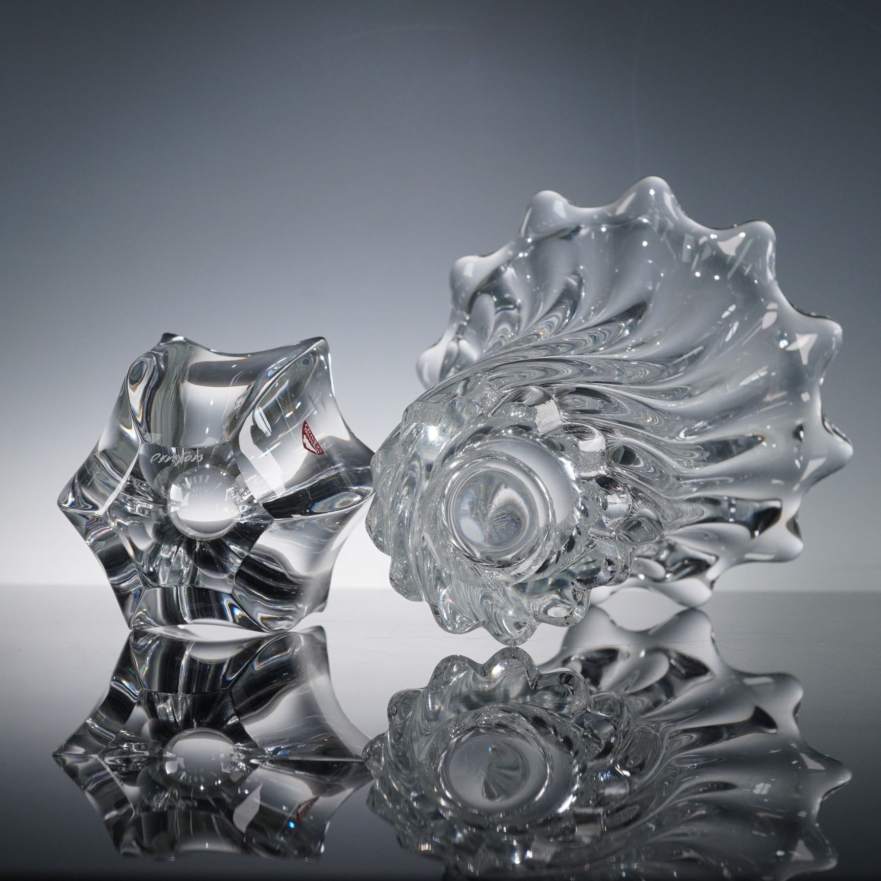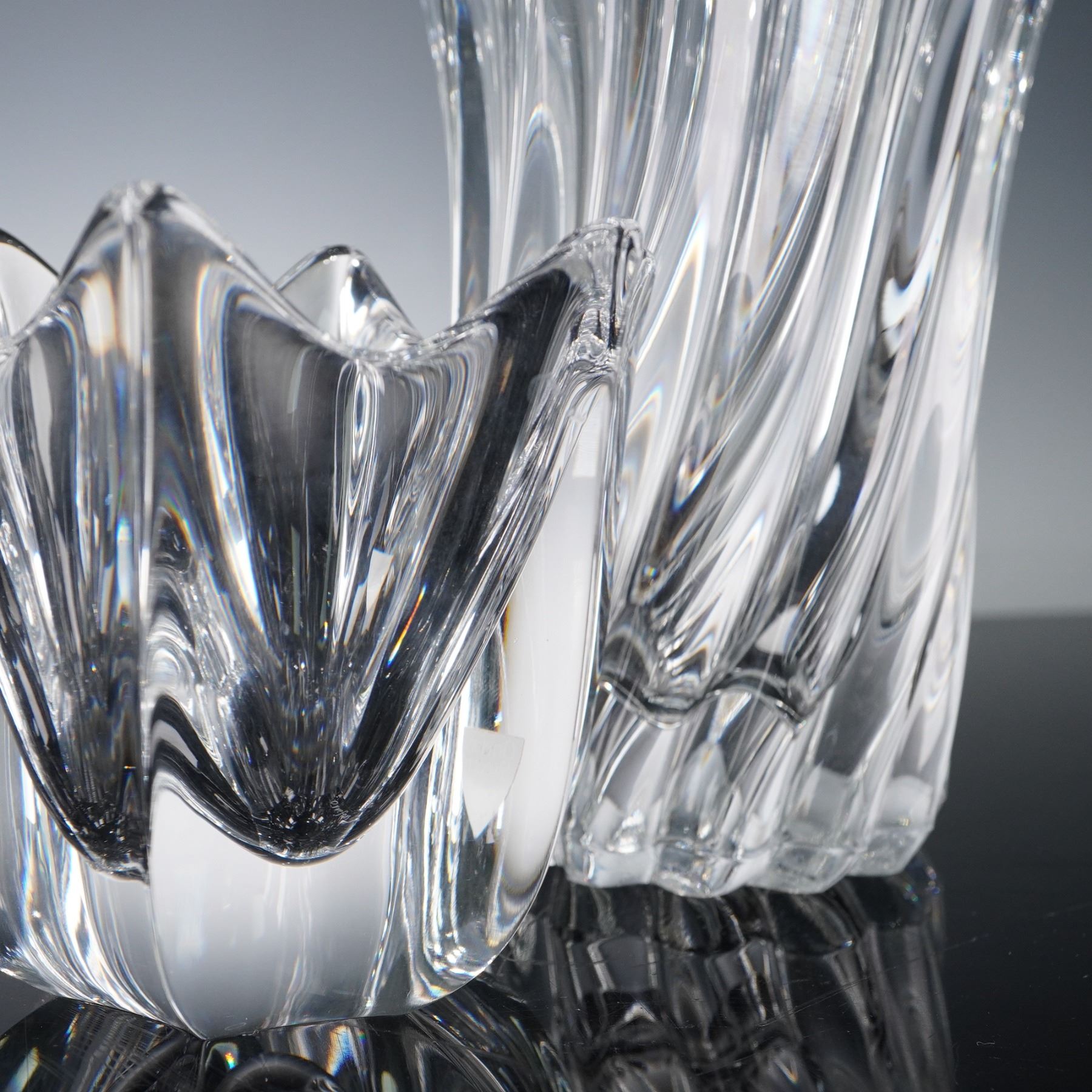 Crystal vases including one large flared sculptural vase by Cofrac Art Verrier, France, signed and bearing acid-etched mark to base, and one smaller freeform folded-edge vase by Orrefors, Sweden, with etched signature to underside. Both display superb clarity and craftsmanship characteristic of their respective makers.