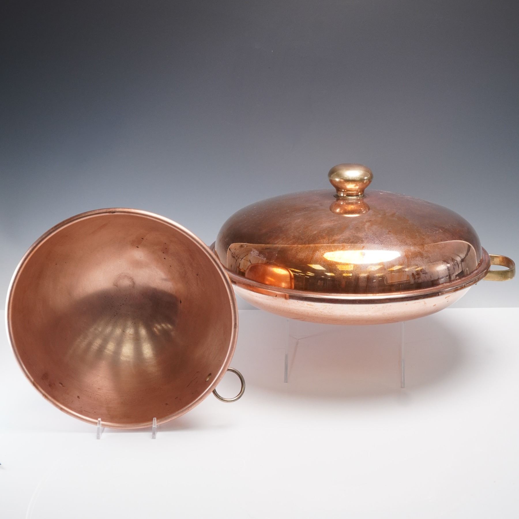 Two-piece copper cookware set featuring one marked lidded saute pan by Spring Culinox and one unmarked round copper bowl. The Spring Culinox pan is stamped "Spring Culinox GL Made in Switzerland" with the company's distinctive deer logo. It includes a domed copper lid topped with a brass knob and brass side handles. Spring, a respected Swiss brand founded in 1946, is known for professional-grade cookware with high thermal conductivity and durable craftsmanship. The second piece is a classic open copper mixing bowl with a rolled rim and a brass hanging ring"versatile for culinary use or rustic kitchen display.