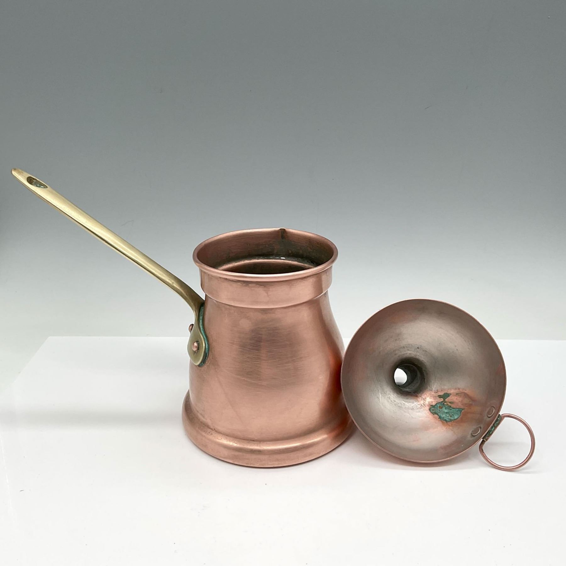 Lot includes melting pan or coffee roasting pan with brass handle 8"L x 4.5"W x 4.75"H. Funnel with ring handle measures 4"H x 4" dia. Made in Portugal impressed mark.