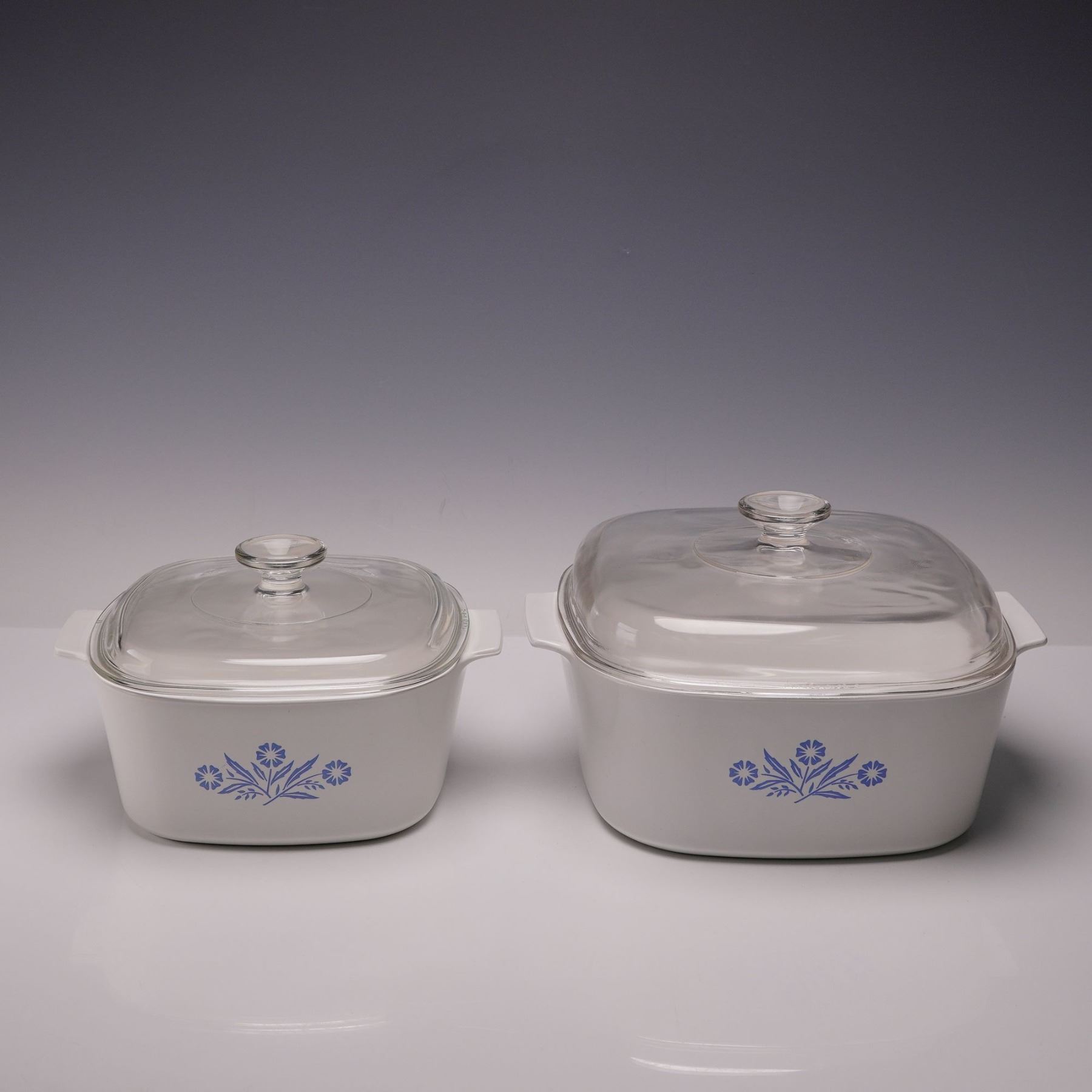 This iconic pattern, introduced in the late 1950s, features the timeless blue floral motif on white Pyroceram glass-ceramic bodies. Includes one 3-quart (A-3-B) and one 5-quart dish, both marked on the base and suitable for oven, microwave, range, and freezer use. The clear domed lids provide a perfect fit, highlighting the mid-century charm and everyday functionality that made CorningWare a kitchen staple.