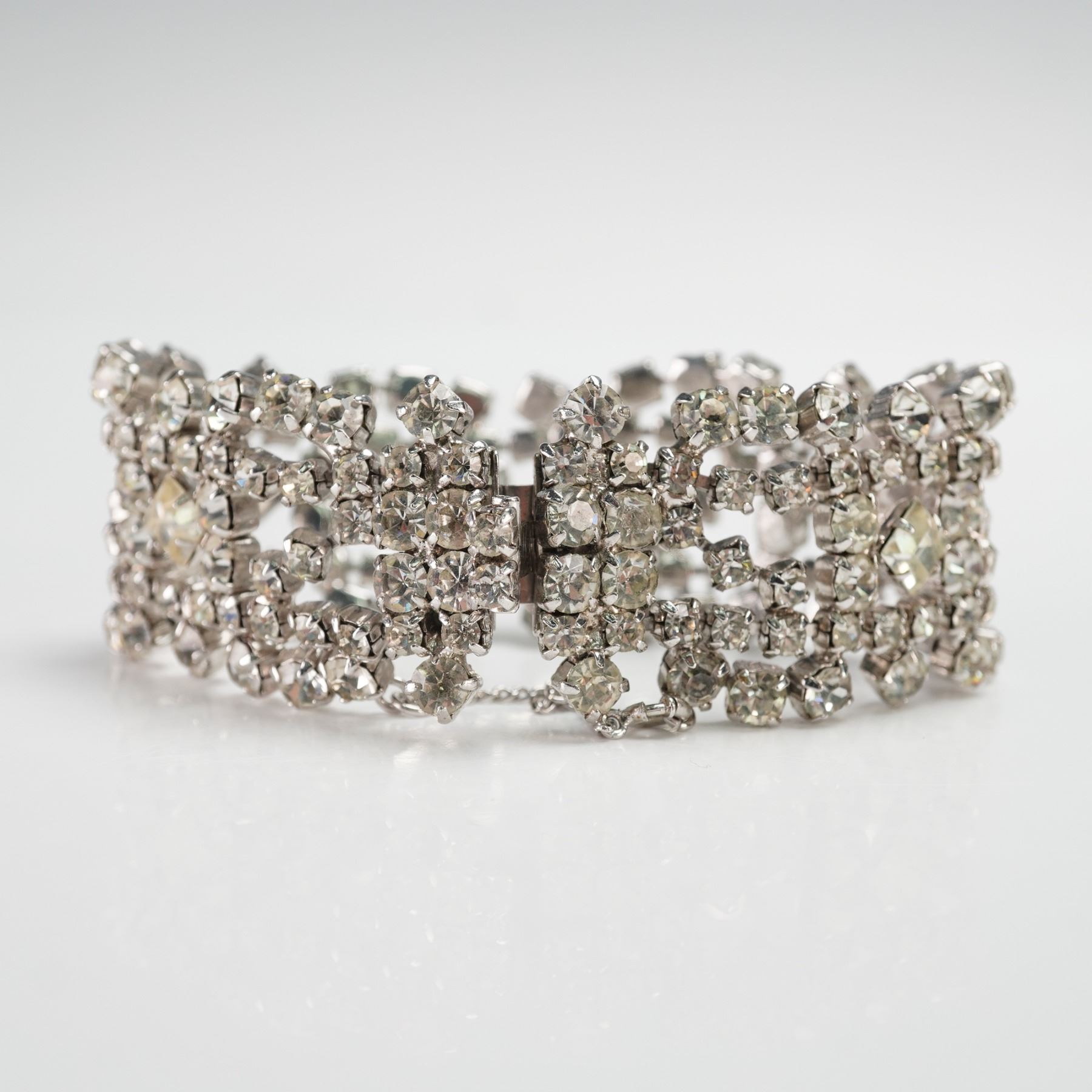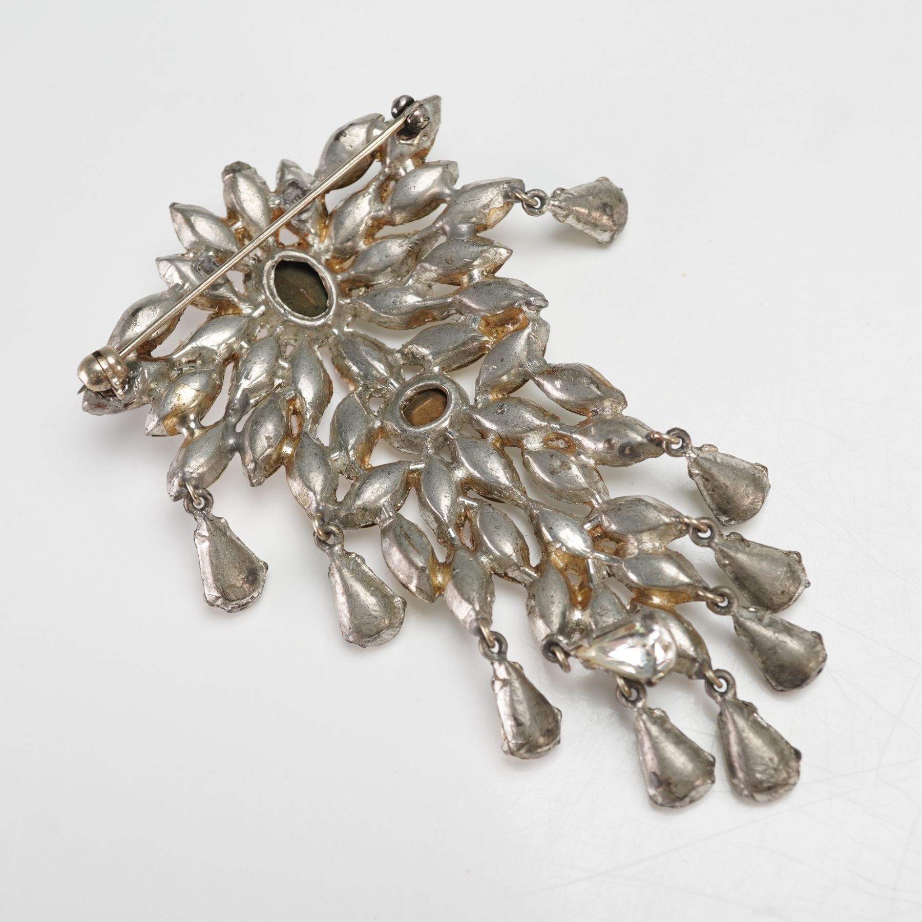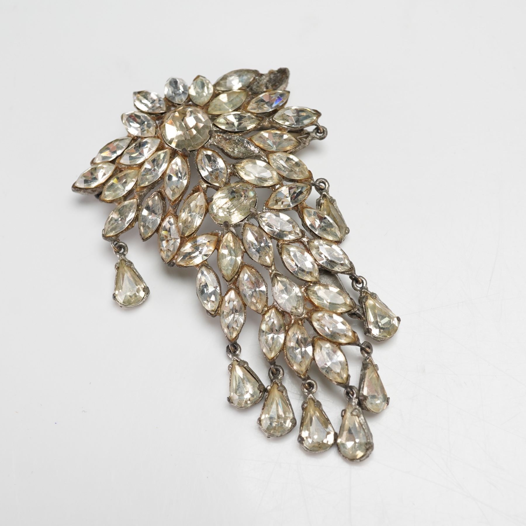 Lot of two vintage costume jewelry pieces including a silver-tone rhinestone bracelet with openwork bow motif and safety chain, and a large cascading rhinestone brooch featuring marquise and teardrop-cut stones in a floral spray design. Both pieces exhibit classic midcentury sparkle and glamour, ideal for evening wear or vintage display. Good vintage condition with light age-related tarnish and minor stone discoloration. Some stones may show wear consistent with age.
