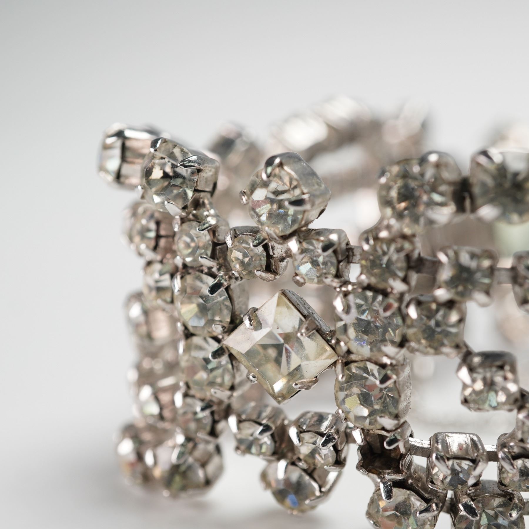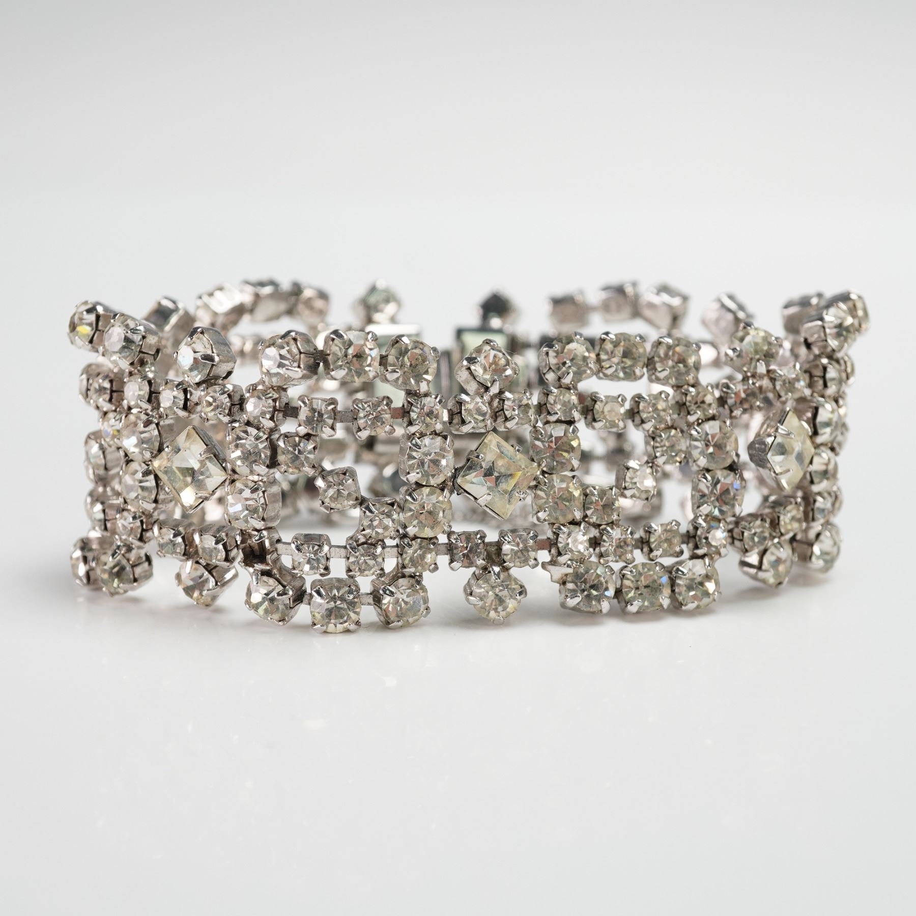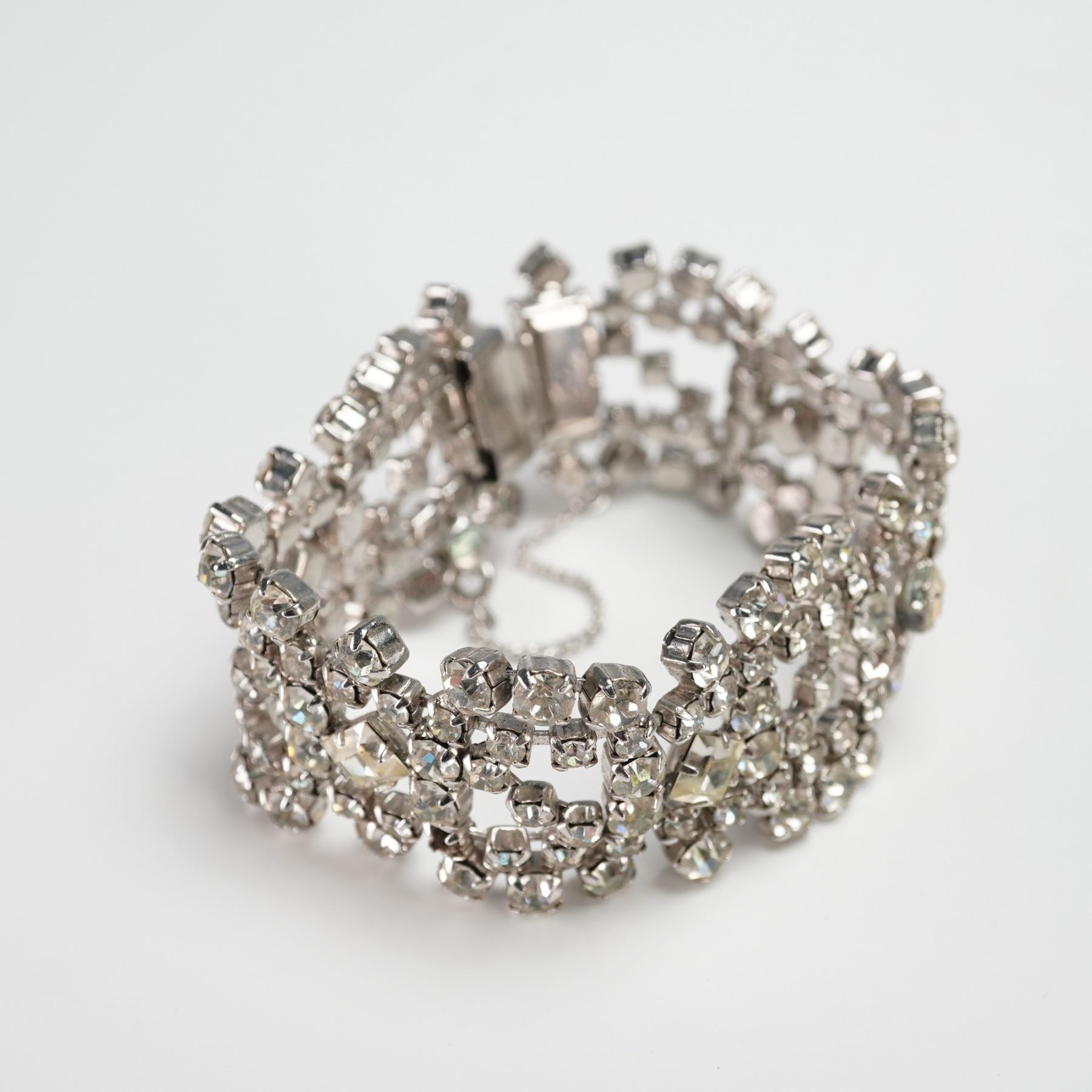 Lot of two vintage costume jewelry pieces including a silver-tone rhinestone bracelet with openwork bow motif and safety chain, and a large cascading rhinestone brooch featuring marquise and teardrop-cut stones in a floral spray design. Both pieces exhibit classic midcentury sparkle and glamour, ideal for evening wear or vintage display. Good vintage condition with light age-related tarnish and minor stone discoloration. Some stones may show wear consistent with age.