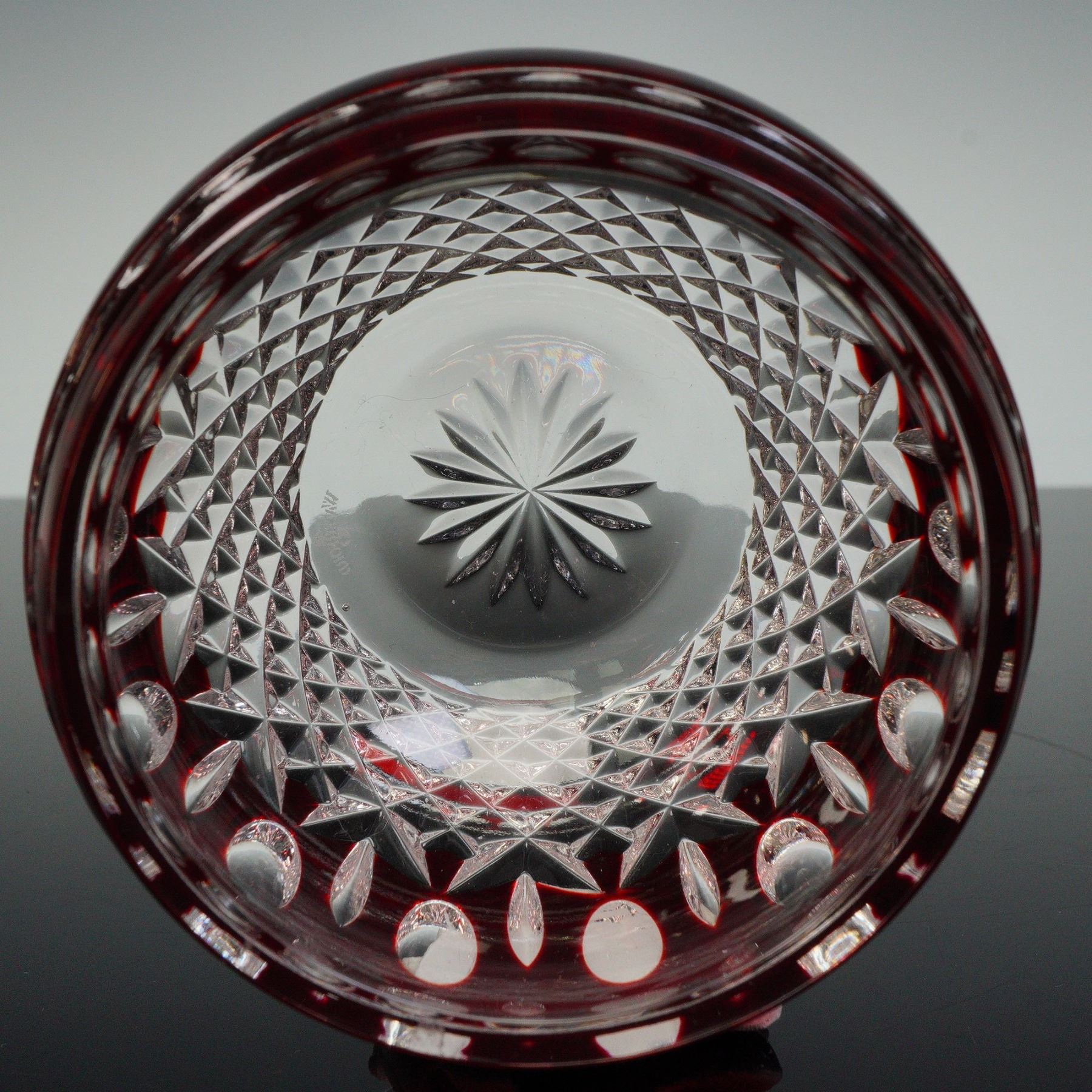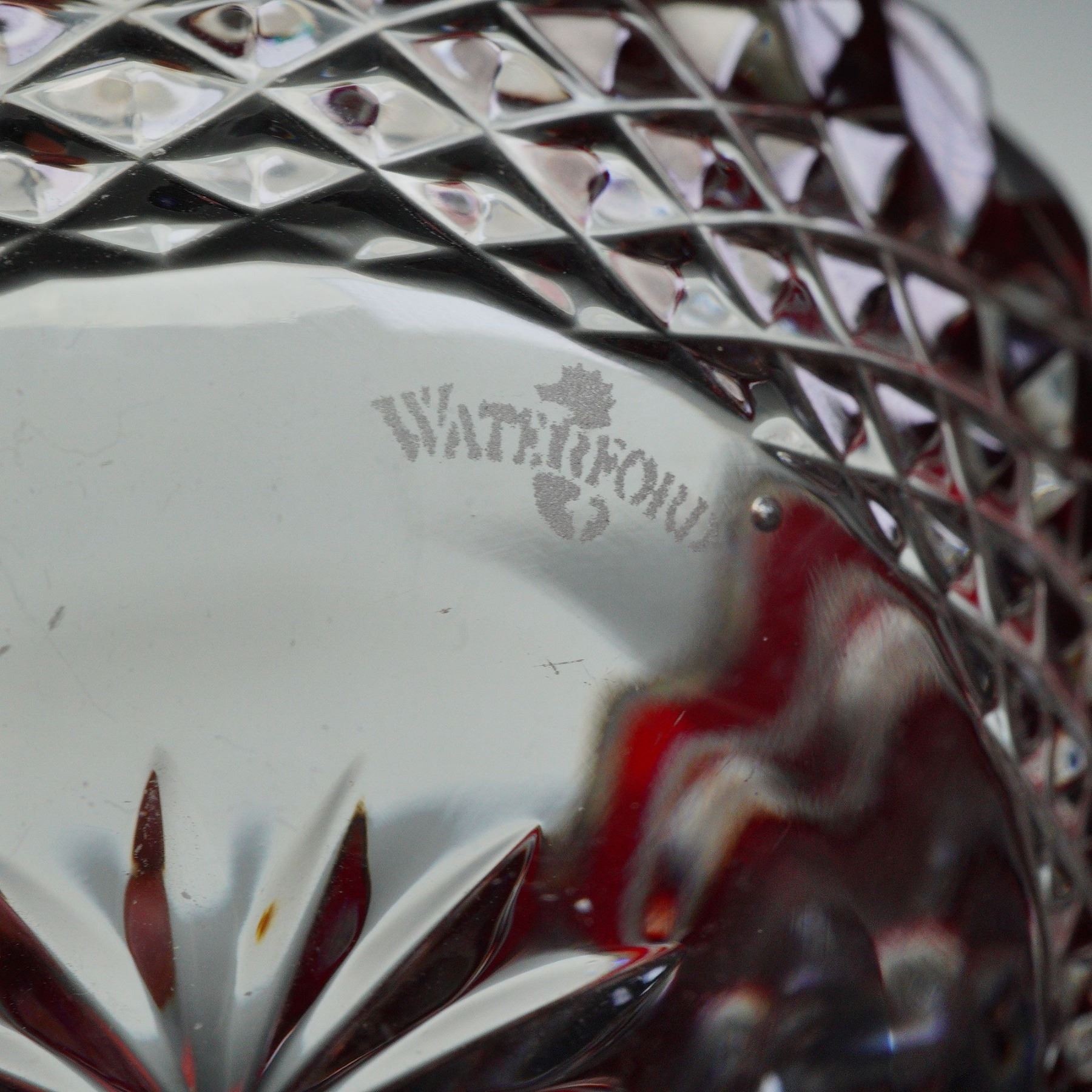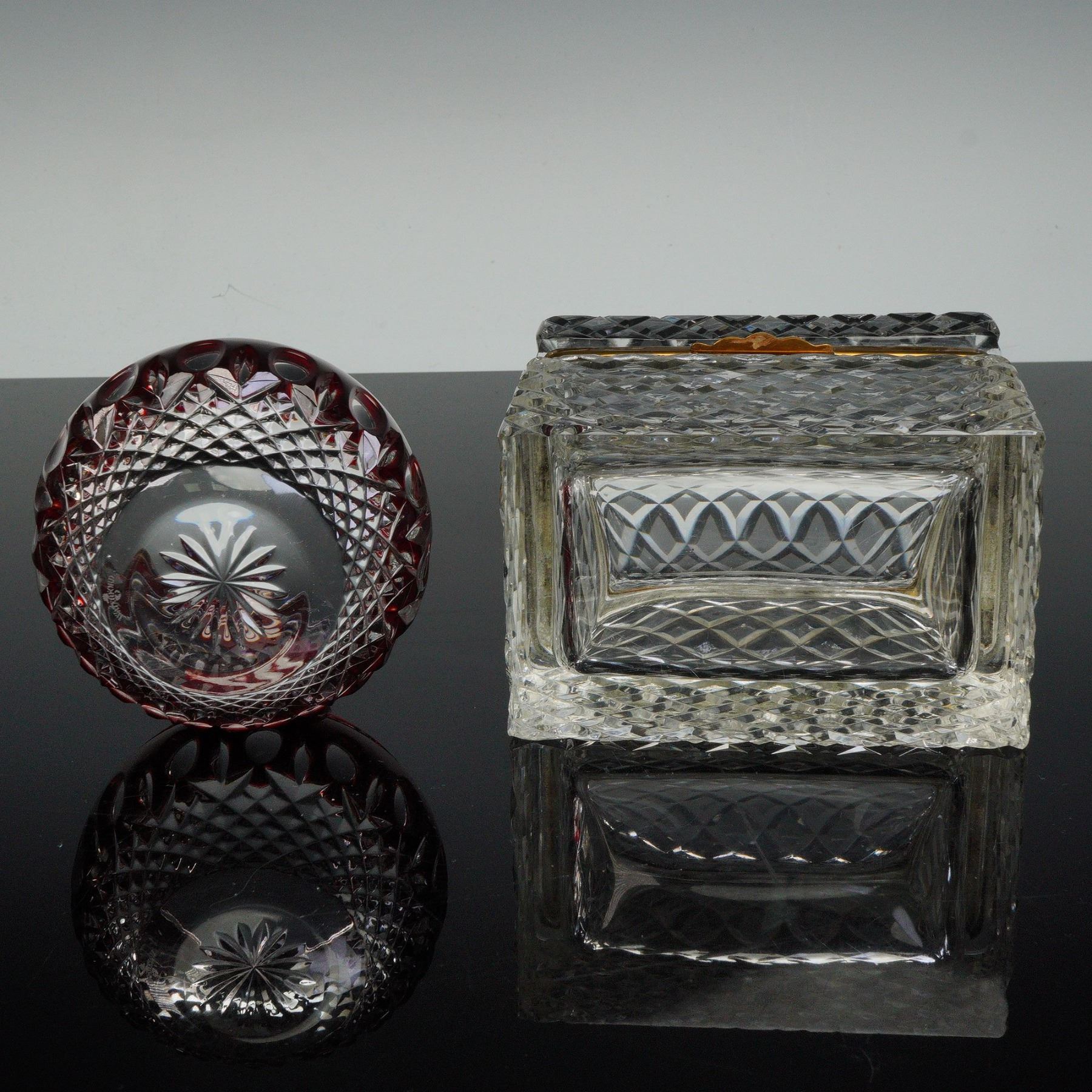 A fine pair of cut crystal pieces including a Waterford crystal ruby-to-clear cut bowl and a clear crystal dresser box. The Waterford bowl features brilliant diamond and fan cuts with oval hobstars and a rich cranberry overlay, finished with the Waterford acid-etched mark to the base. It presents beautifully with sharp detail and striking color contrast. The companion piece is a heavy clear cut crystal lidded dresser box with a diamond pattern and brass-mounted hinged lid, exhibiting exceptional craftsmanship and weight.