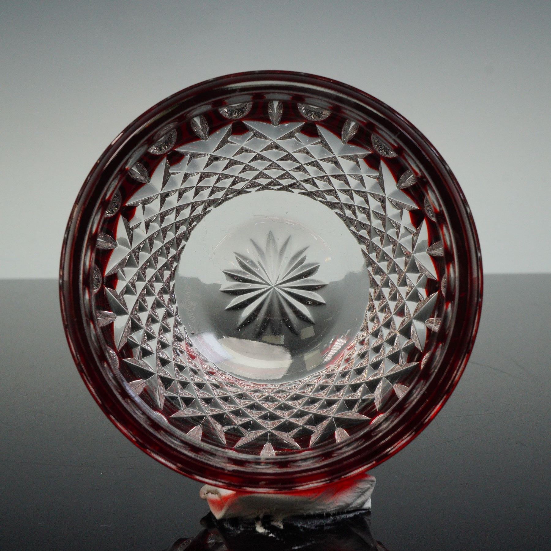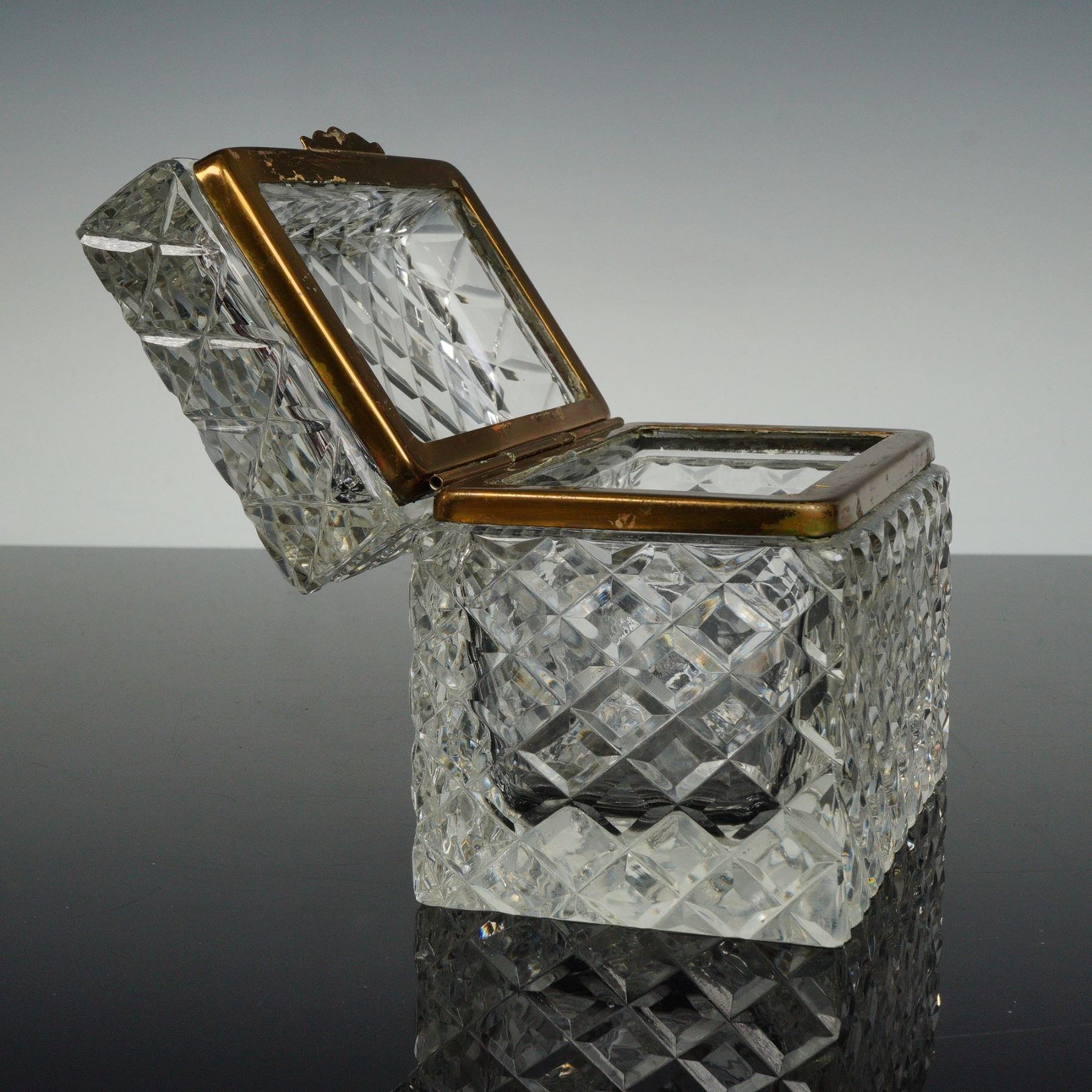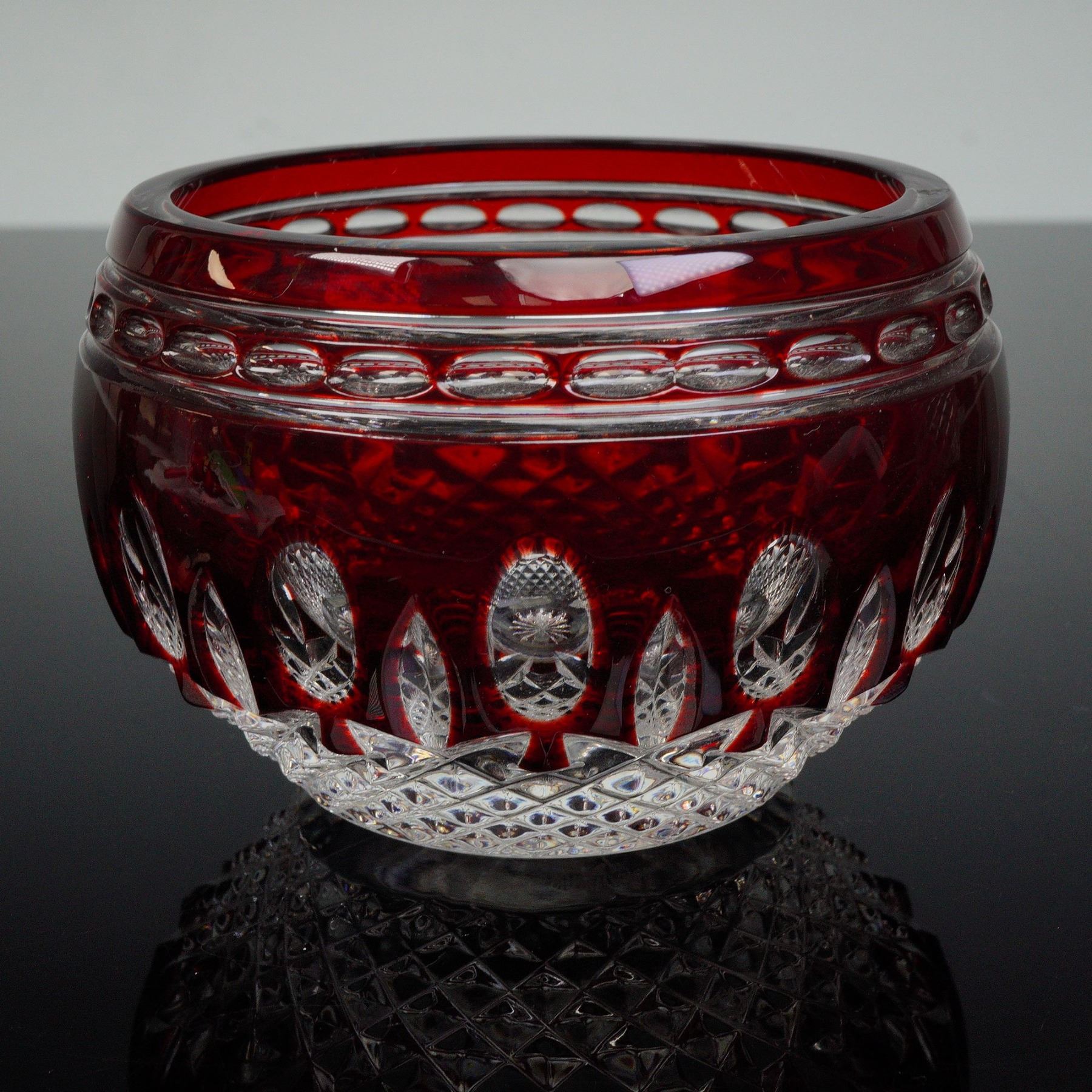 A fine pair of cut crystal pieces including a Waterford crystal ruby-to-clear cut bowl and a clear crystal dresser box. The Waterford bowl features brilliant diamond and fan cuts with oval hobstars and a rich cranberry overlay, finished with the Waterford acid-etched mark to the base. It presents beautifully with sharp detail and striking color contrast. The companion piece is a heavy clear cut crystal lidded dresser box with a diamond pattern and brass-mounted hinged lid, exhibiting exceptional craftsmanship and weight.