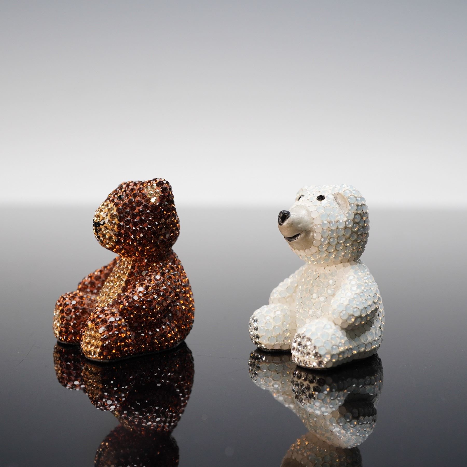 A charming pair of sparkling teddy bear figurines, each fully encrusted with shimmering crystals. One bear features a warm amber-brown tone, while the other is finished in icy white with a cheerful expression. Both display exquisite craftsmanship with intricate faceting that catches the light beautifully. Perfect as decorative accents or collectible display pieces.