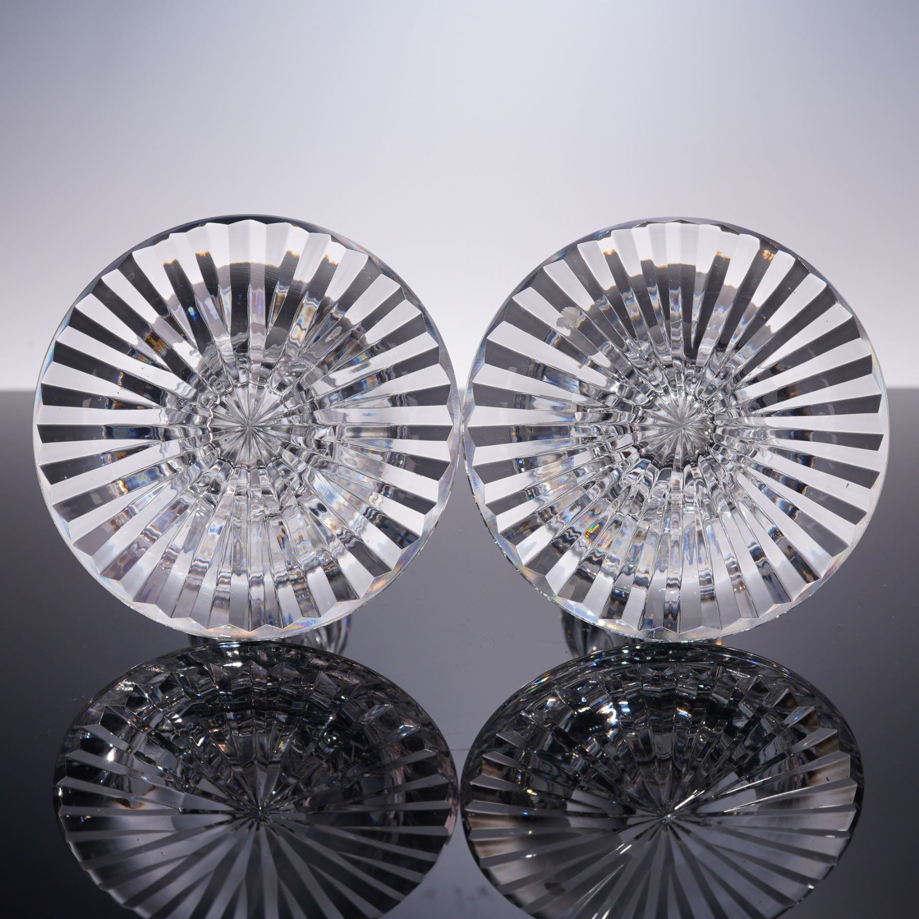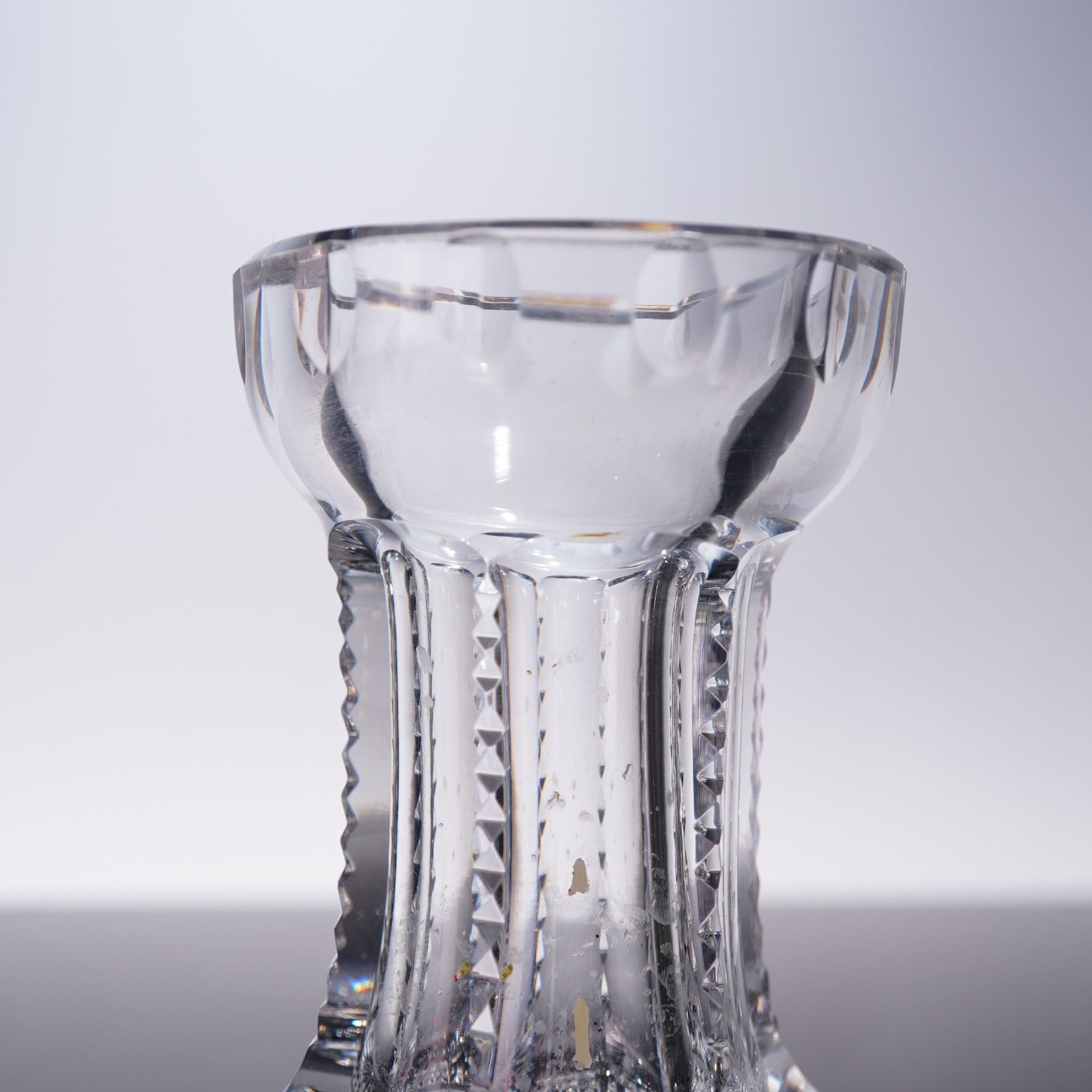 Pair of cut crystal candlesticks featuring flared, scalloped rims and faceted stems with vertical diamond cuts, leading to broad circular bases with striking starburst patterns. The clear crystal catches and reflects the light beautifully, making them an elegant addition to any table or display.