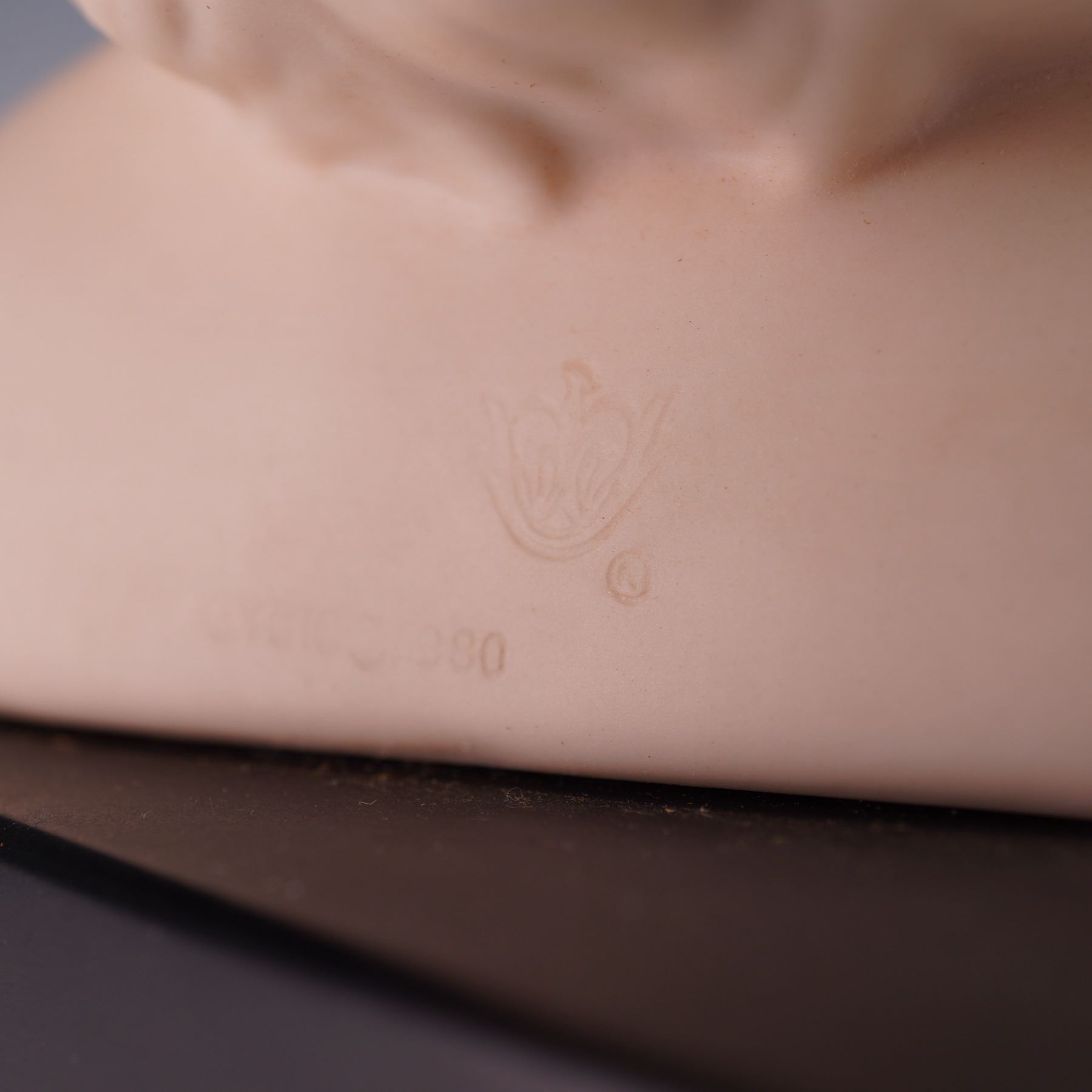 Pair of sculpted busts of children signed Cybis, each modeled in bisque porcelain or ceramic and permanently affixed to square wood bases. These heads are detailed with soft features and delicately painted eyes, one accented with a ribbon and bow. Fixed height from bottom of base to top of head measures 9.75".