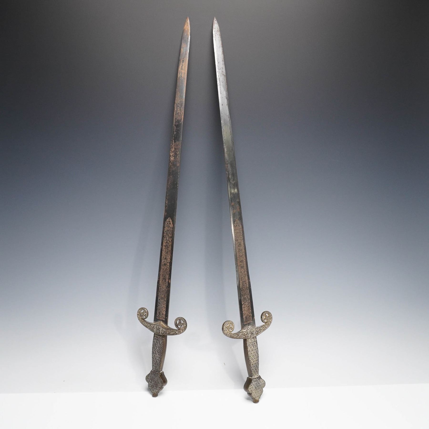 Pair of vintage decorative swords marked "Toledo," featuring detailed etched blades and ornate cast hilts with scroll guards and geometric grip patterns. The blades display classic Spanish motif engravings, including a heraldic shield and floral scrollwork, indicating origins in the historic sword-making city of Toledo, Spain. Each measures 30"L.