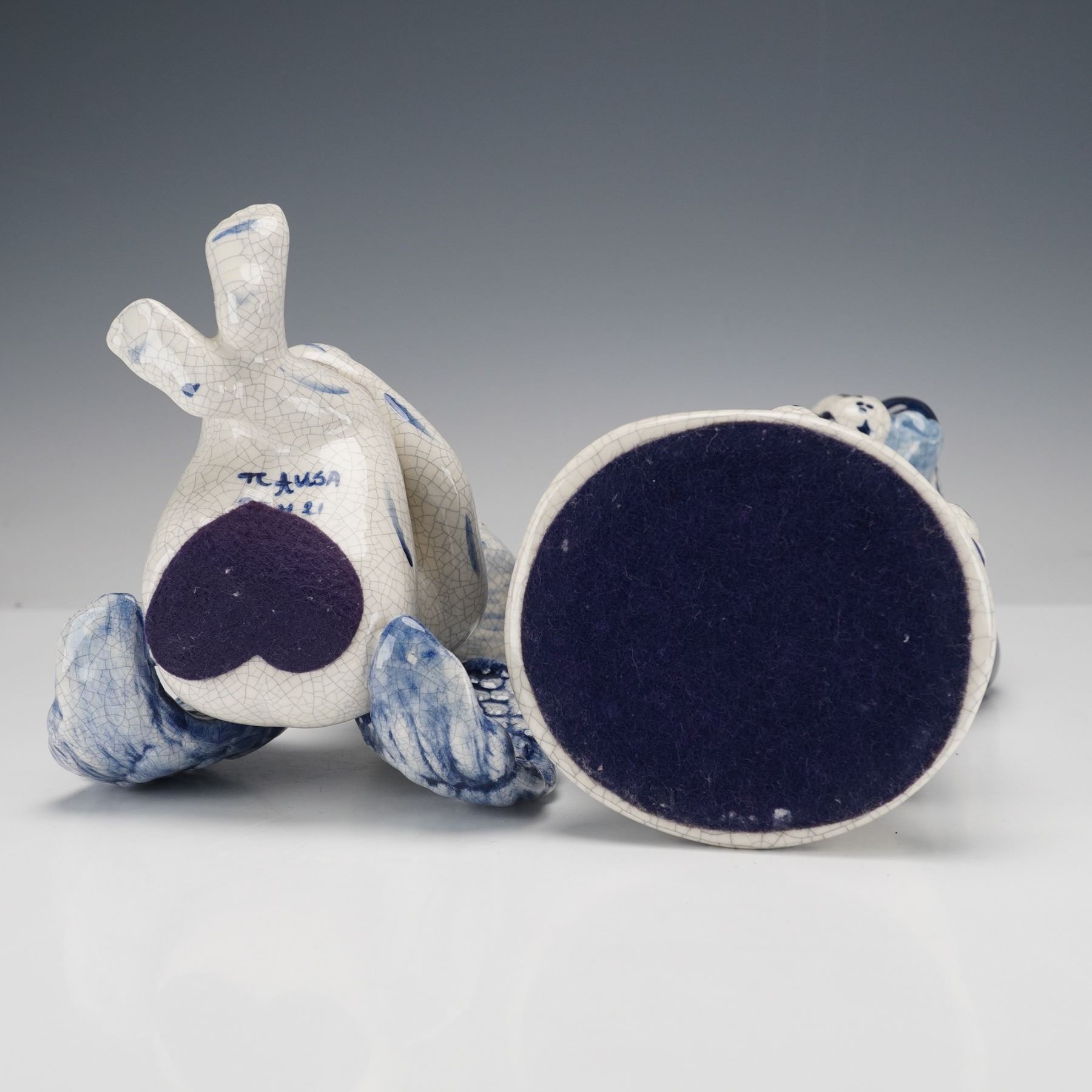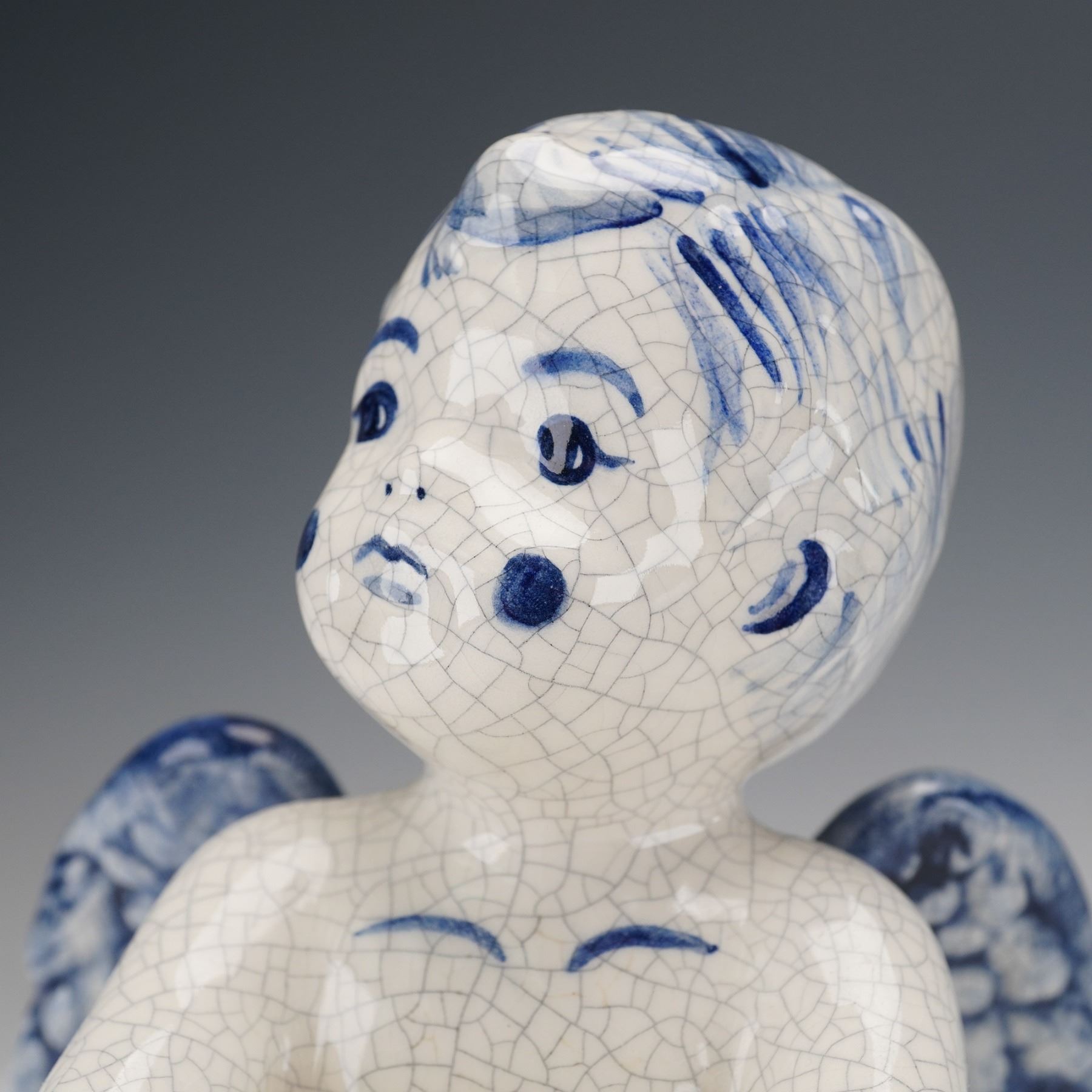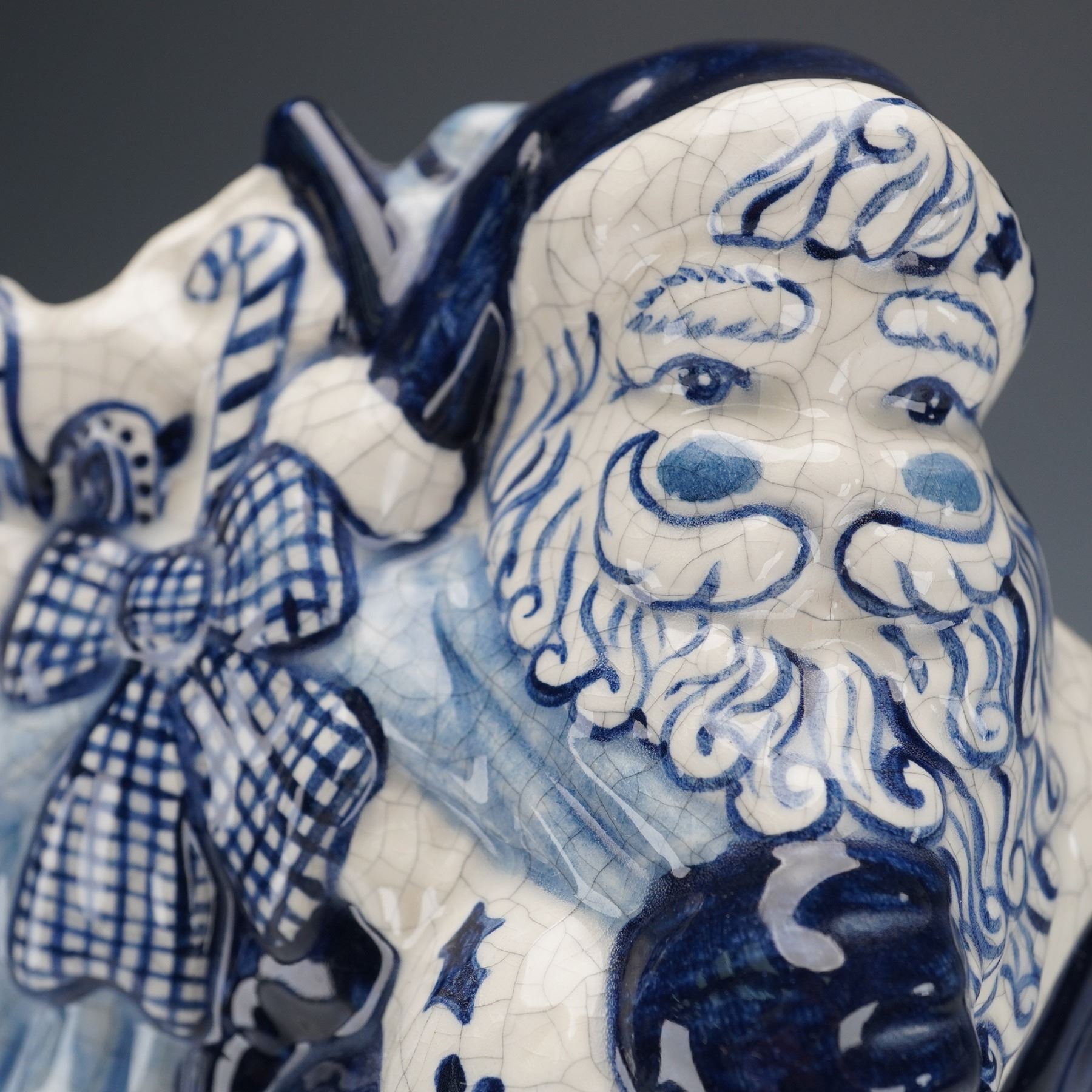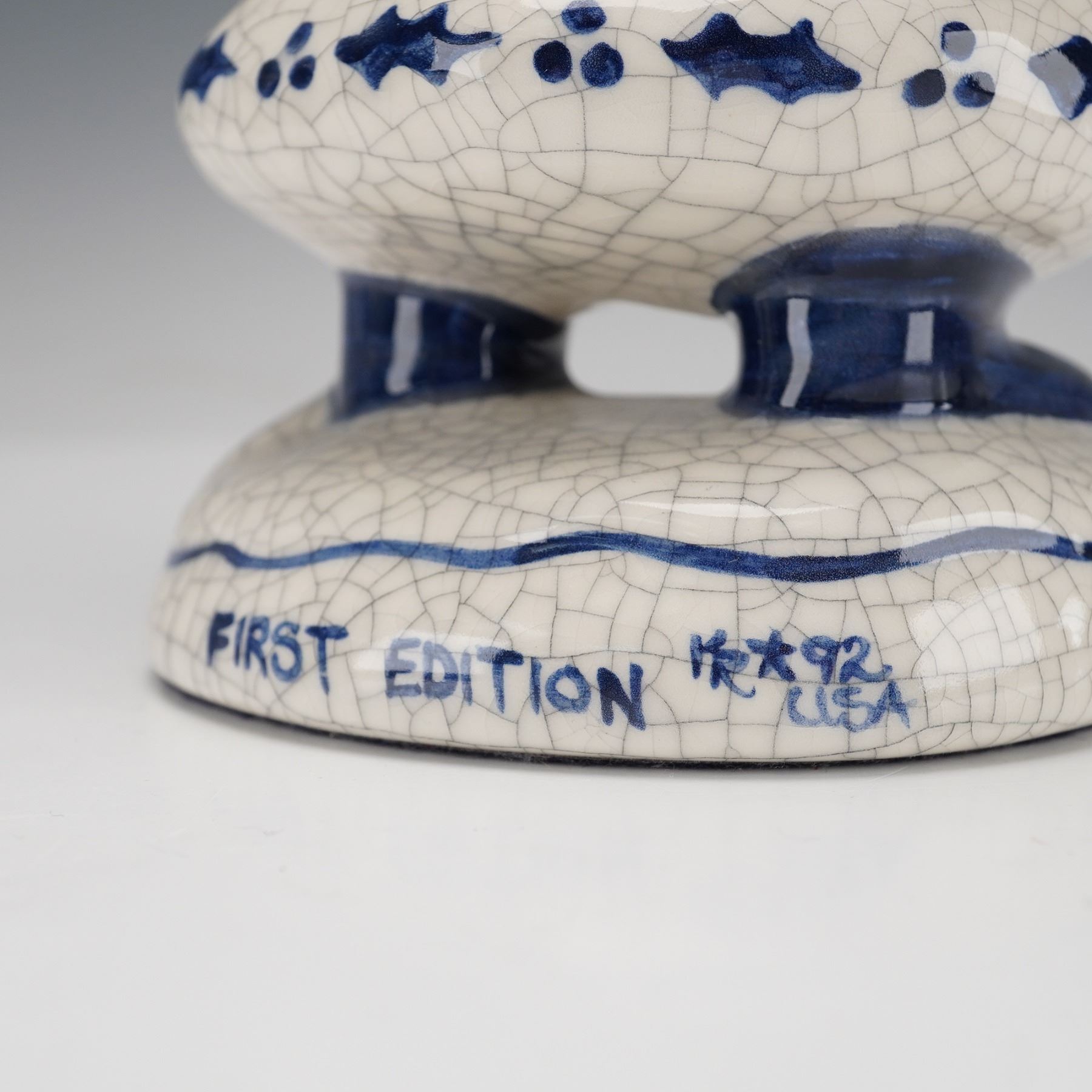 Hand-painted ceramic holiday figurines, including a standing Santa Claus with a sack of toys and a seated angel with folded wings. Each features Dedham's signature blue and white crackle glaze, with fine cobalt detailing and charming folk-inspired expressions. The Santa is marked First Edition and both pieces are signed USA with edition numbers.
