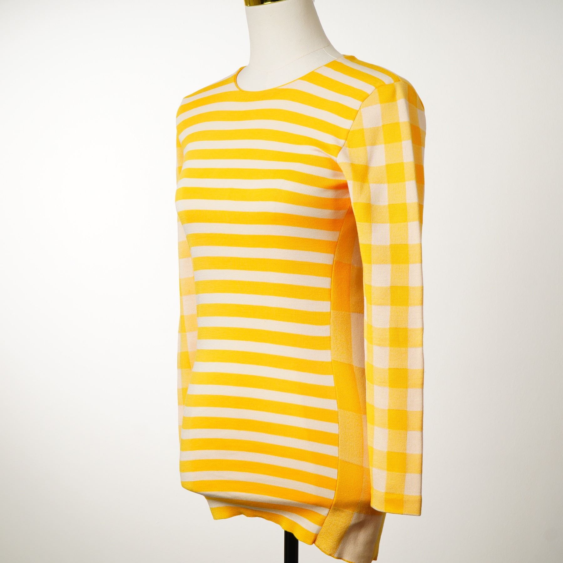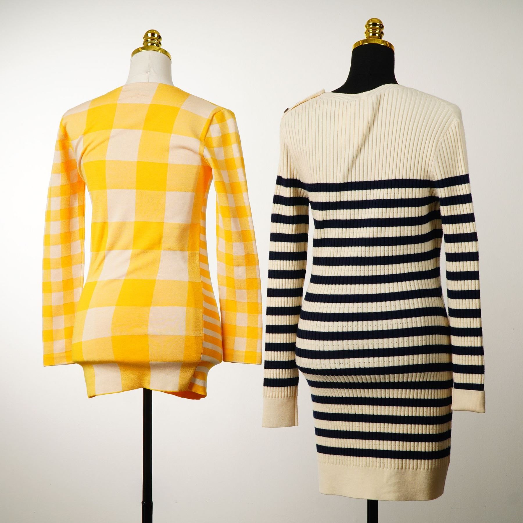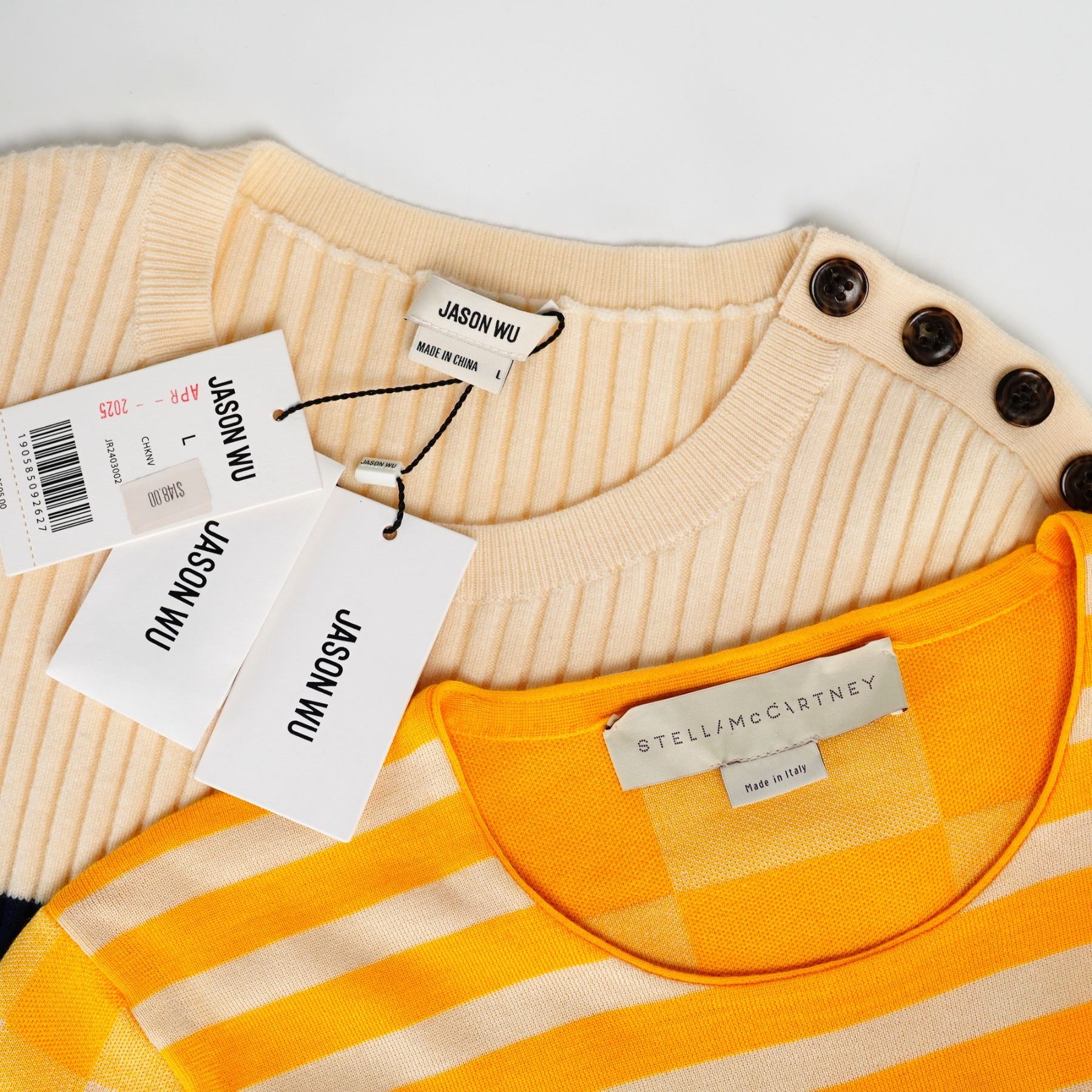 This collection of contemporary designer clothing features pieces from several prominent fashion houses. Included is a Stella McCartney sweater dress in size 40, featuring yellow and white horizontal stripes on the front panel and a large-scale gingham check pattern on the back and sleeves. The interior neck label identifies the maker as Stella McCartney and indicates the garment was made in Italy. Also present is a Jason Wu striped merino wool knit sweaterdress in size Large. This garment features navy blue horizontal stripes on a cream-colored ribbed ground, accented with four large dark brown decorative buttons on the left shoulder.