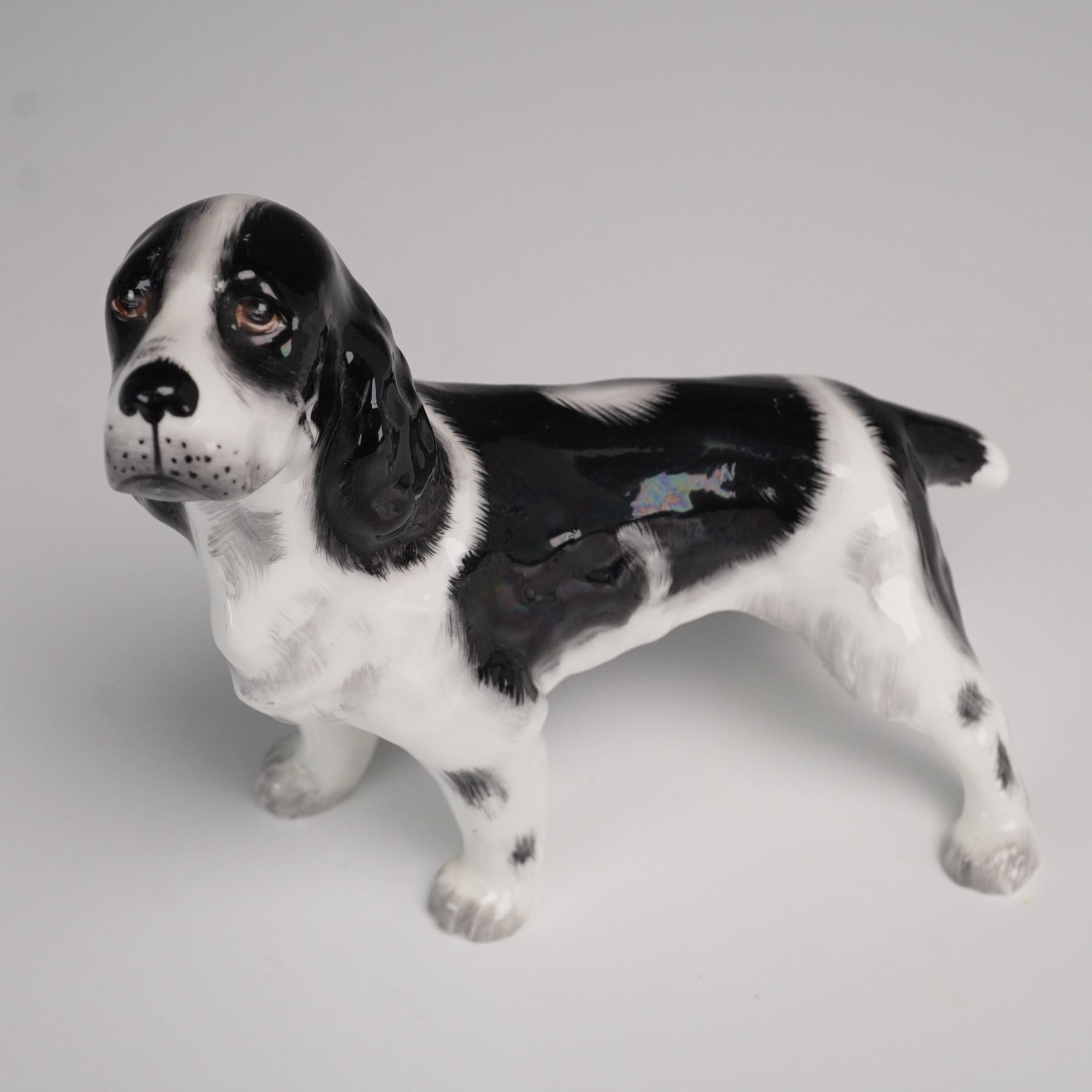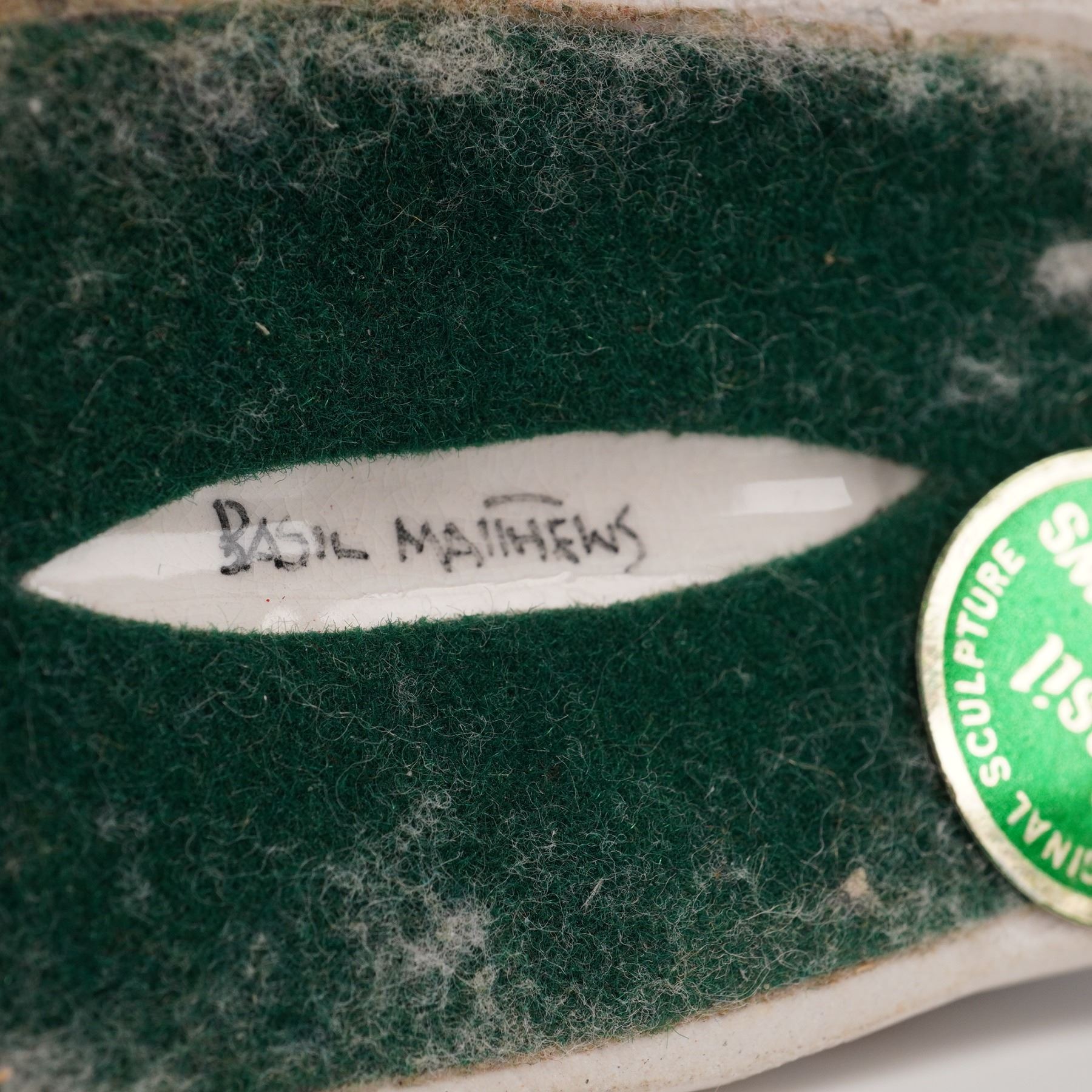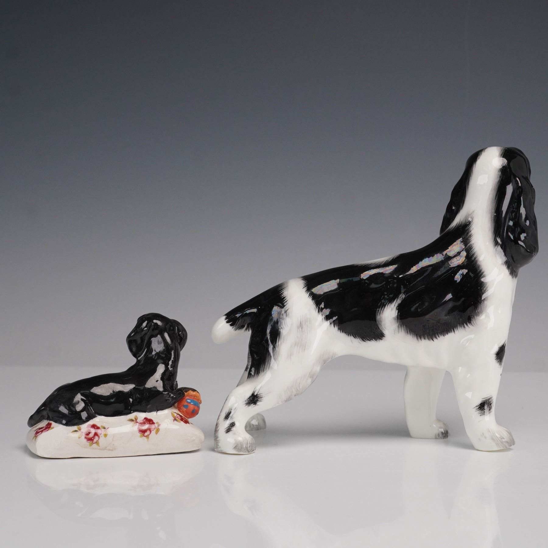 A group of two English porcelain and bone china dog figurines including a black and white spaniel marked Alton England and a smaller black dachshund marked Basil Matthews with original green foil label and inscribed signature to the underside. Both pieces are rendered in glossy glaze and showcase fine hand-painted detailing. The Basil Matthews figure rests on a floral-decorated plinth and features a whimsical expression typical of the artist's style.