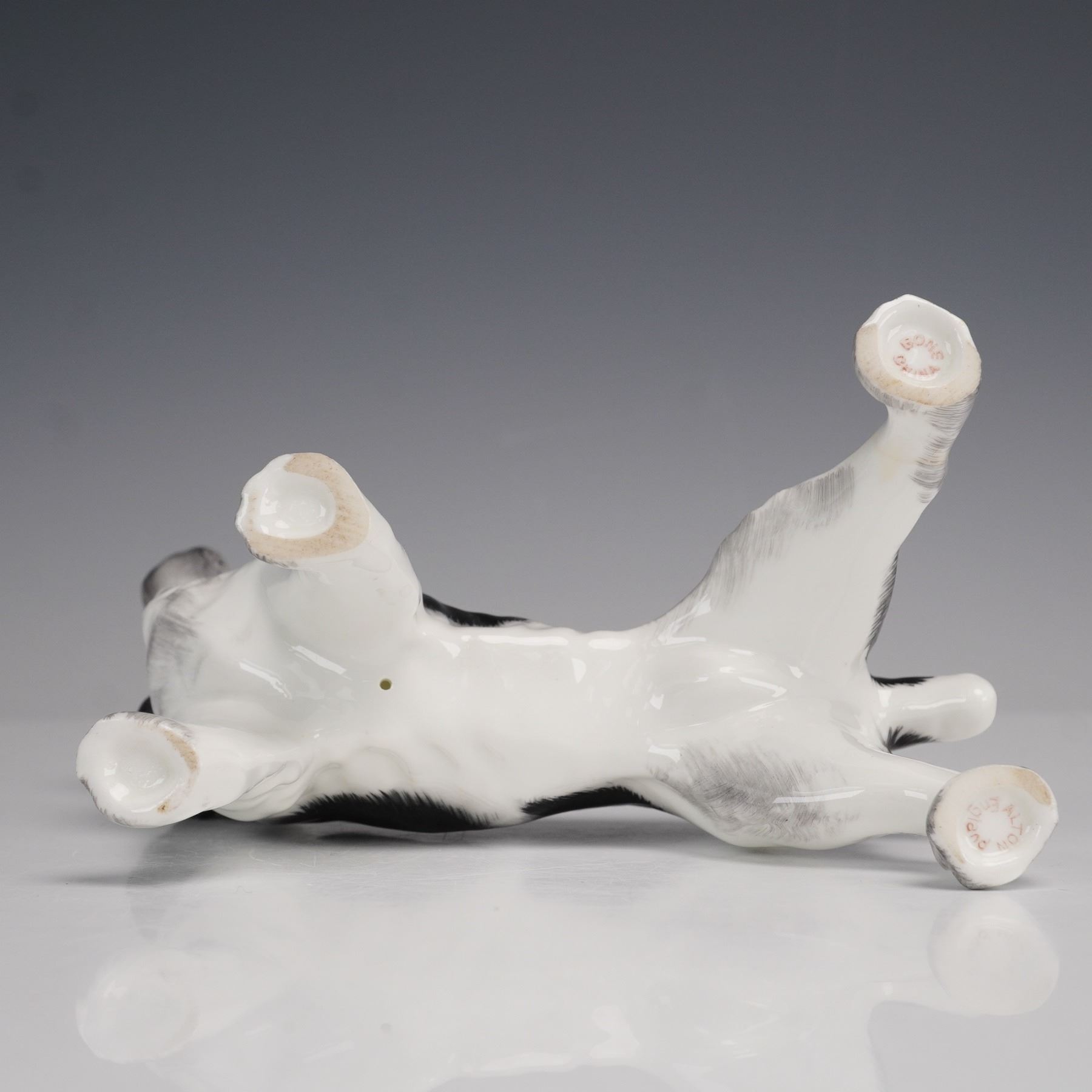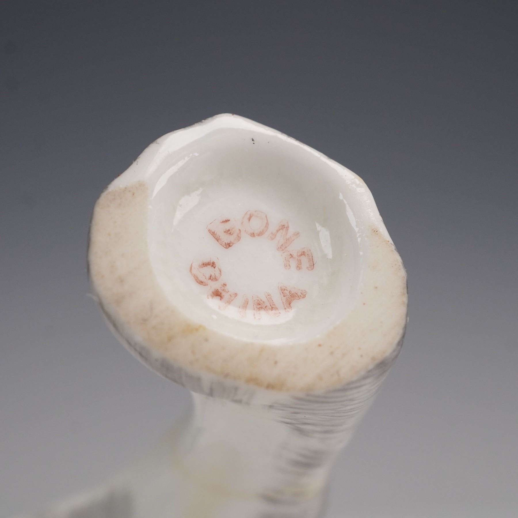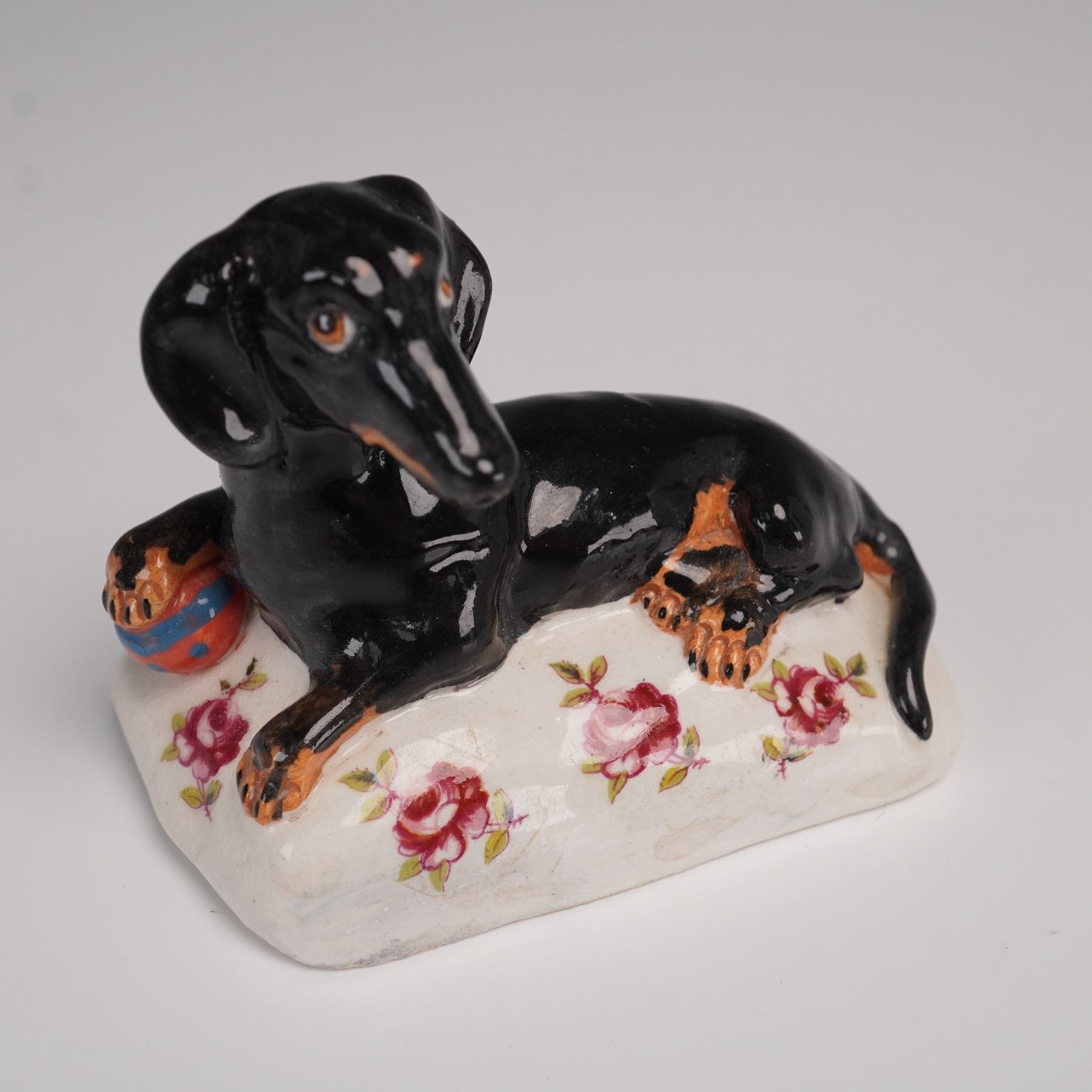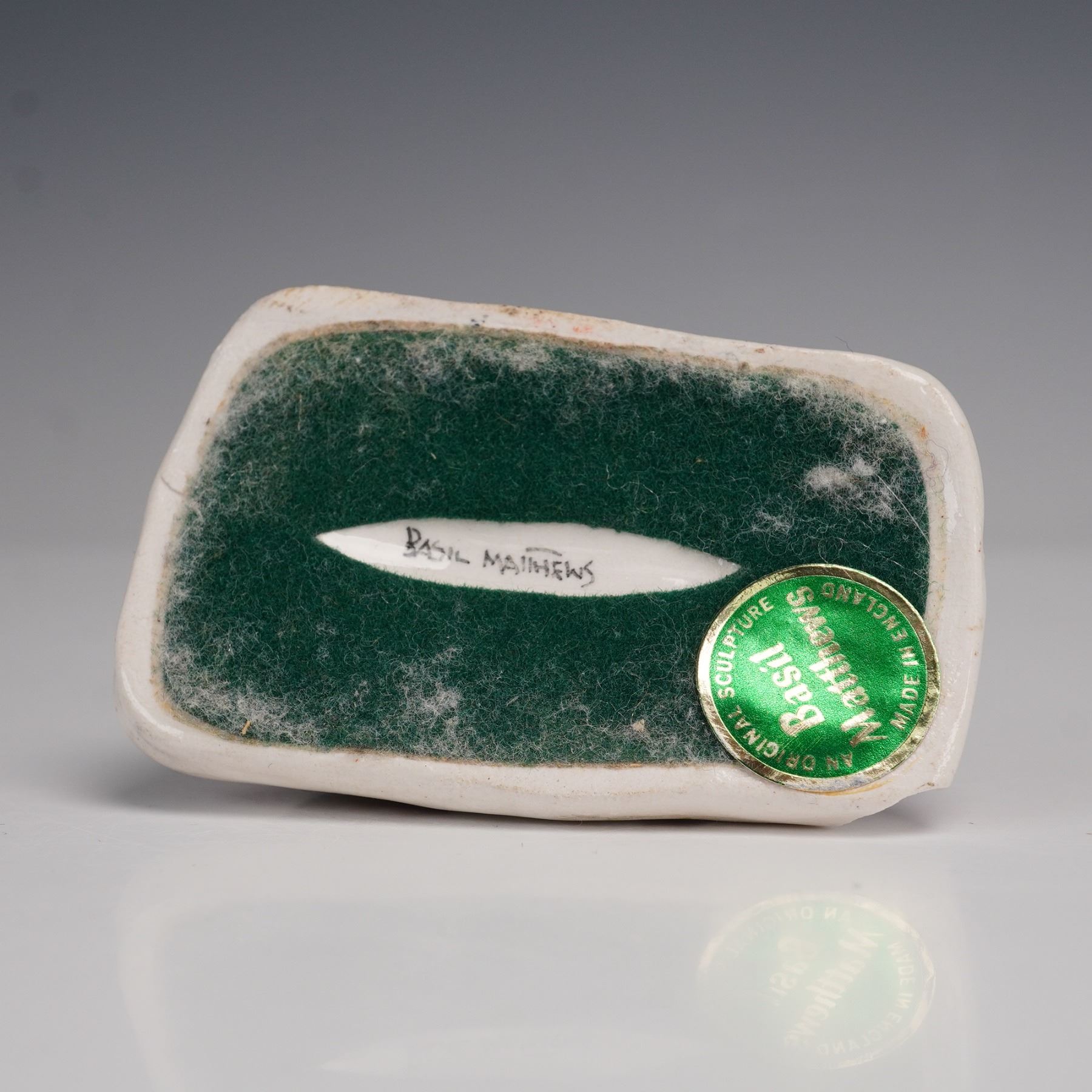 A group of two English porcelain and bone china dog figurines including a black and white spaniel marked Alton England and a smaller black dachshund marked Basil Matthews with original green foil label and inscribed signature to the underside. Both pieces are rendered in glossy glaze and showcase fine hand-painted detailing. The Basil Matthews figure rests on a floral-decorated plinth and features a whimsical expression typical of the artist's style.