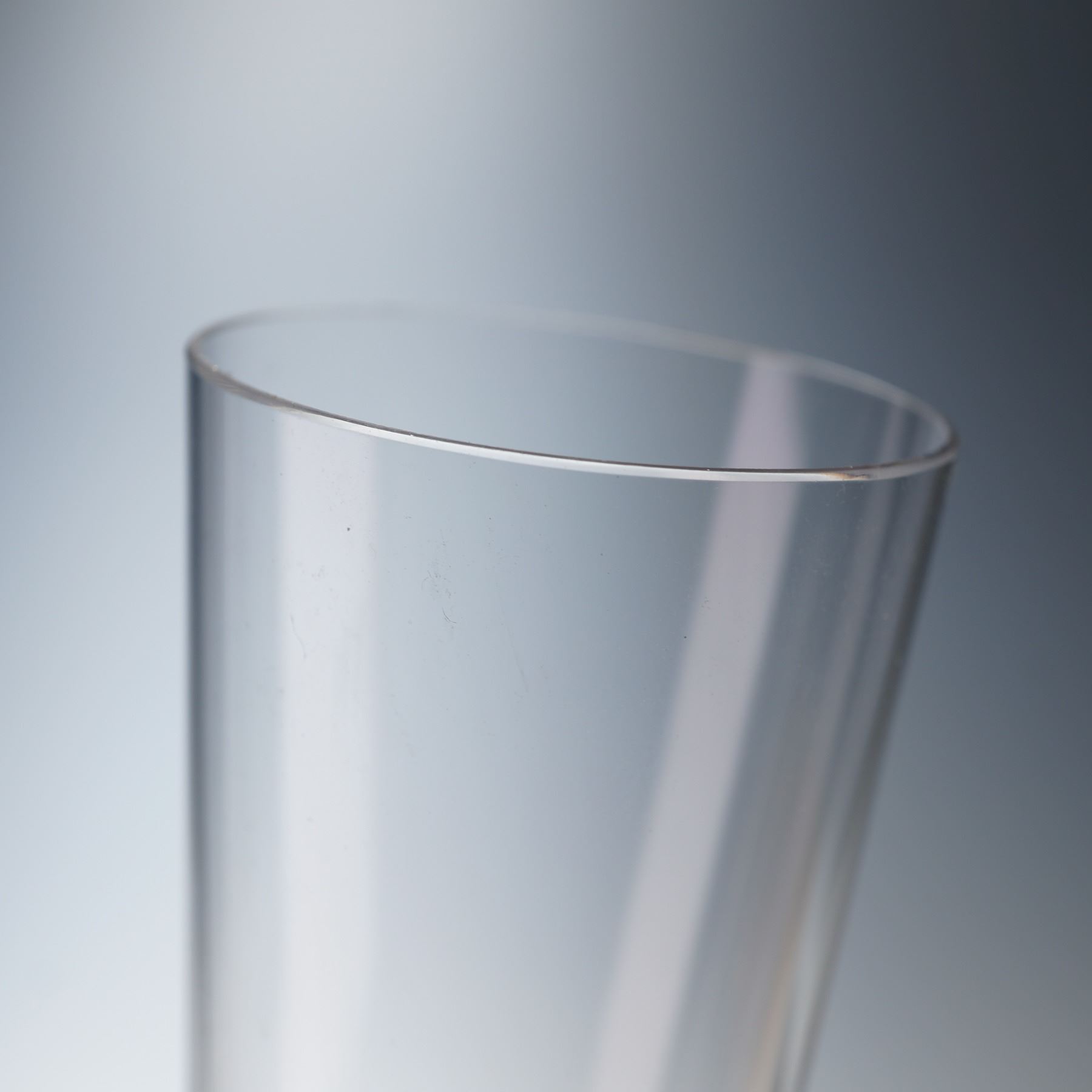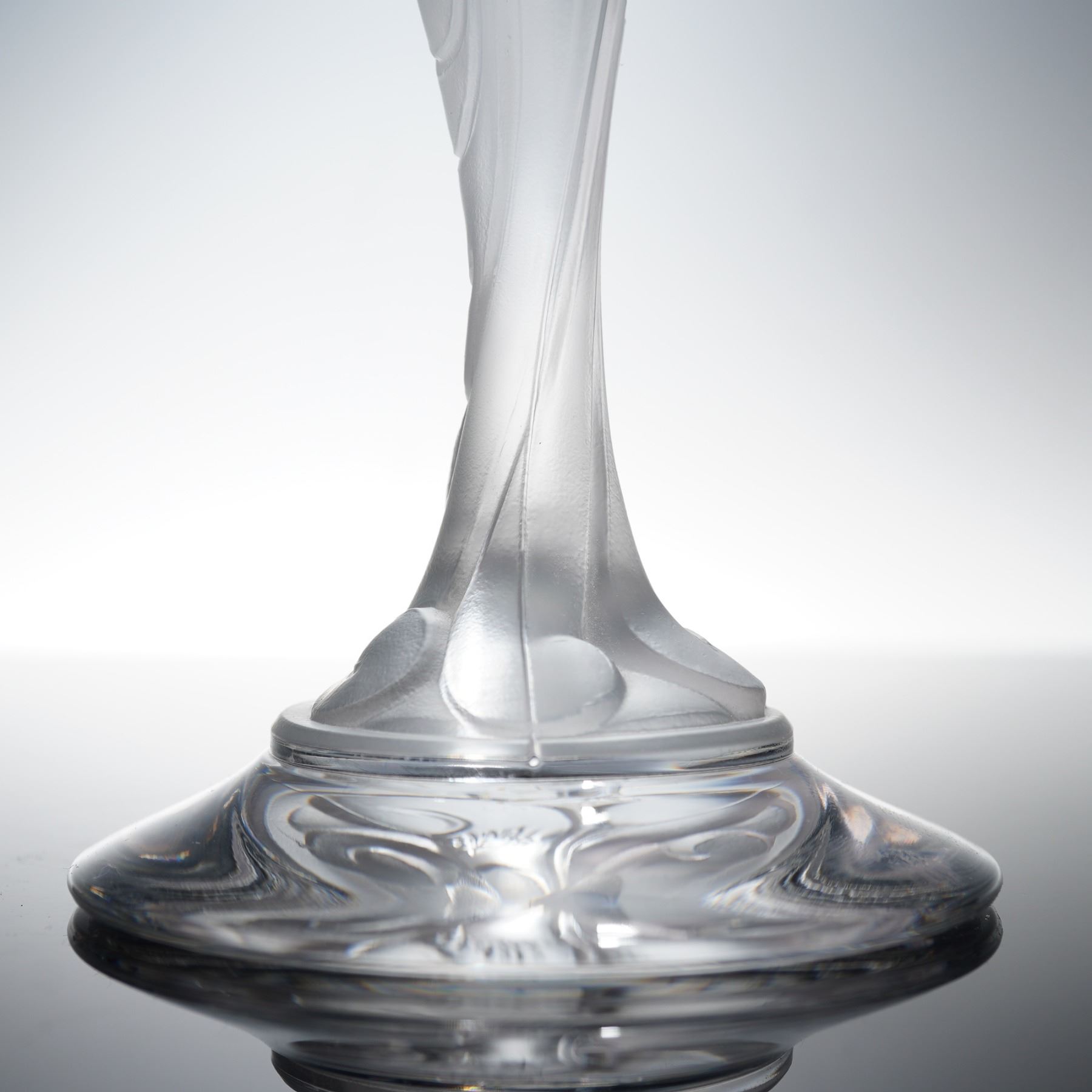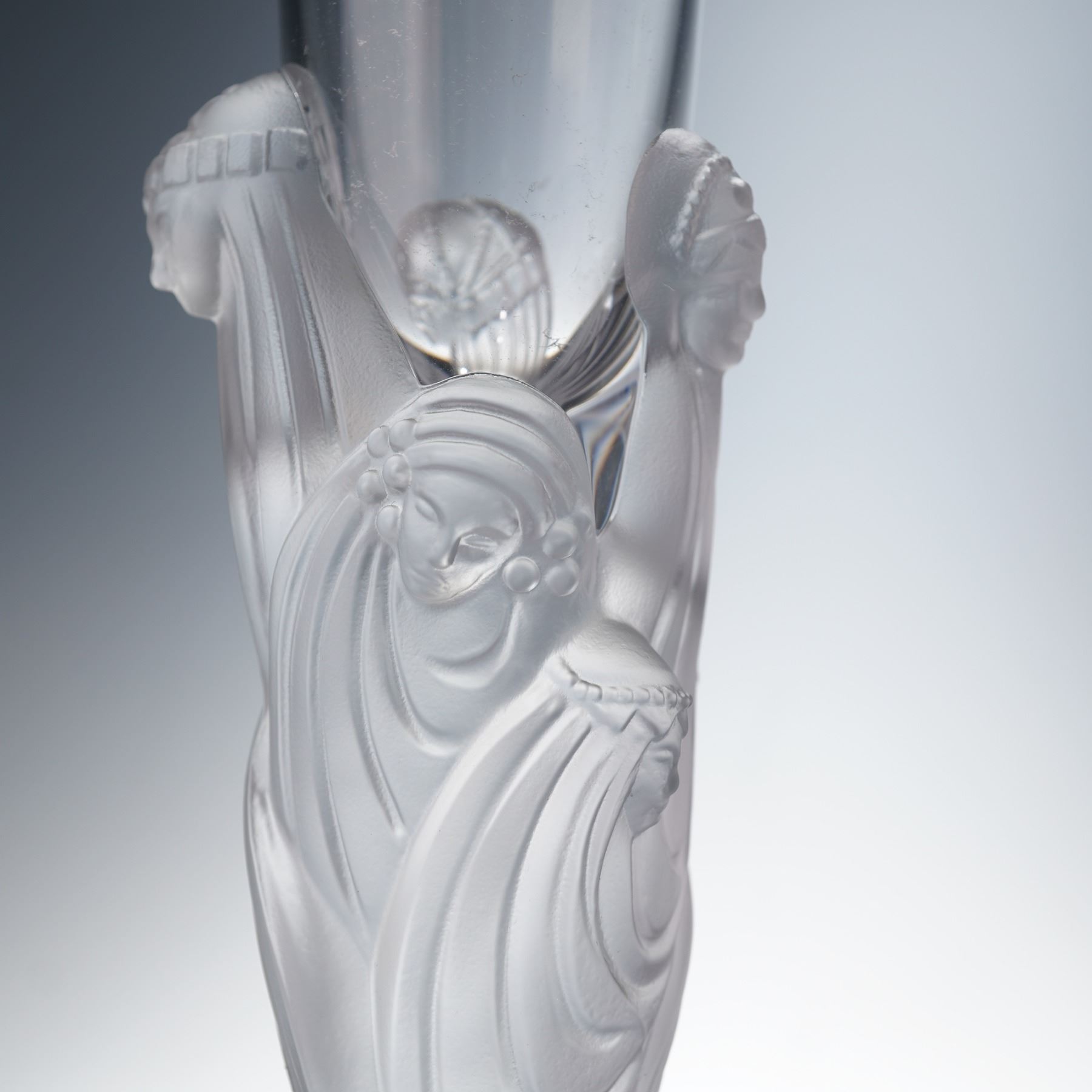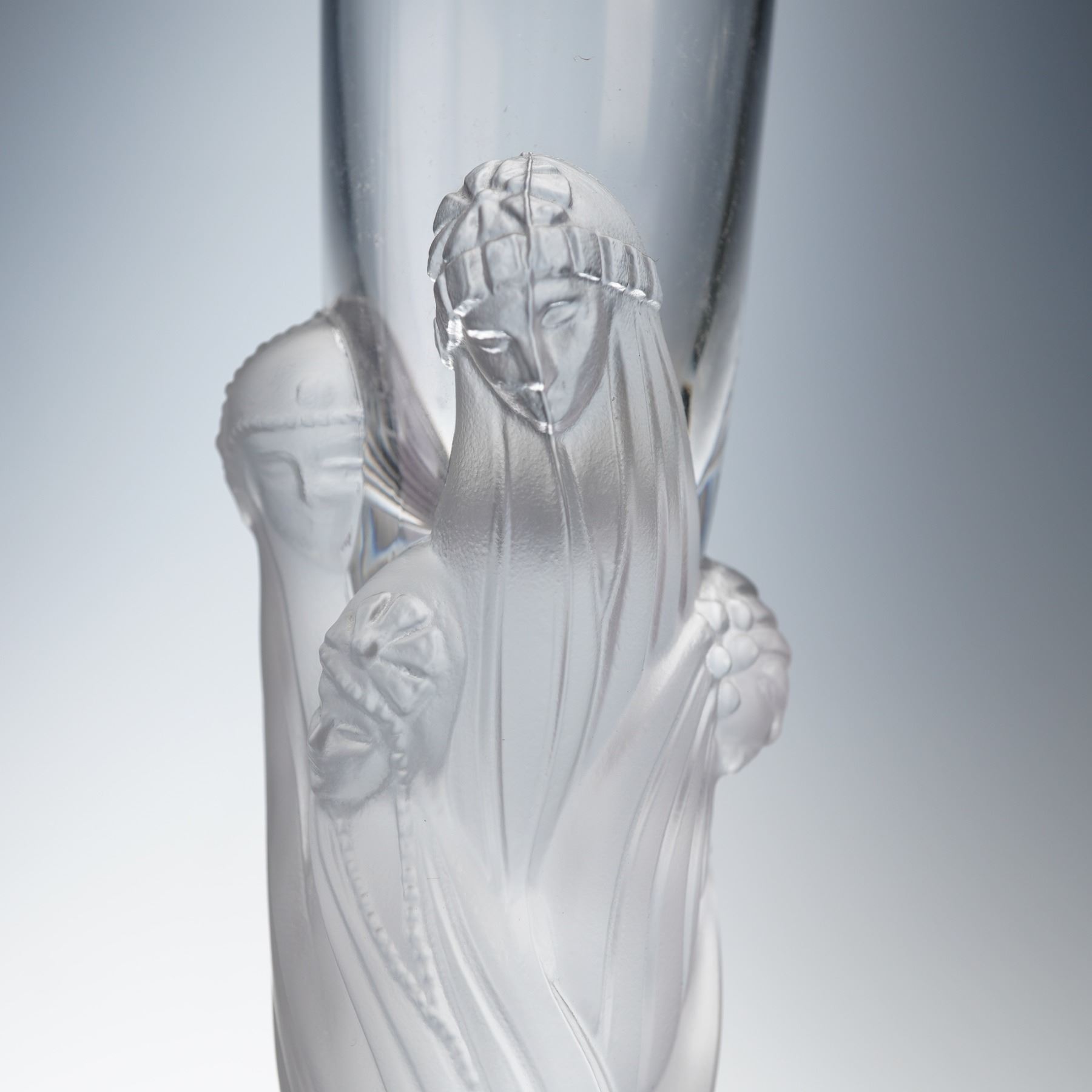 Limited edition crystal champagne flutes designed by Erte (Romain de Tirtoff) for French production. Each glass features frosted and clear crystal decoration depicting elegant Art Deco female figures in flowing drapery, embodying Erte's signature stylized form and refinement. The set includes two sizes, approximately 10 inches and 12 inches in height. Both pieces are signed Erte France to the base.