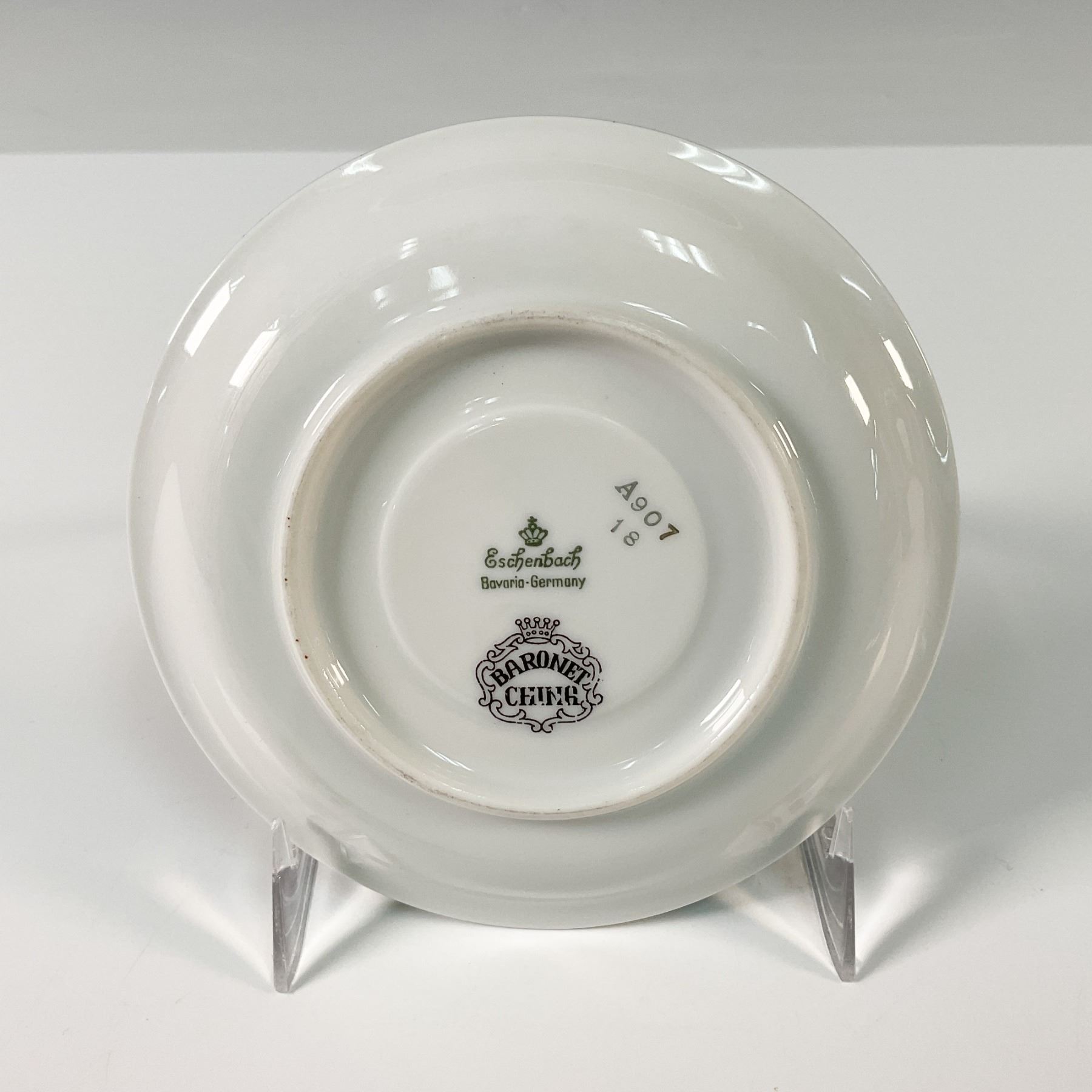 Refined porcelain tea cup and saucer set by Eschenbach Bavaria, marked Baronet China. This elegant set features a rich dark teal green exterior contrasted with a crisp white interior, adorned with delicate gold trim along the rim, base, and handle. A subtle floral motif decorates the interior of the cup, adding a touch of charm. Eschenbach backstamps. Cup: 2.25"H. Saucer: 0.5"H.