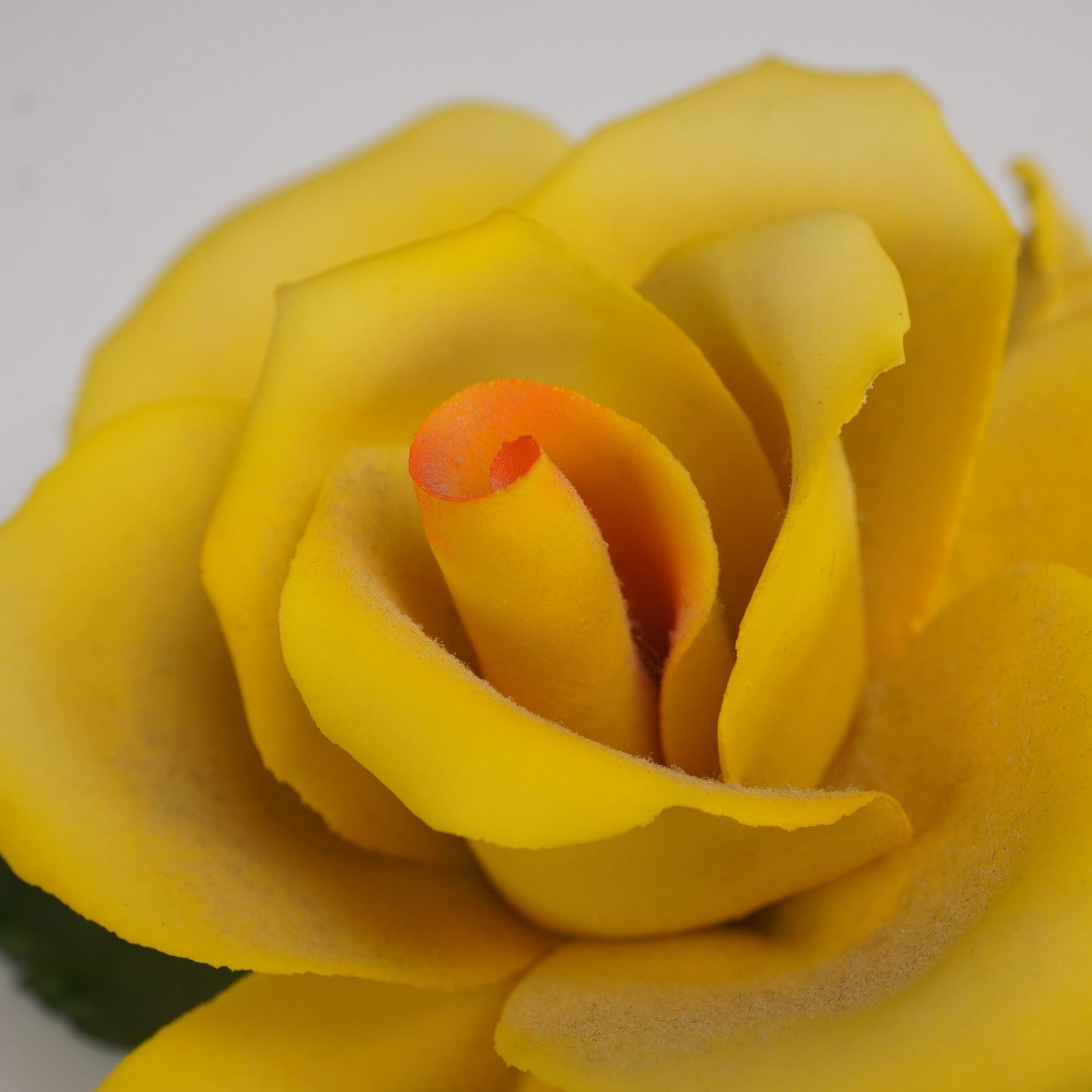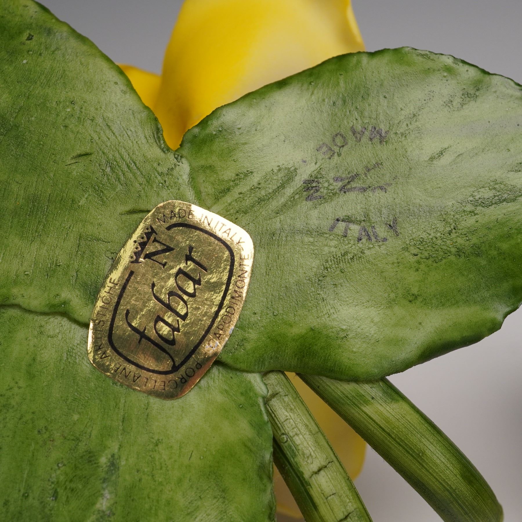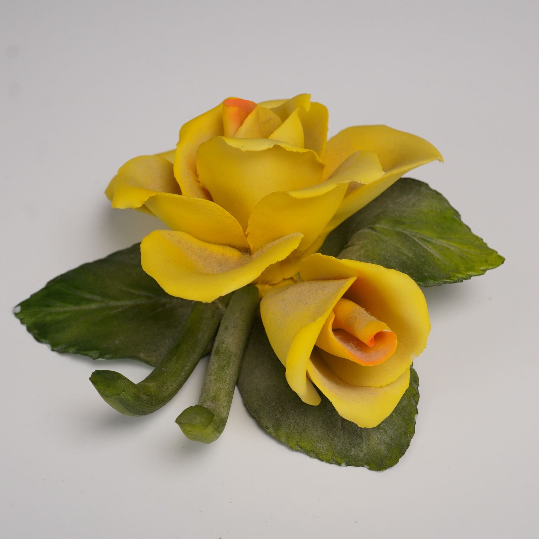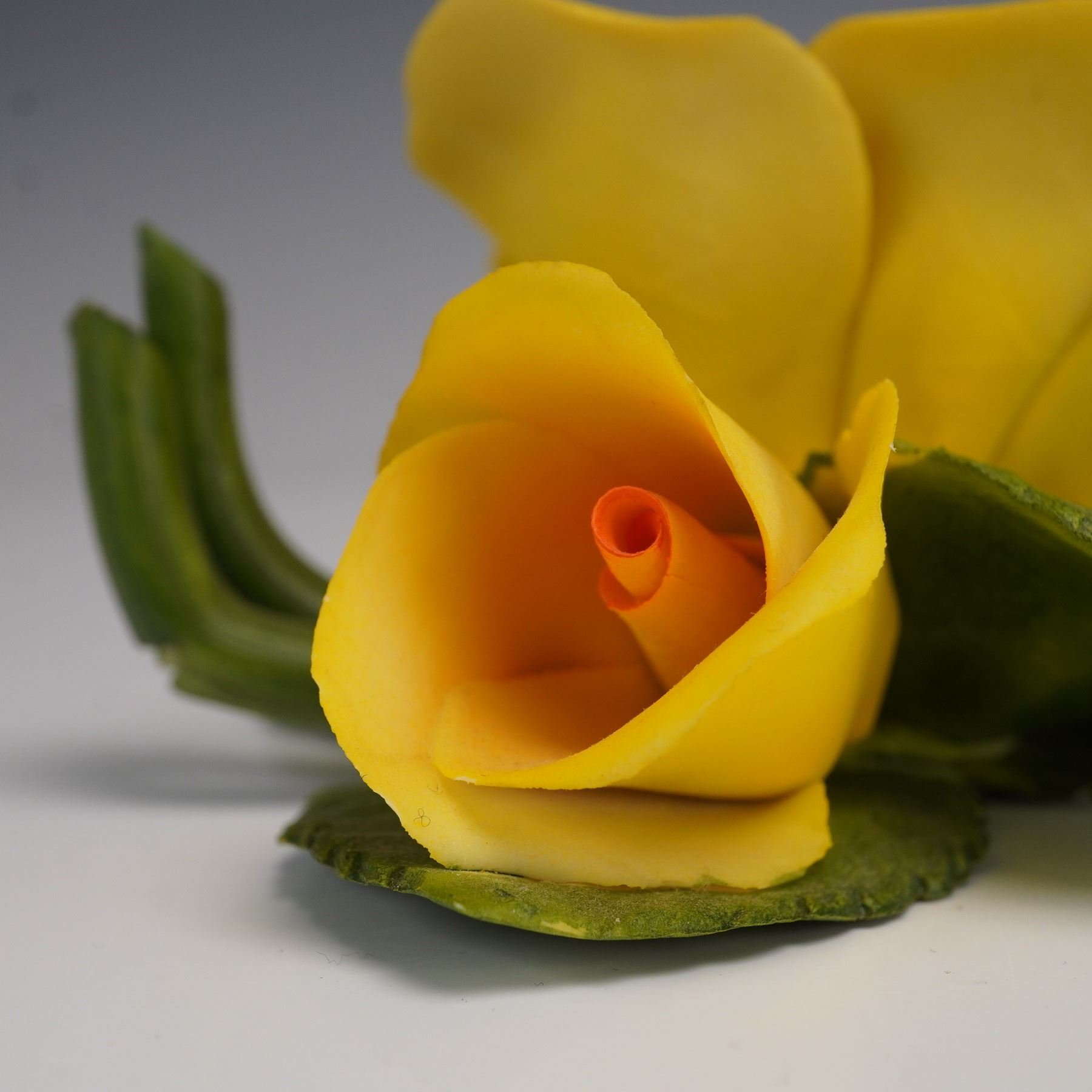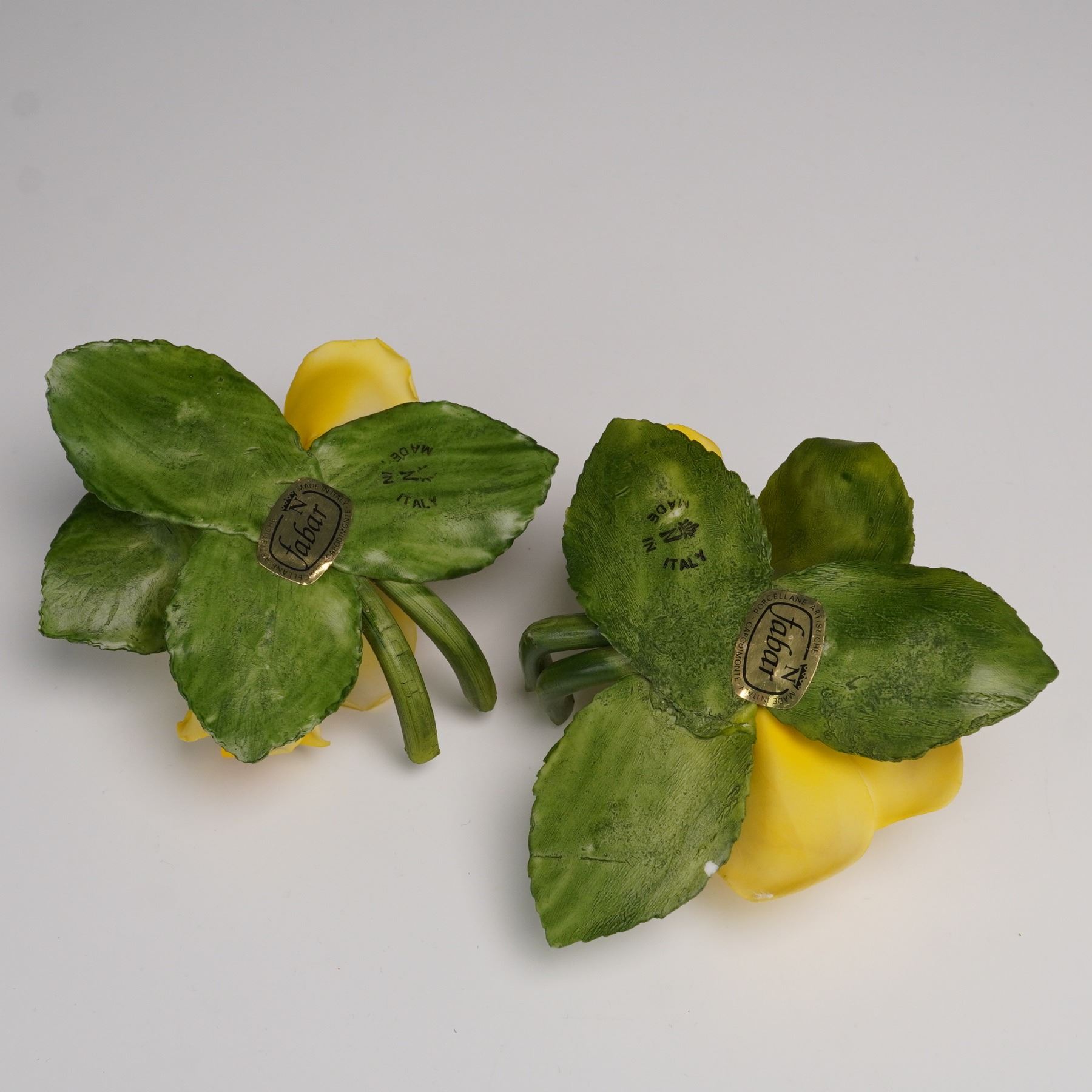 A pair of Italian Capodimonte porcelain yellow rose floral sculptures by Fabar. Each figural bloom is hand-molded and painted in vibrant yellow with green foliage, featuring realistic veining and petal form. Both bear impressed Capodimonte marks and retain original Fabar foil labels reading Made in Italy.