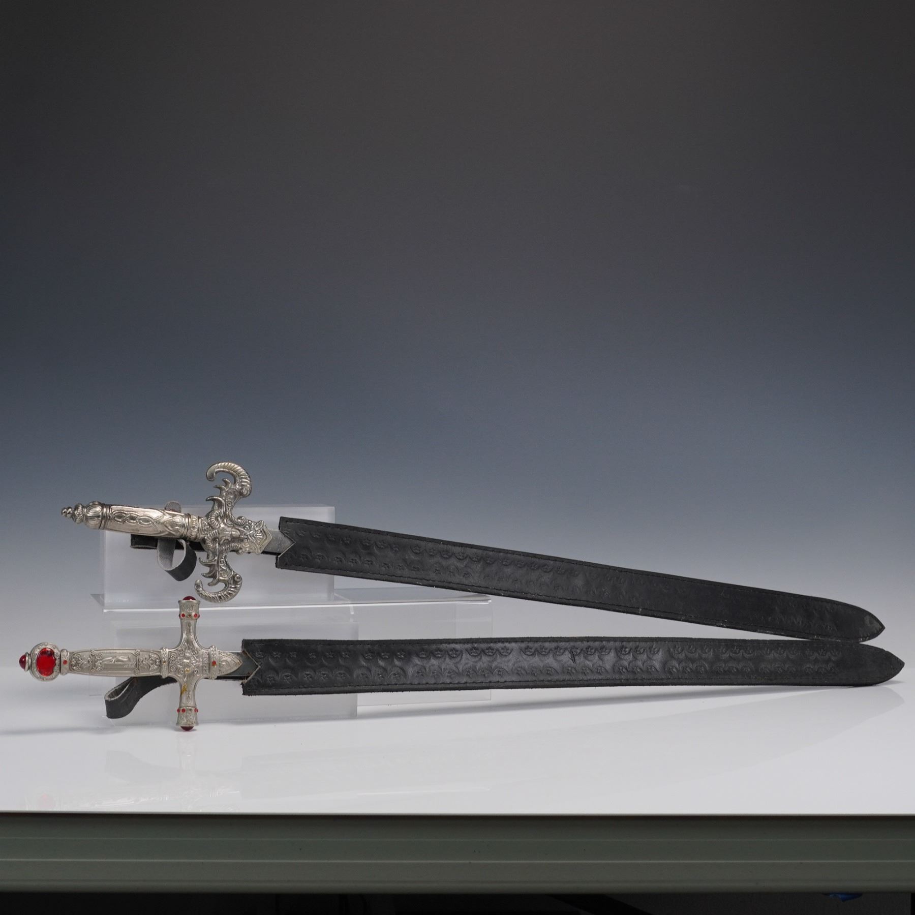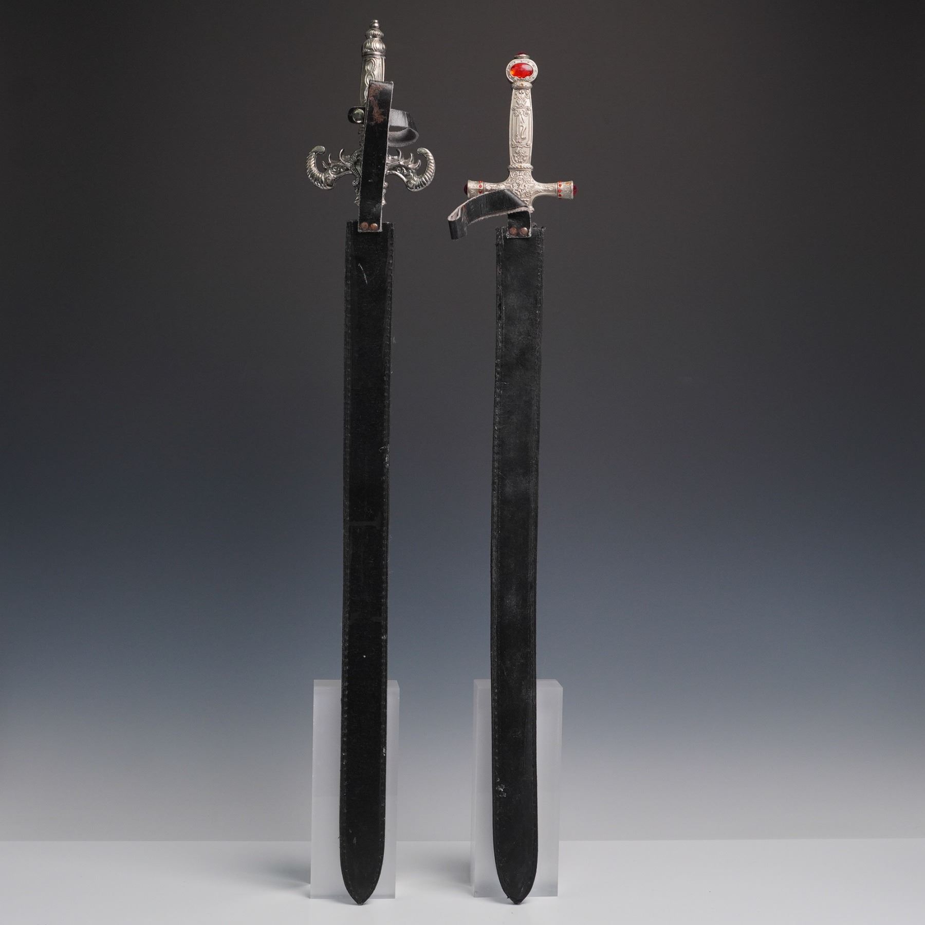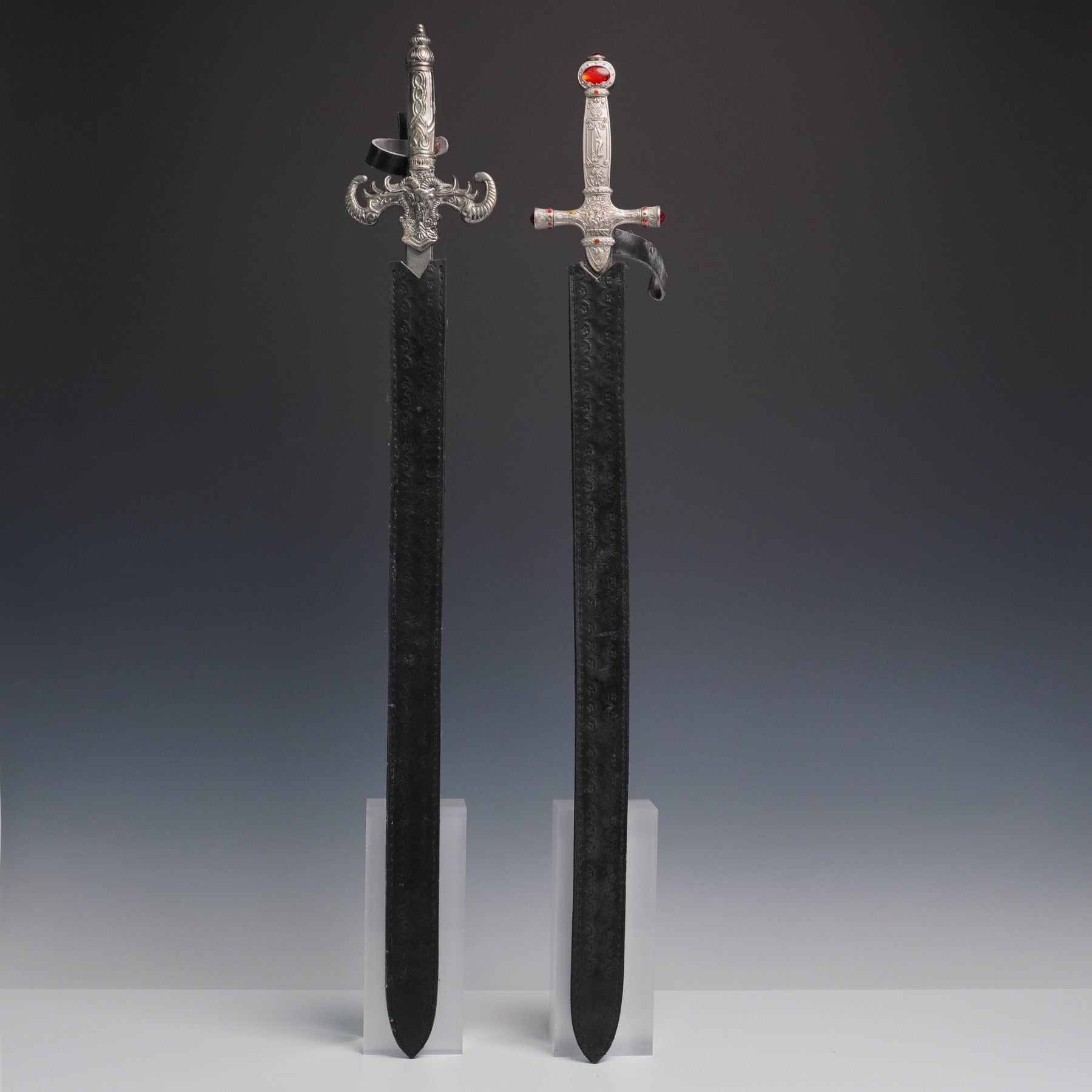Pair of decorative fantasy swords featuring cast metal hilts with intricate detailing and stainless blades. One sword includes a sculpted ram-headed guard and decorative pommel, while the other is adorned with raised medieval motifs and inset red faux gems at the guard and pommel. Both blades are straight and narrow with rounded tips, suited for display. Each sword includes a fitted faux leather sheath with embossed designs for presentation or storage.
