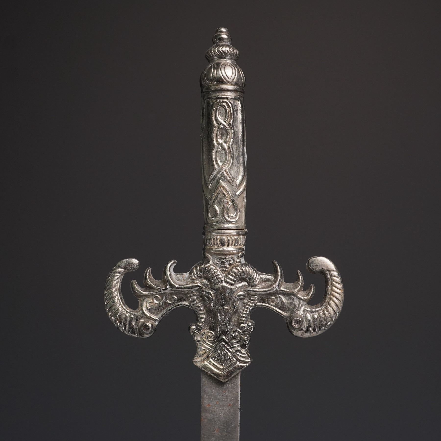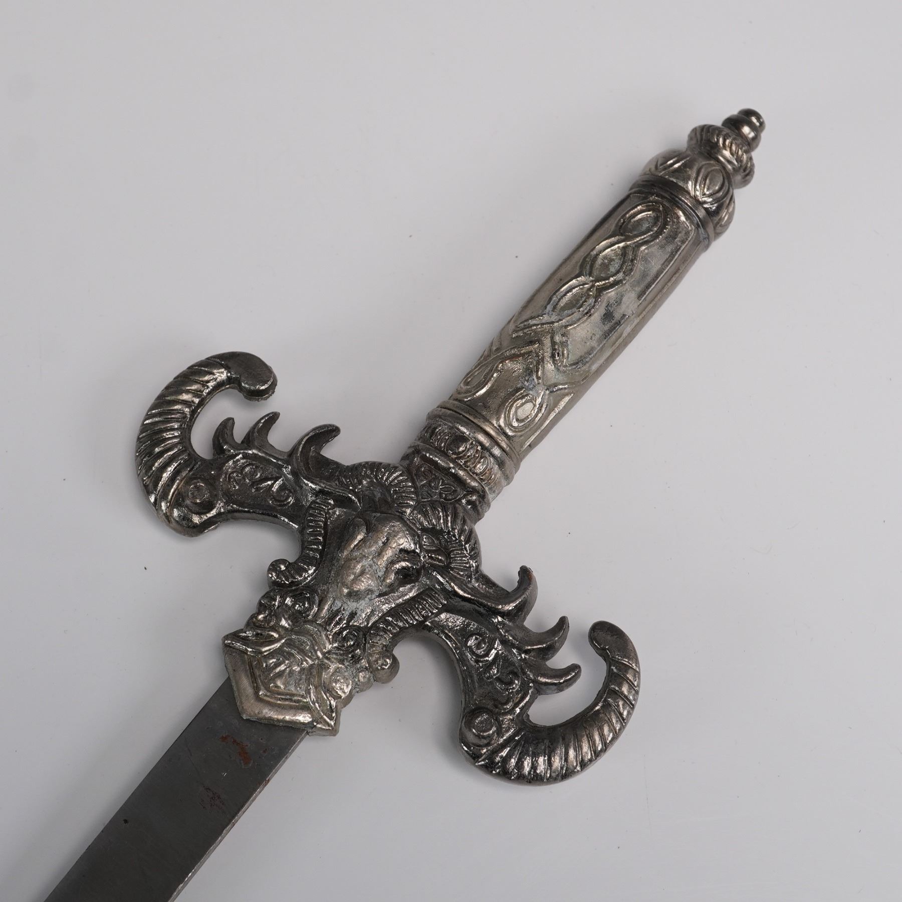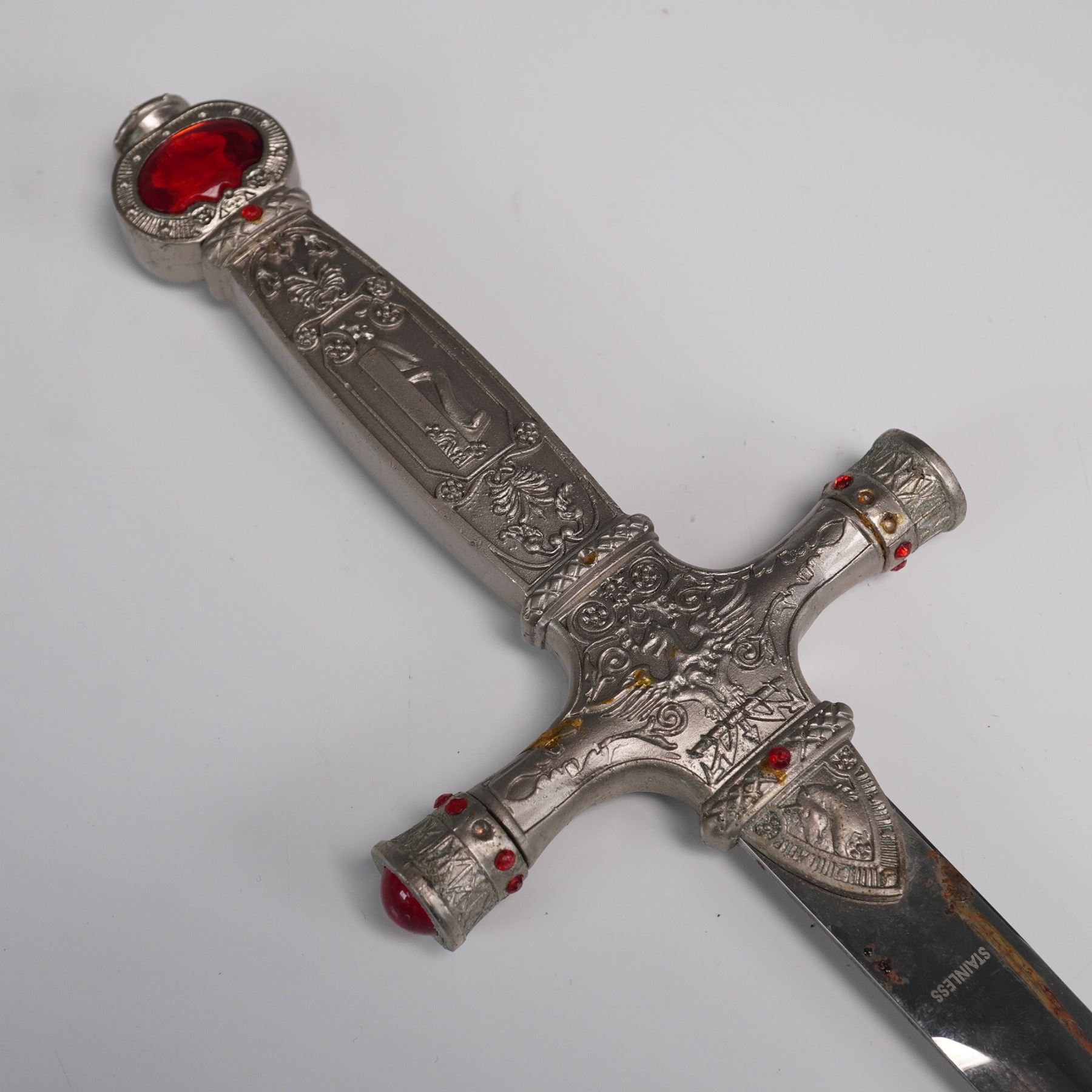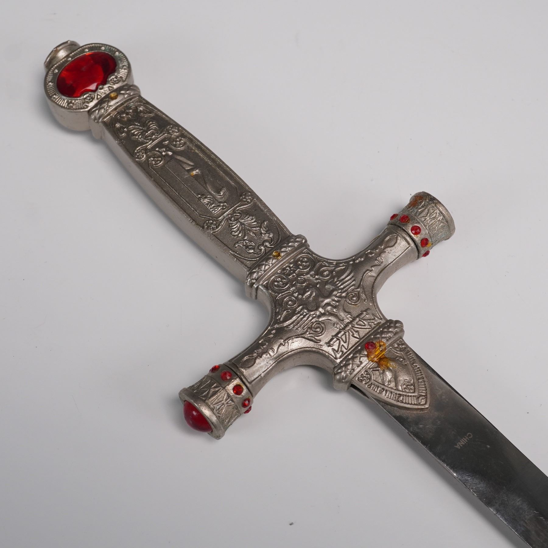 Pair of decorative fantasy swords featuring cast metal hilts with intricate detailing and stainless blades. One sword includes a sculpted ram-headed guard and decorative pommel, while the other is adorned with raised medieval motifs and inset red faux gems at the guard and pommel. Both blades are straight and narrow with rounded tips, suited for display. Each sword includes a fitted faux leather sheath with embossed designs for presentation or storage.