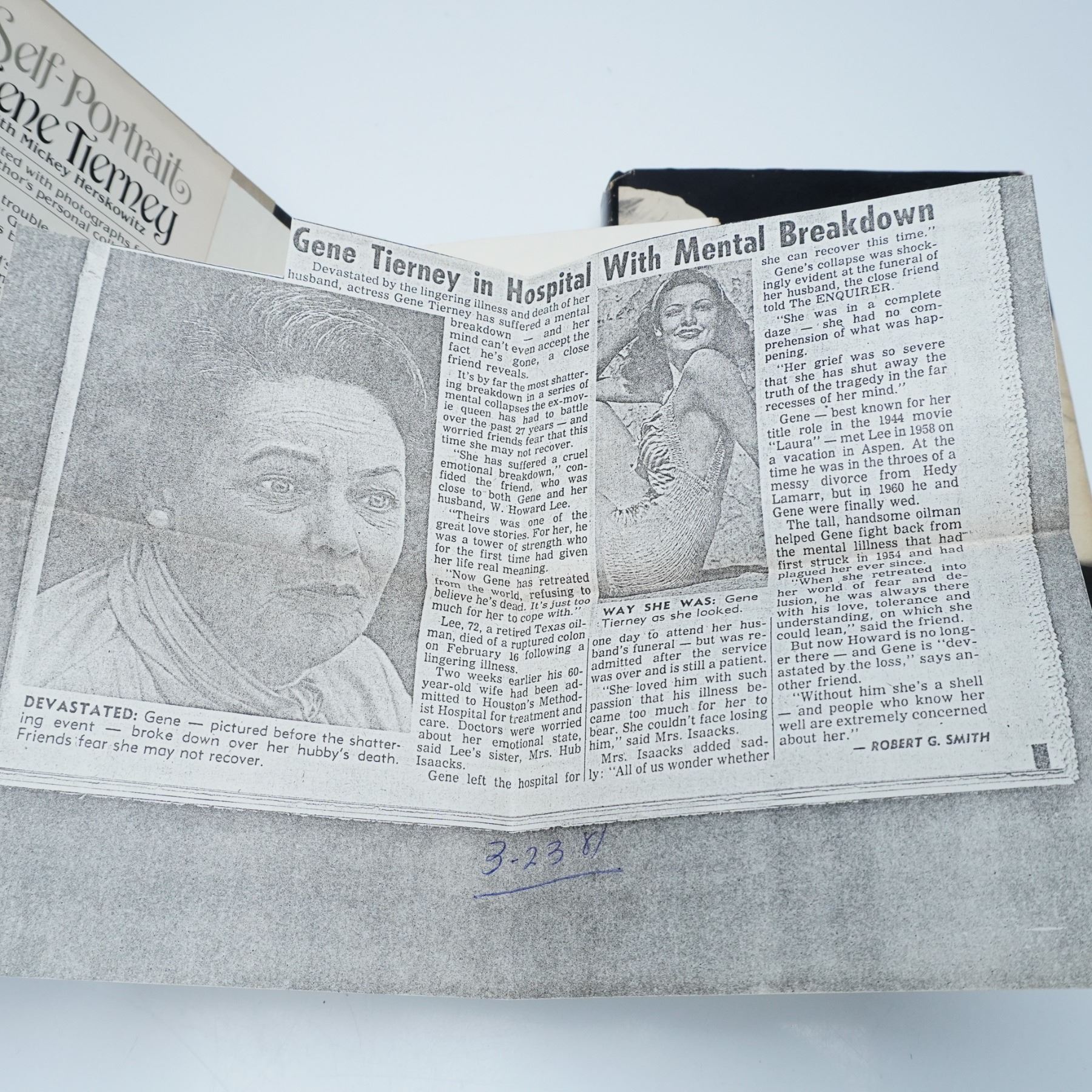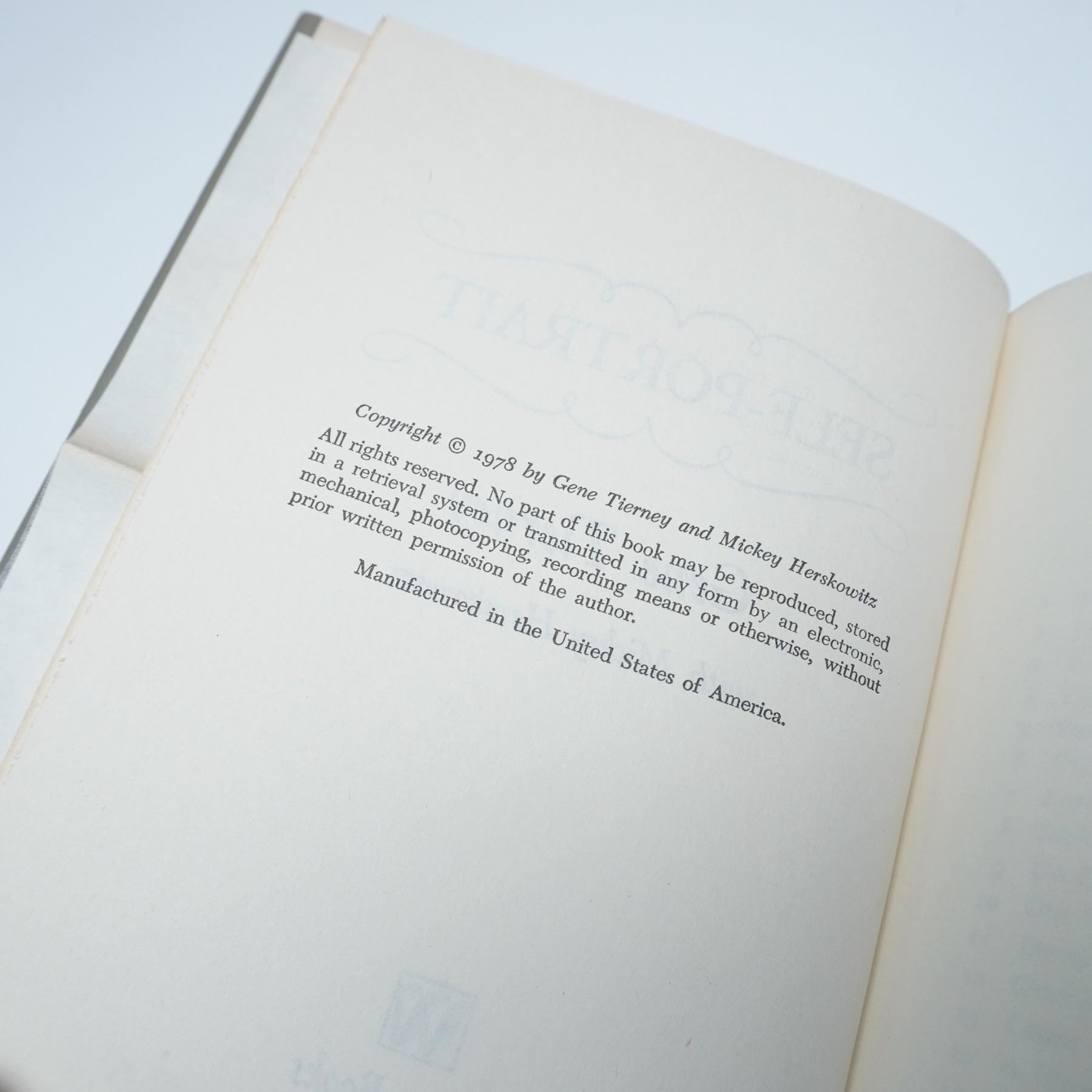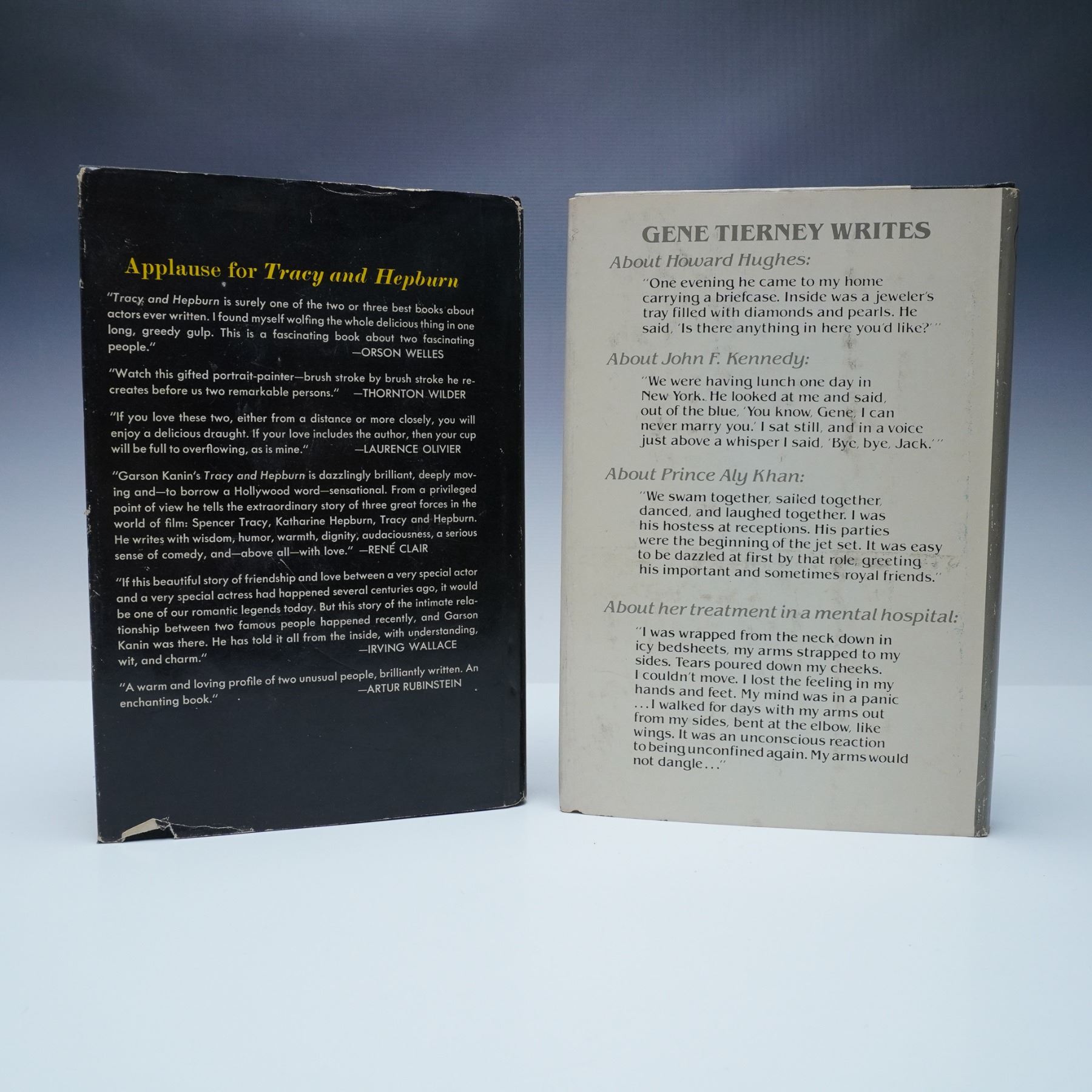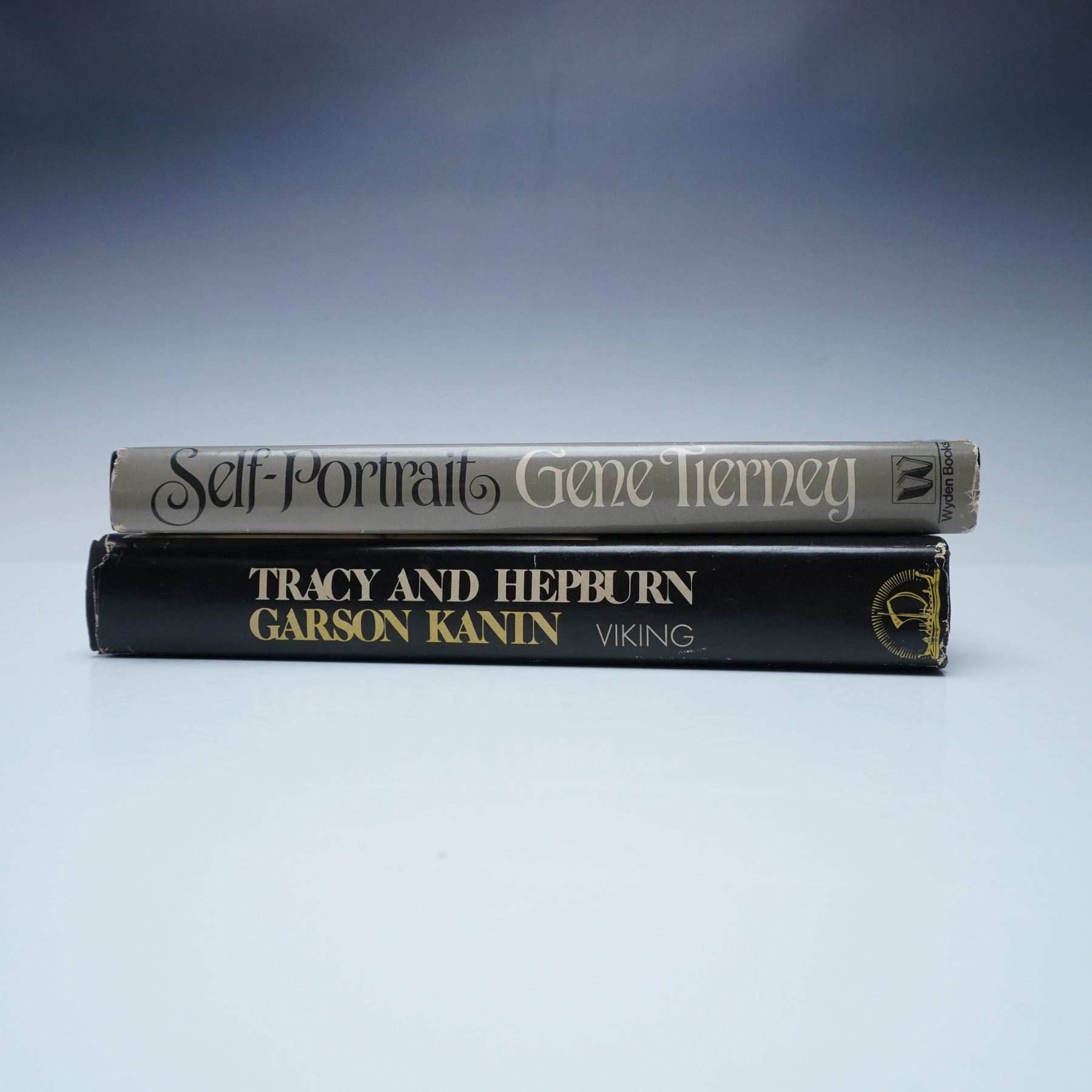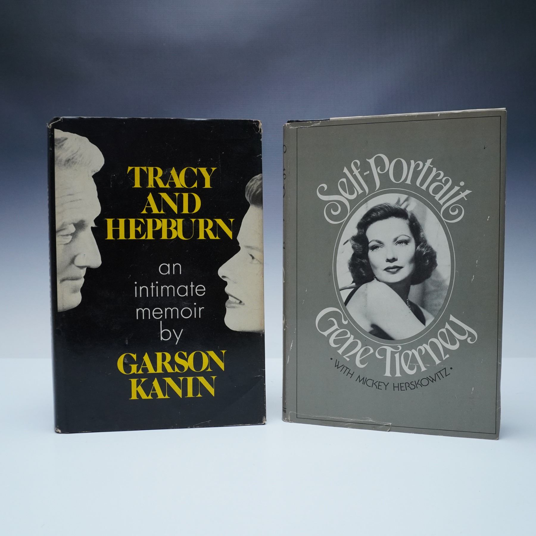 Two first edition hardcover books featuring Hollywood icons. Tracy and Hepburn: An Intimate Memoir by Garson Kanin (Viking, 1971) offers a behind-the-scenes look at the legendary relationship between Spencer Tracy and Katharine Hepburn. Self-Portrait by Gene Tierney with Mickey Herskowitz (Wyden Books, 1979) is the acclaimed actress's candid autobiography, discussing her career, personal struggles, and encounters with notable figures like Howard Hughes and John F. Kennedy. Includes dust jackets with signs of wear. Dimensions: 6"L x 2.25"W x 8.5"H.