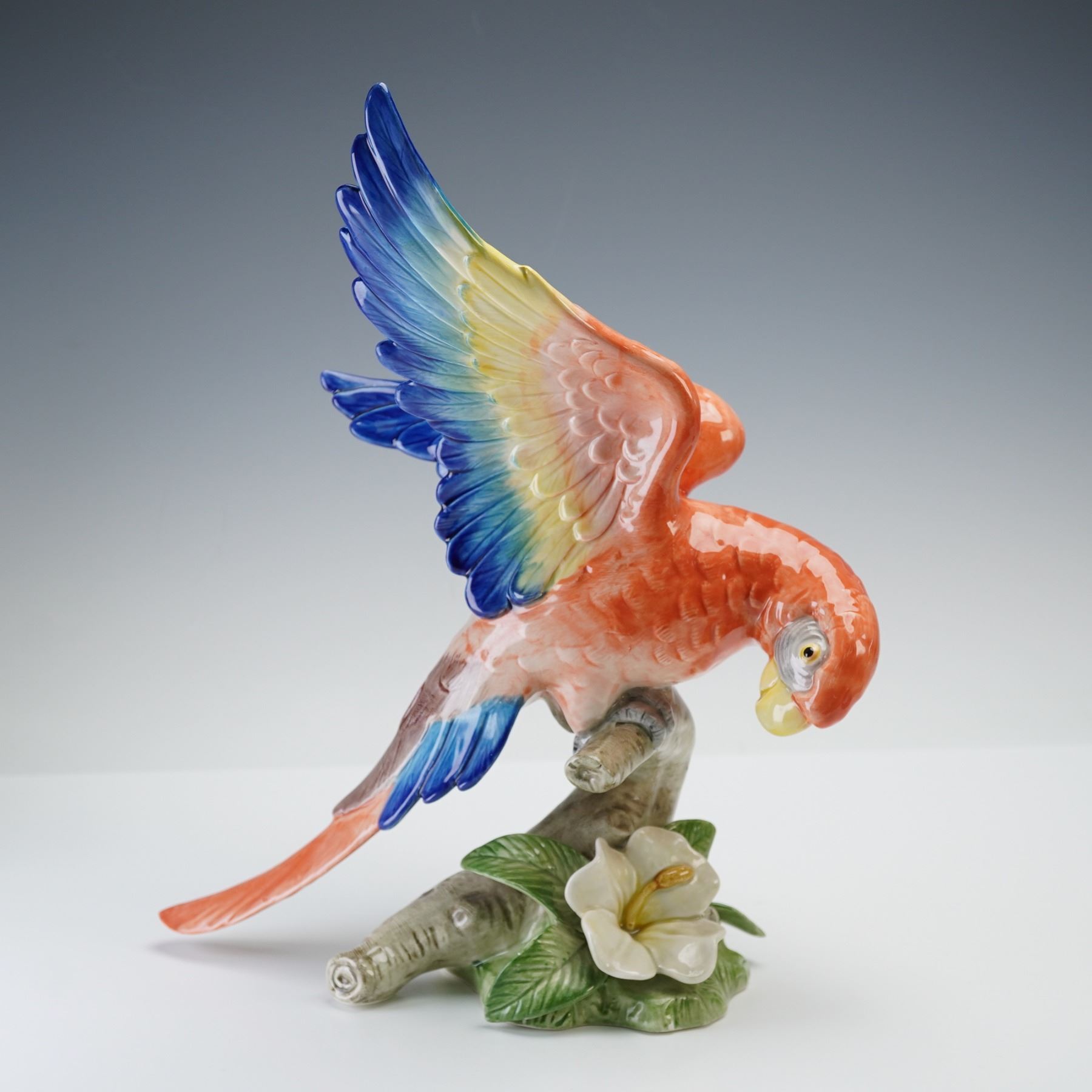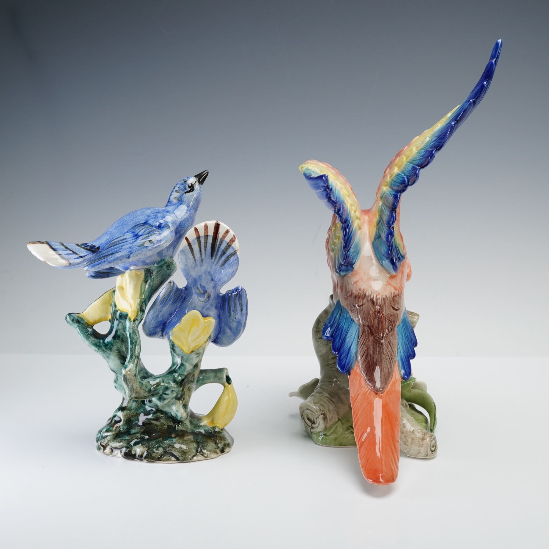 A colorful grouping of two hand-painted ceramic bird figurines including one by Fitz and Floyd, dated 1986, depicting a parrot with vibrant orange, yellow, and blue plumage perched on a flowering branch, and one by Stangl Pottery featuring a pair of blue jays resting on a green branch. Both pieces are marked to the undersides. The Fitz and Floyd parrot is stamped FF1986, and the Stangl example bears the impressed mark "Stangl Pottery Birds."