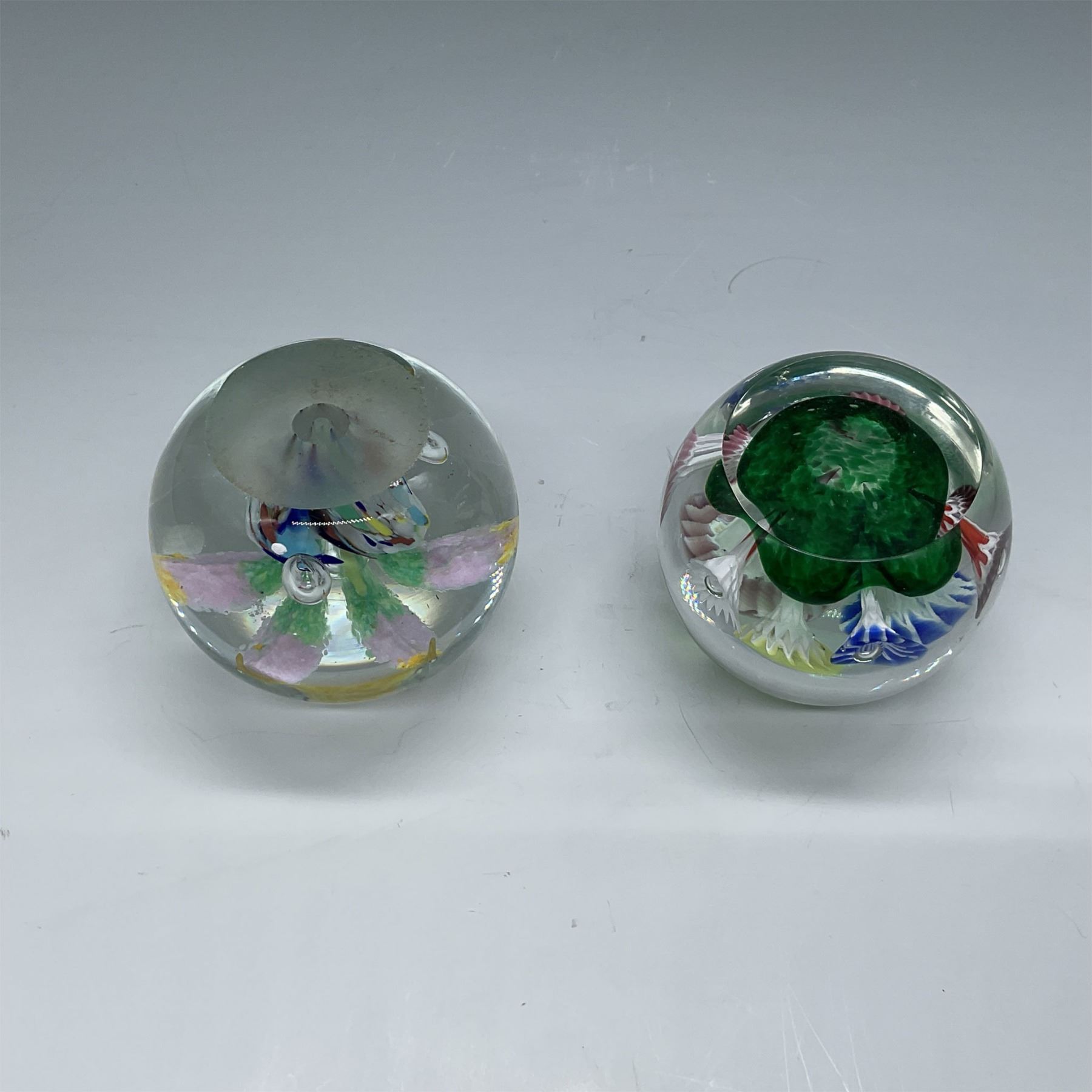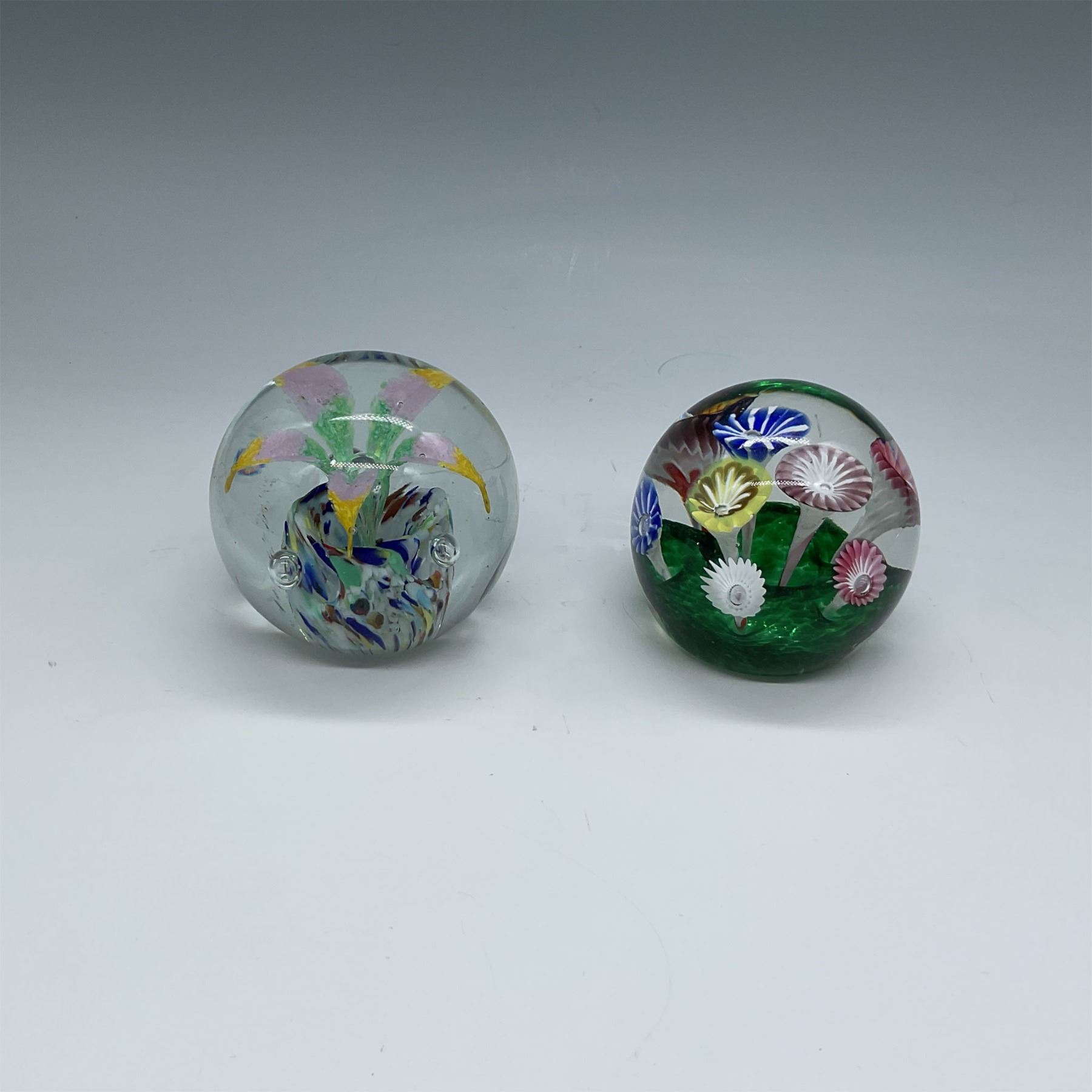 This lot features two paperweights with intricate floral designs. One paperweight showcases a vibrant pink flower with a multicolored base, while the other depicts a lush green field with multicolored blossoms. Both pieces exhibit exceptional craftsmanship and attention to detail.