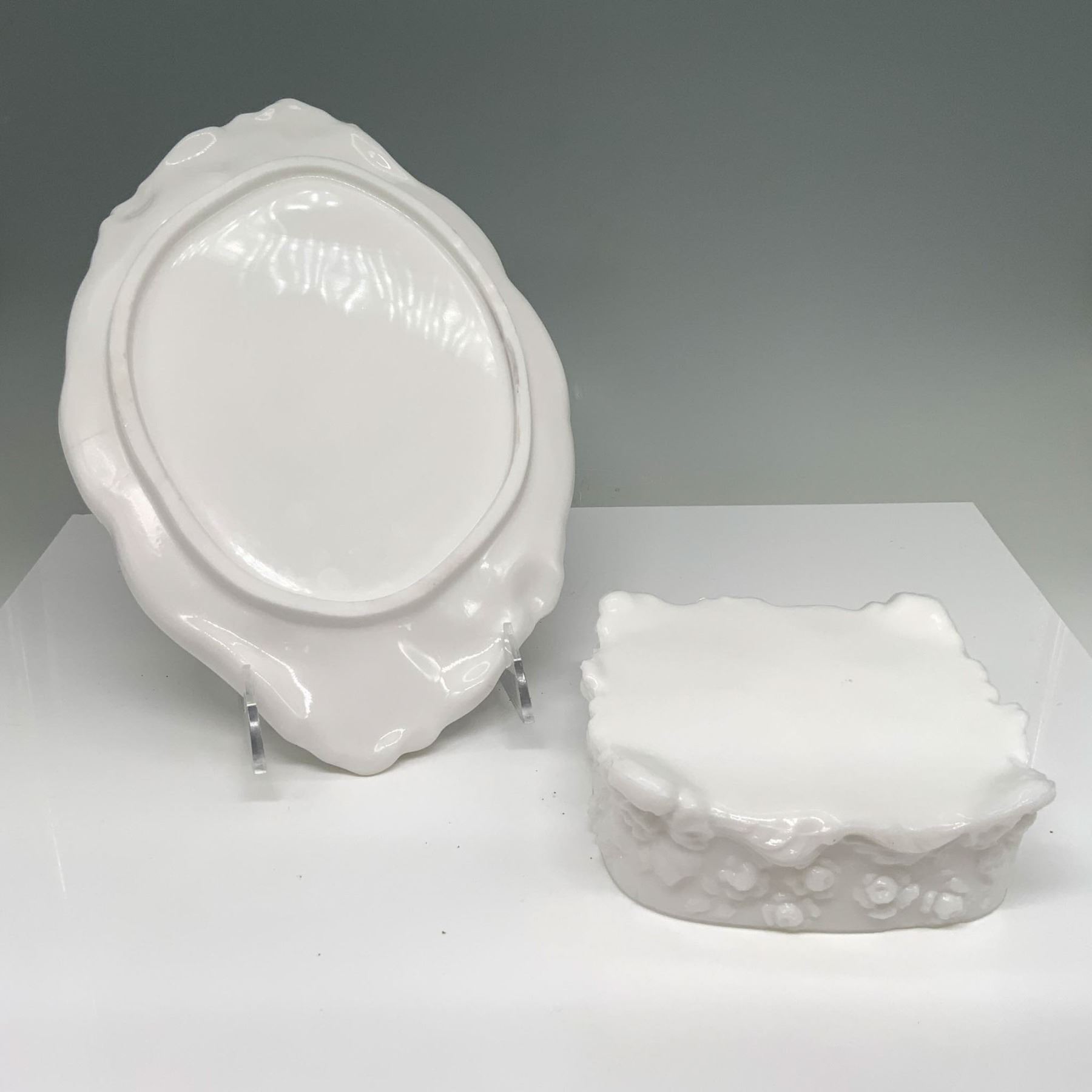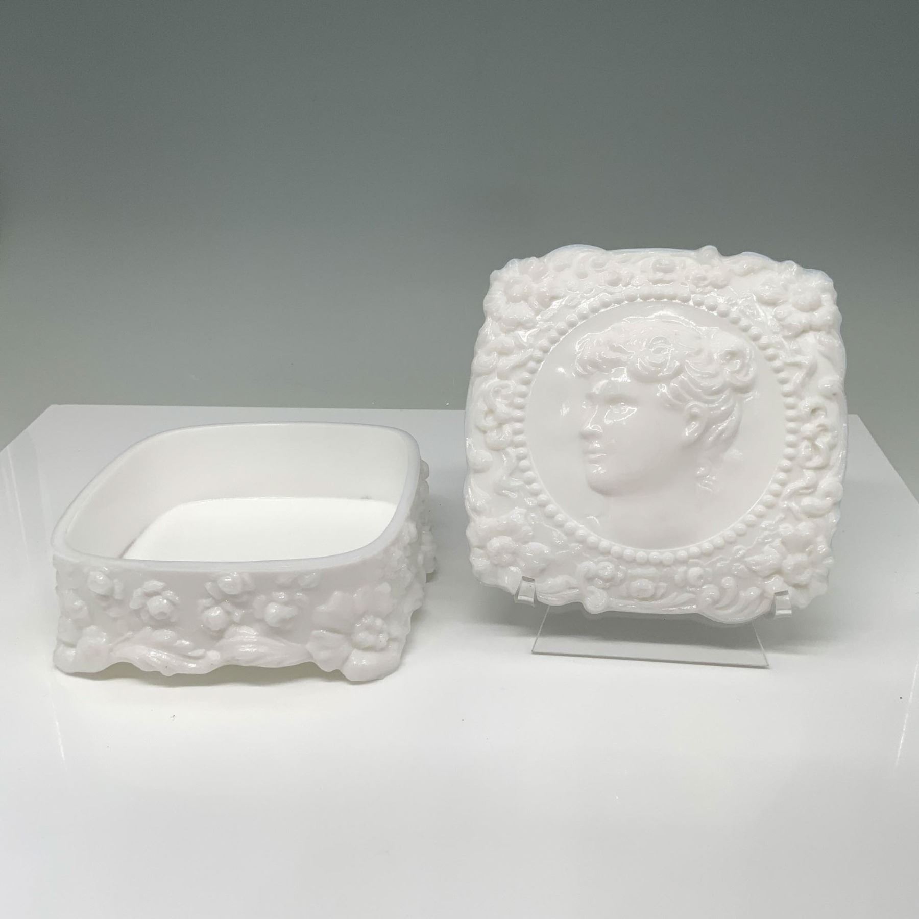 Vintage hand crafted white milk glass, features a decorative tray and matching lidded trinket box, they showcase a woman in high relief surrounded by intricate floral motifs. Tallest figure: 5.5"L x 5.5"W x 2.75"H.