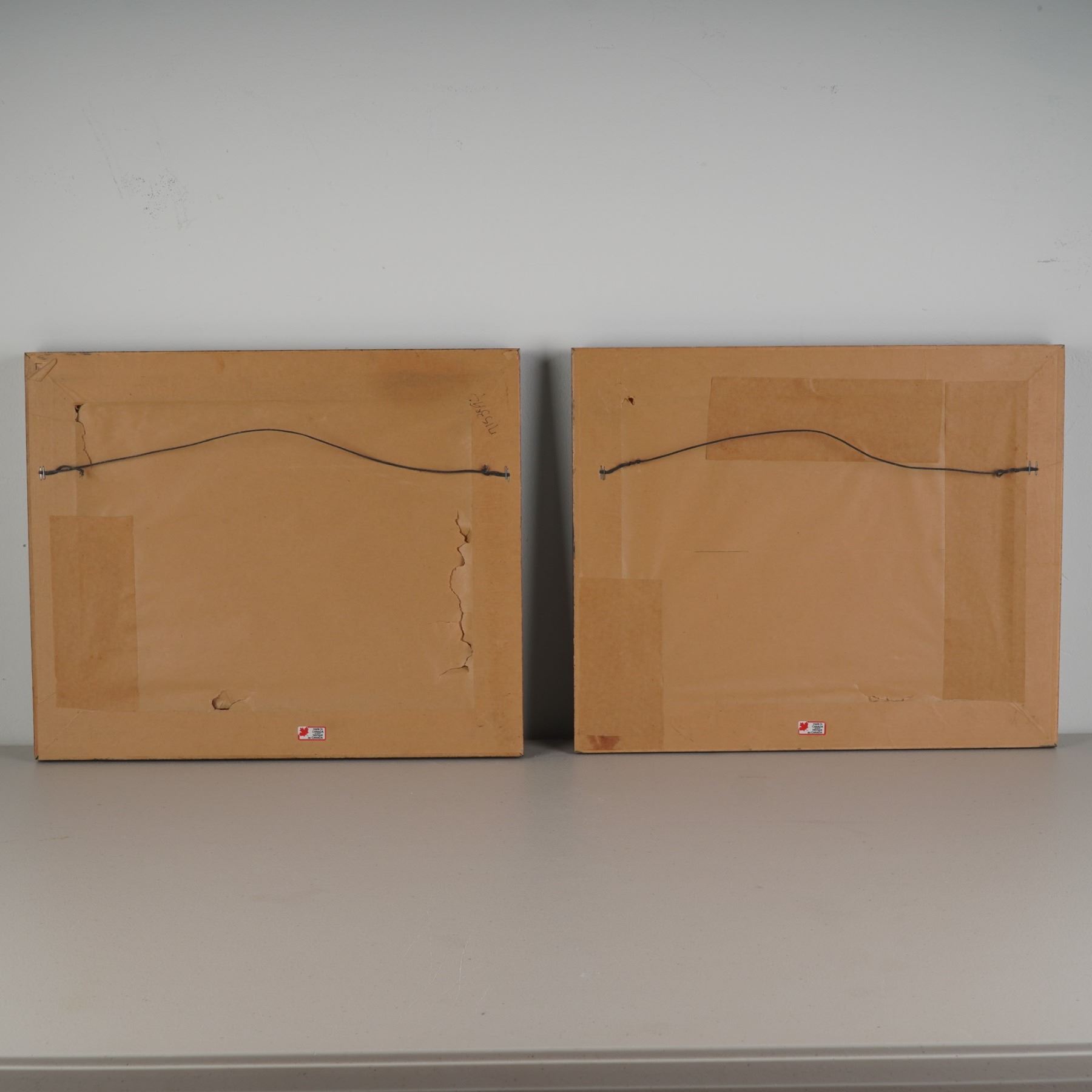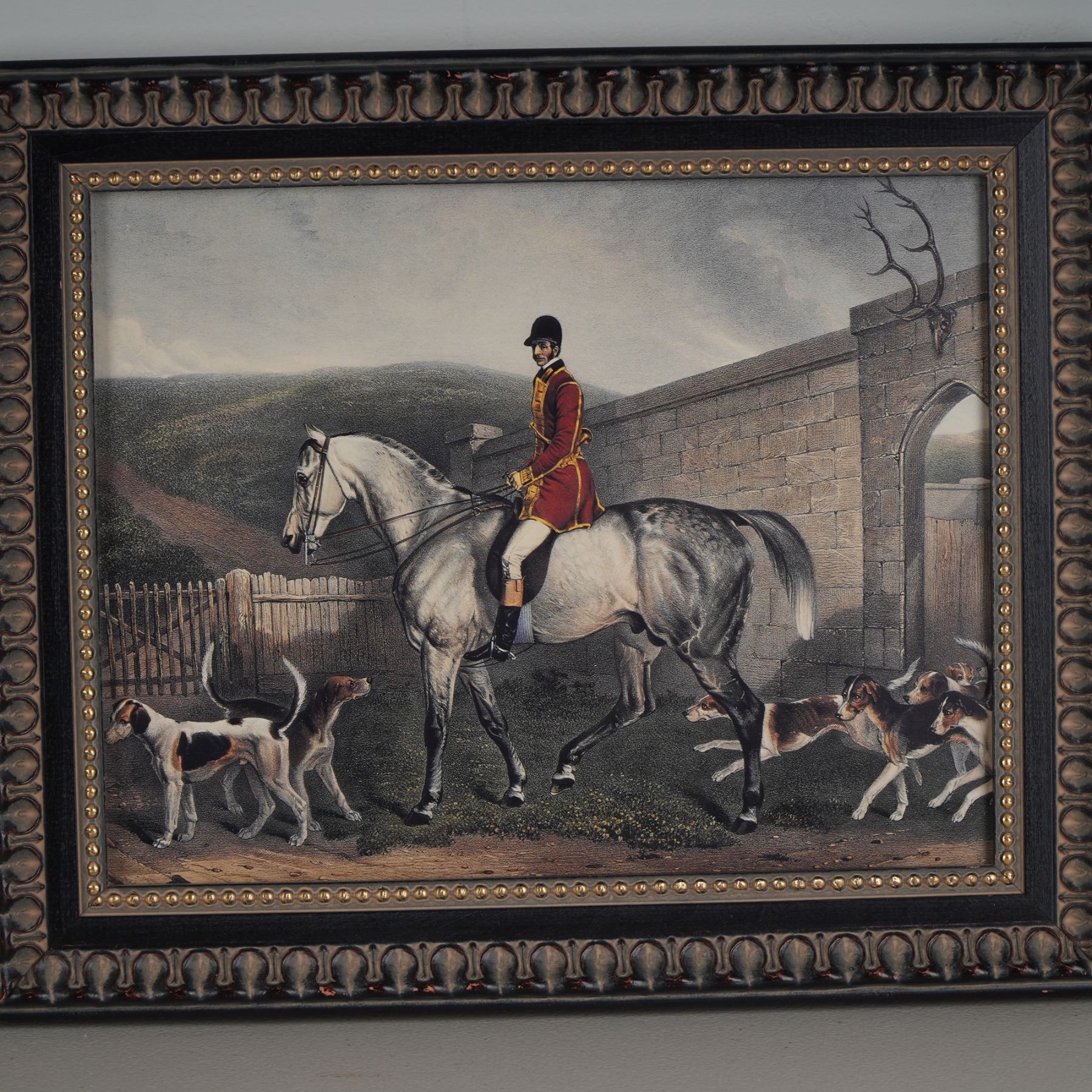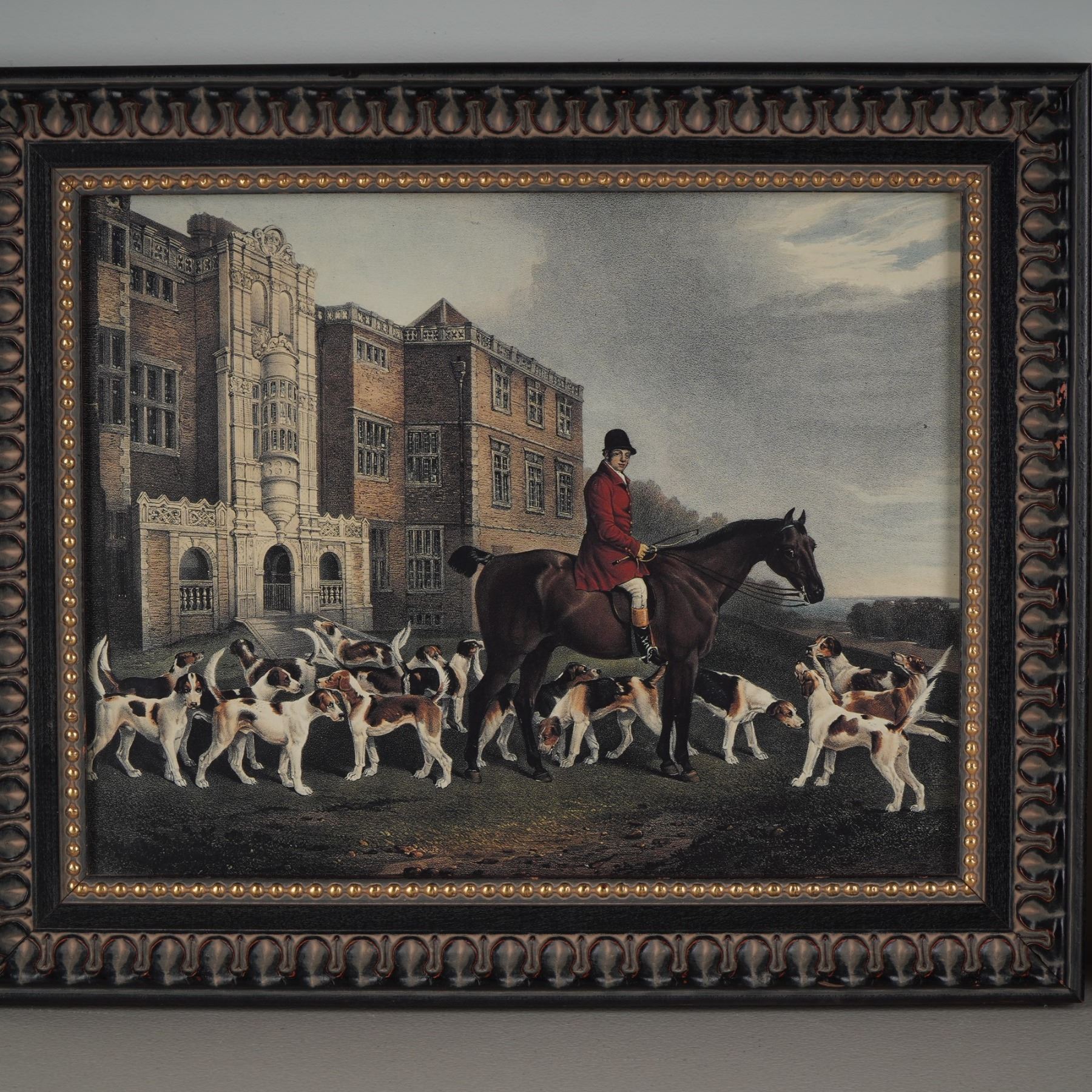 Pair of framed prints after Richard Barrett Davis, each portraying a classic English fox hunting scene. The first features a huntsman in a red riding coat atop a grey horse, surrounded by attentive hounds against a rustic countryside gate. The second depicts a similar rider before a grand manor, accompanied by a full pack of hounds in motion. Both prints are housed in matching ornate frames with decorative bead and scroll detailing, adding to their traditional appeal. Backed with brown paper and hanging wires, both works include a sticker reading Made in Canada.