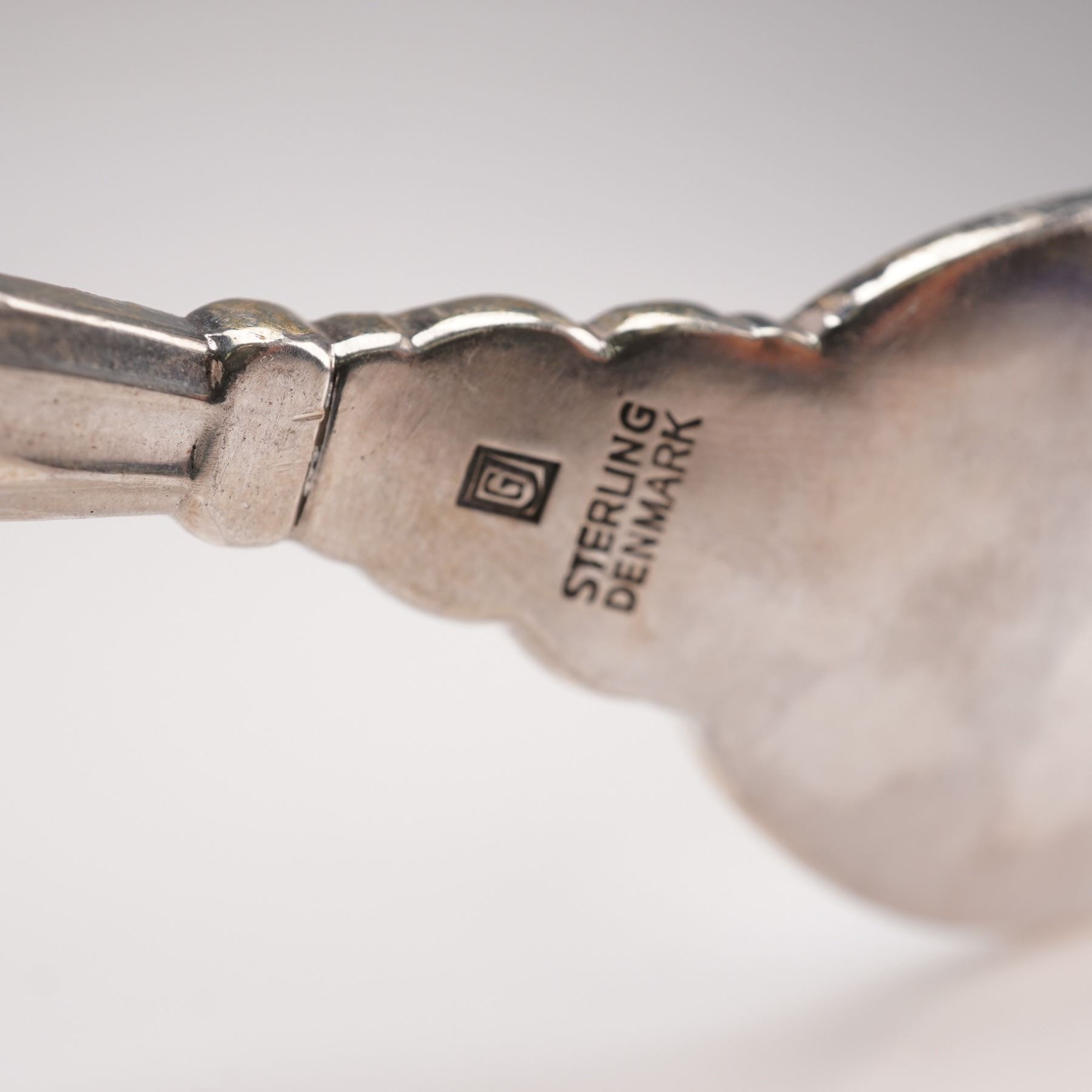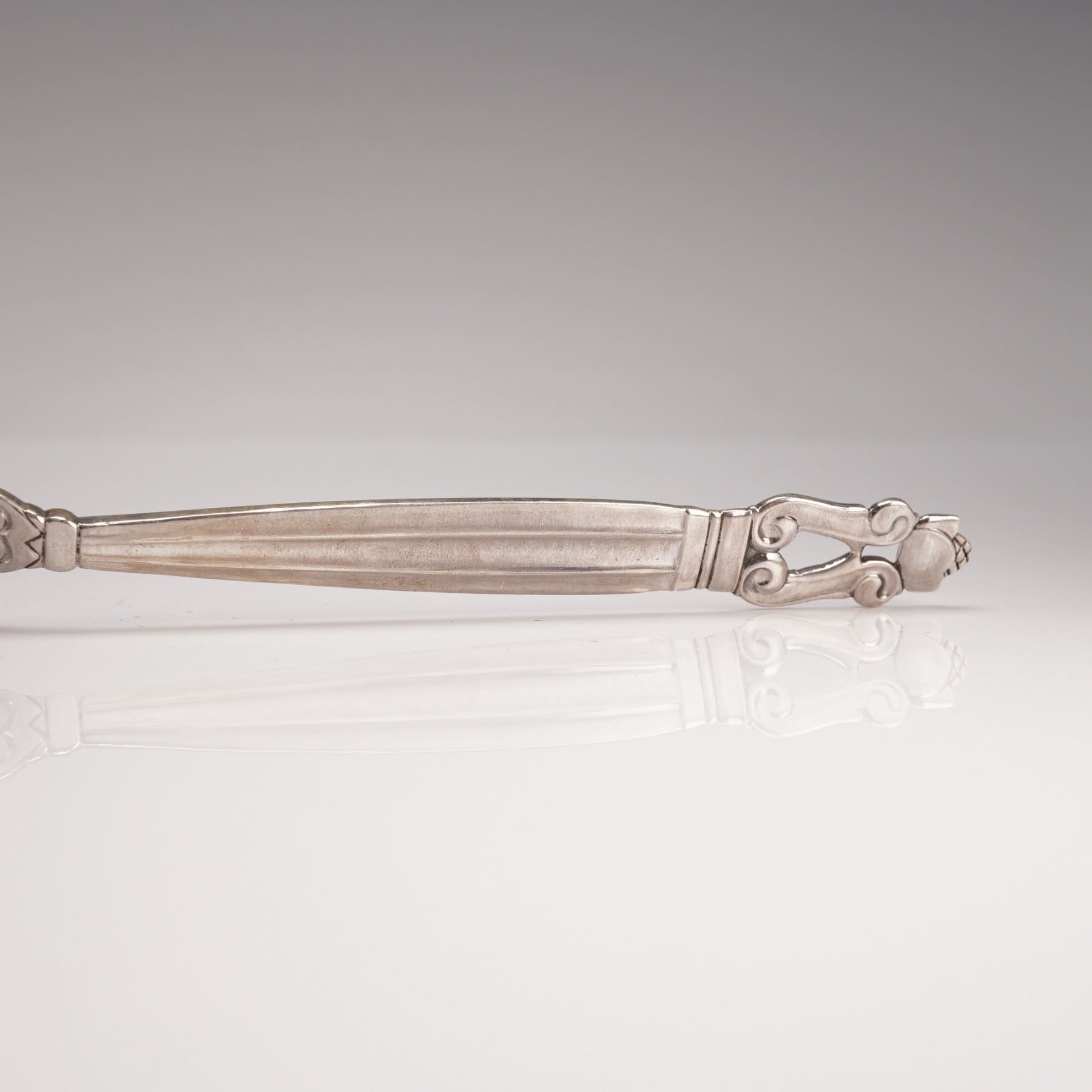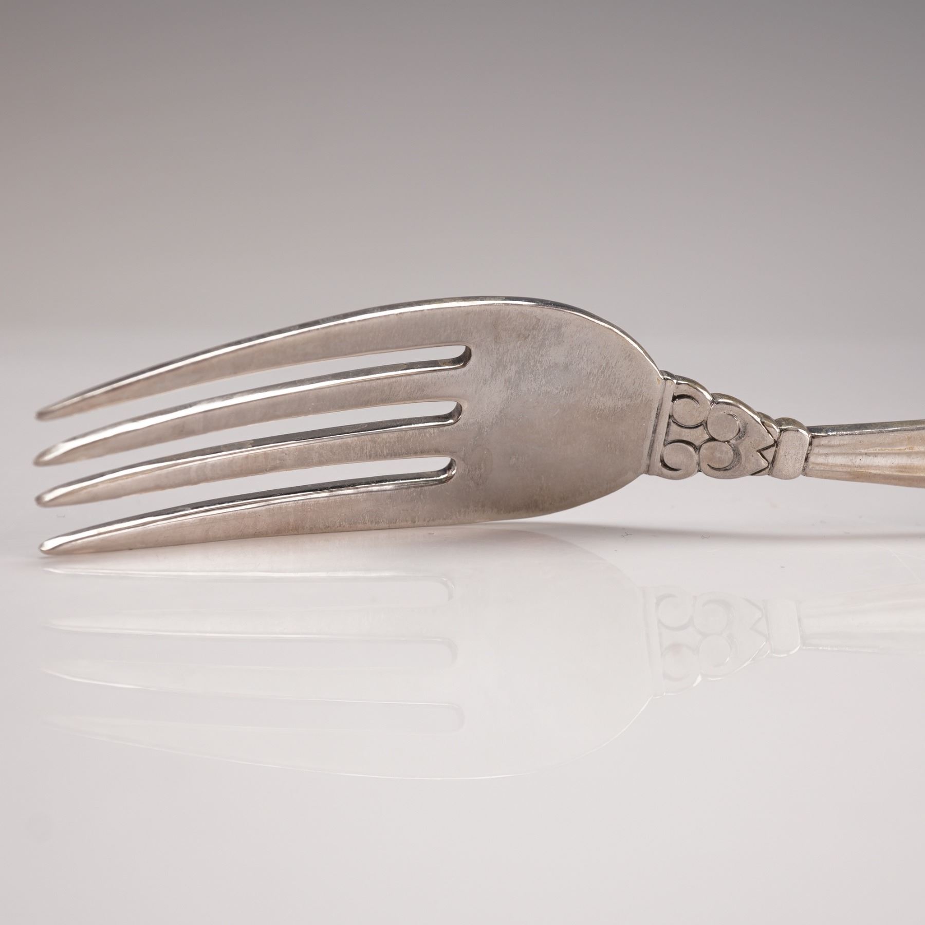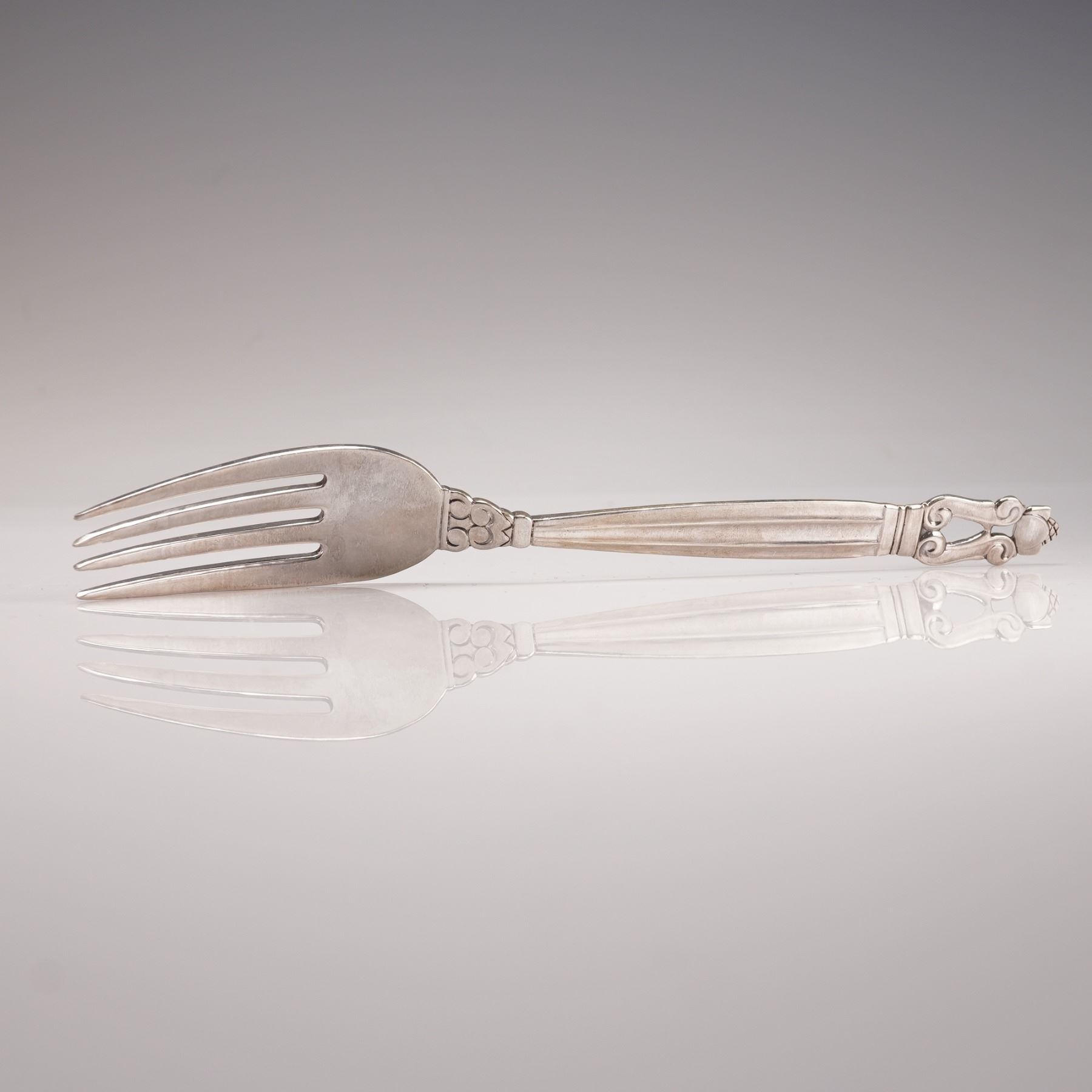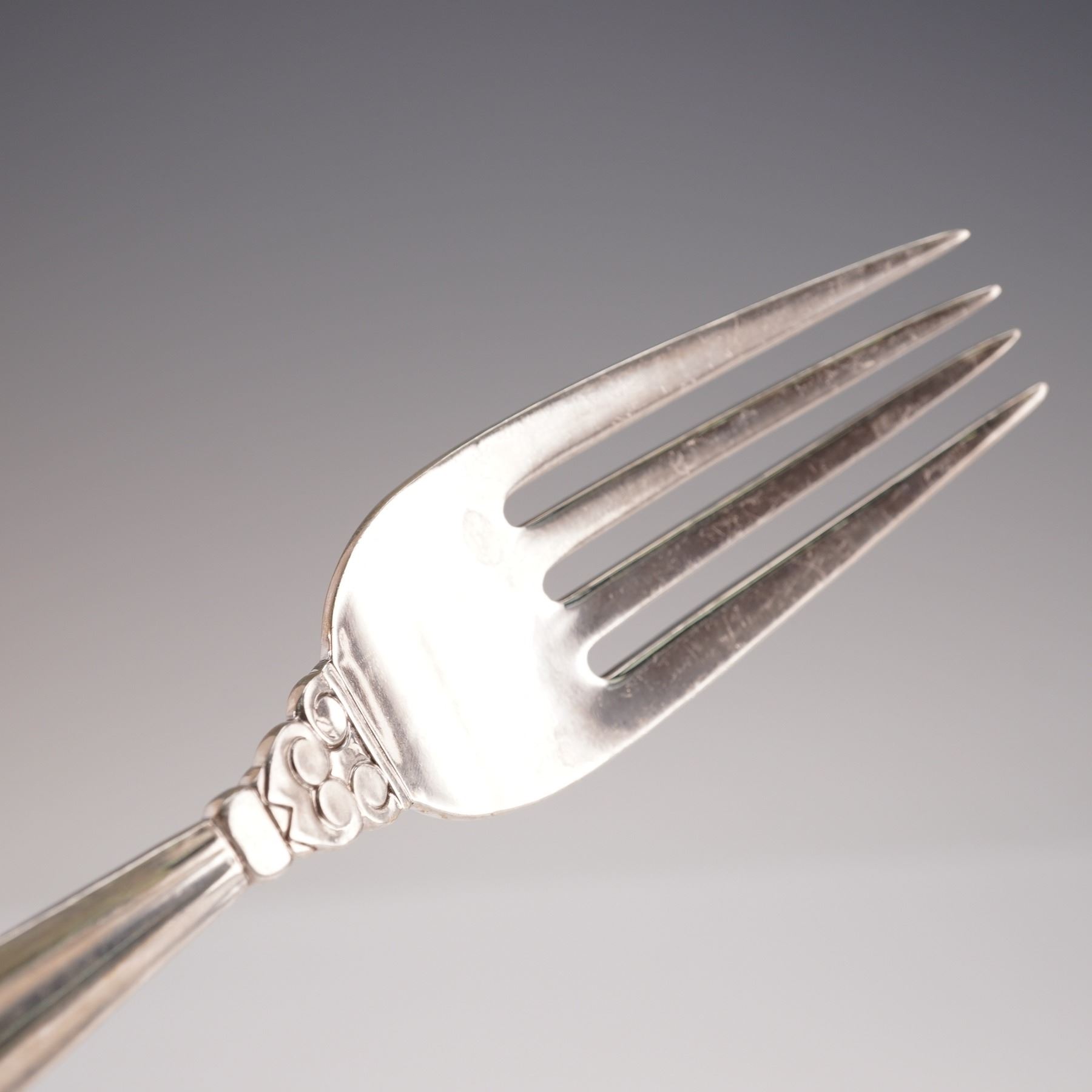A two-piece set of Georg Jensen sterling silver dinner forks in the Acorn pattern, designed by Johan Rohde in 1915. Each marked Georg Jensen Sterling Denmark. The pattern features a fluted handle with scrolled detailing and a stylized acorn finial, reflecting Jensen's early balance of classic form and organic design. A fine example of Danish silver craftsmanship in one of Georg Jensen's most celebrated patterns. Total combined net silver weight: 3.7 troy oz.