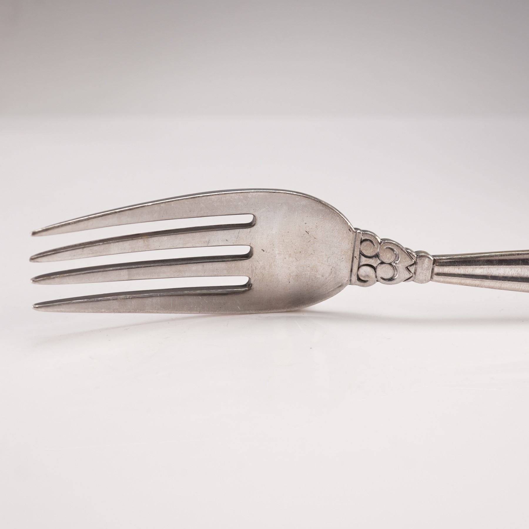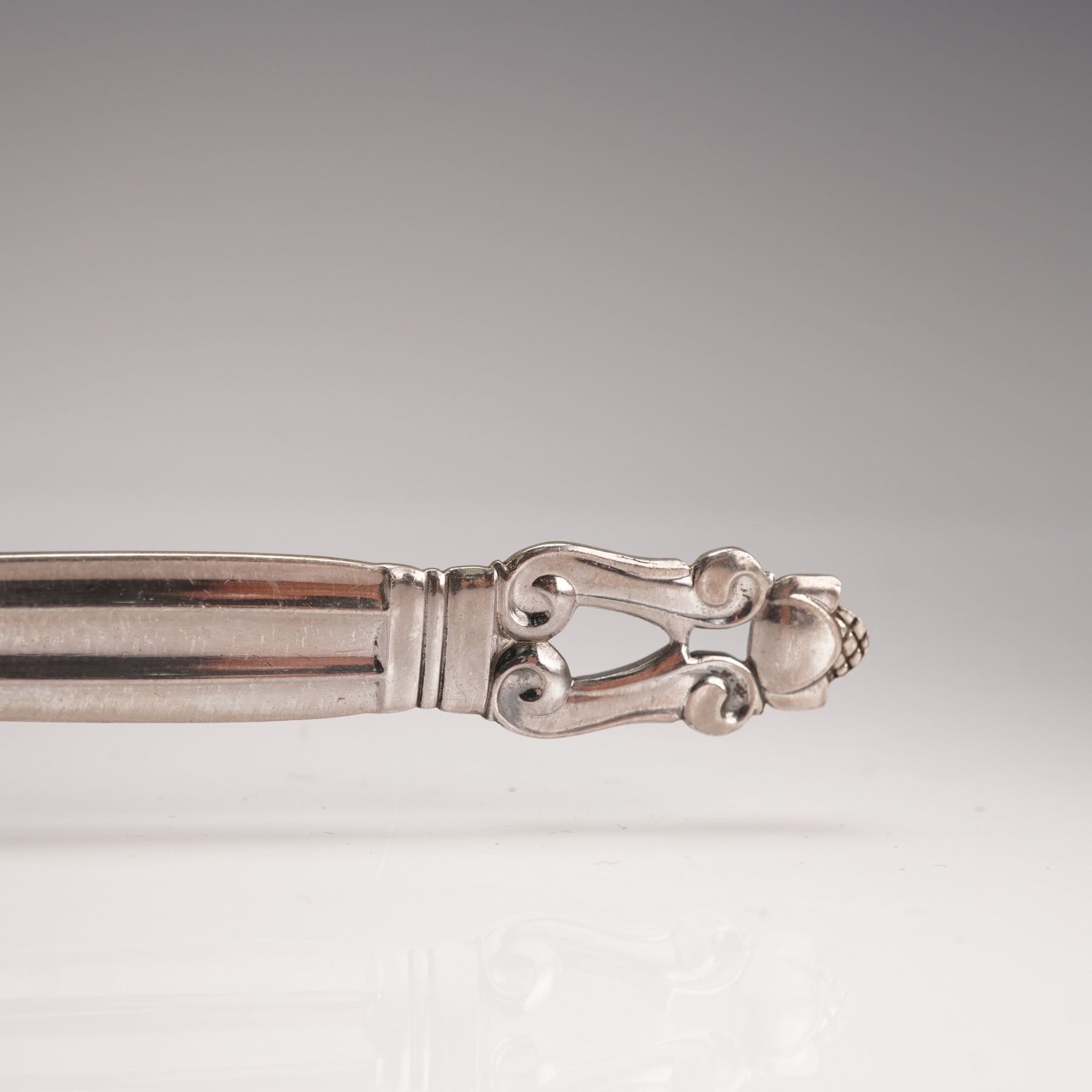 A two-piece set of Georg Jensen sterling silver dinner forks in the Acorn pattern, designed by Johan Rohde in 1915. Each marked Georg Jensen Sterling Denmark. The pattern features a fluted handle with scrolled detailing and a stylized acorn finial, reflecting Jensen's early balance of classic form and organic design. A fine example of Danish silver craftsmanship in one of Georg Jensen's most celebrated patterns. Total combined net silver weight: 3.7 troy oz.