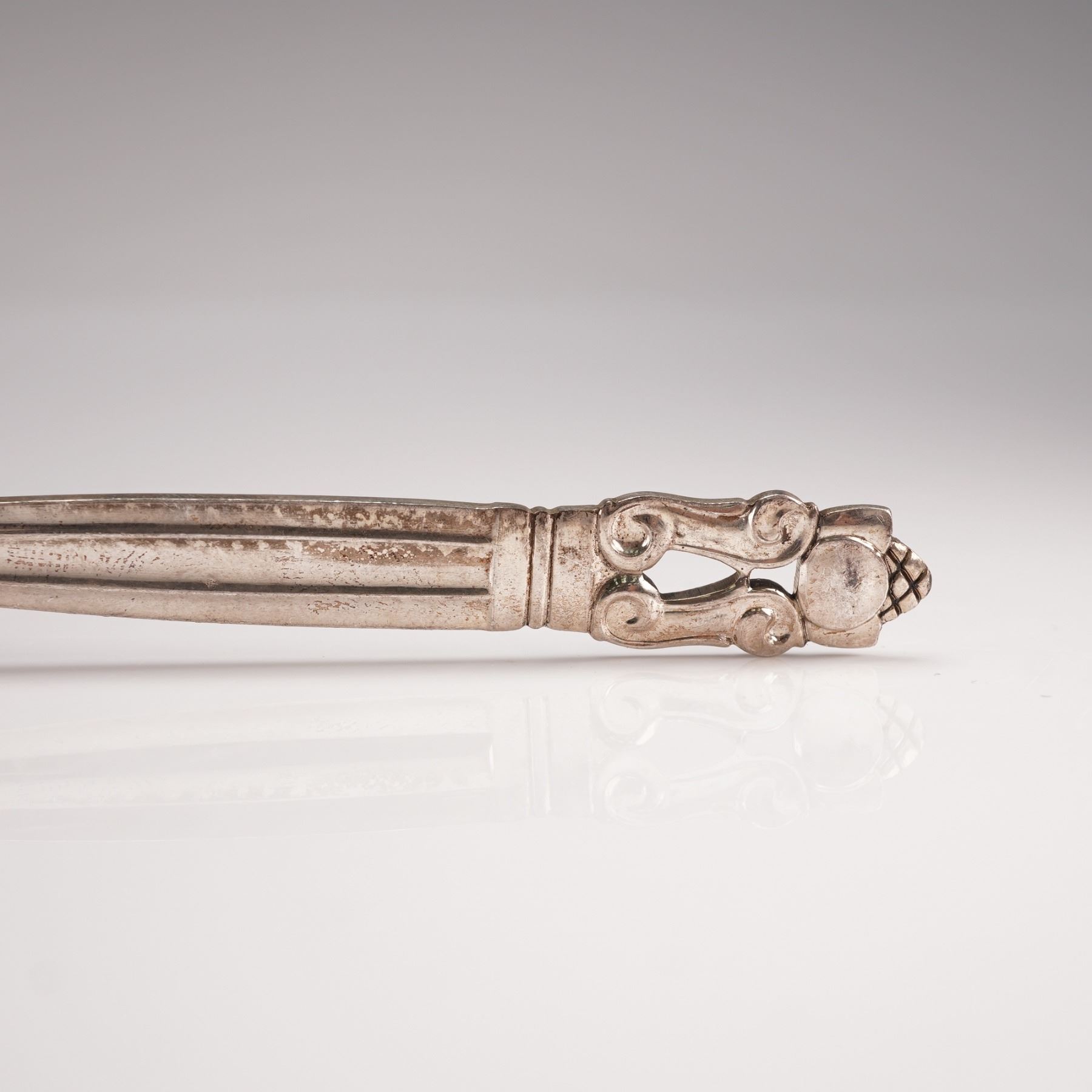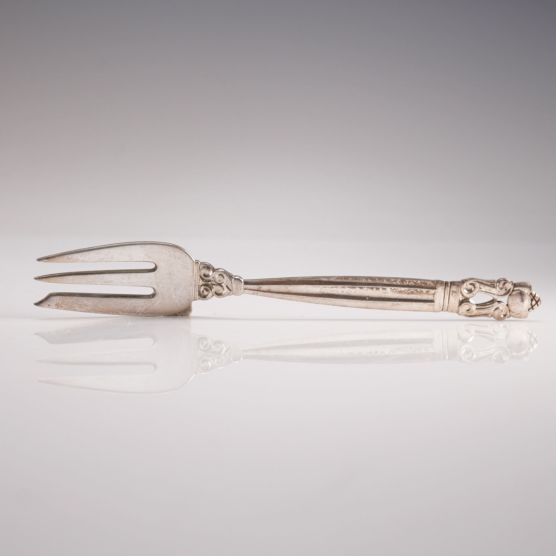 A two-piece lot of Georg Jensen sterling silver pastry forks in the Acorn pattern, designed by Johan Rohde in 1915. Marked Georg Jensen Sterling Denmark. The pattern features a tapered fluted handle leading to an open scroll terminal adorned with a stylized acorn motif, combining neoclassical balance with organic detailing. A fine example of Jensen's enduring craftsmanship and elegant Danish design. Total combined net silver weight: 1.9 troy oz.