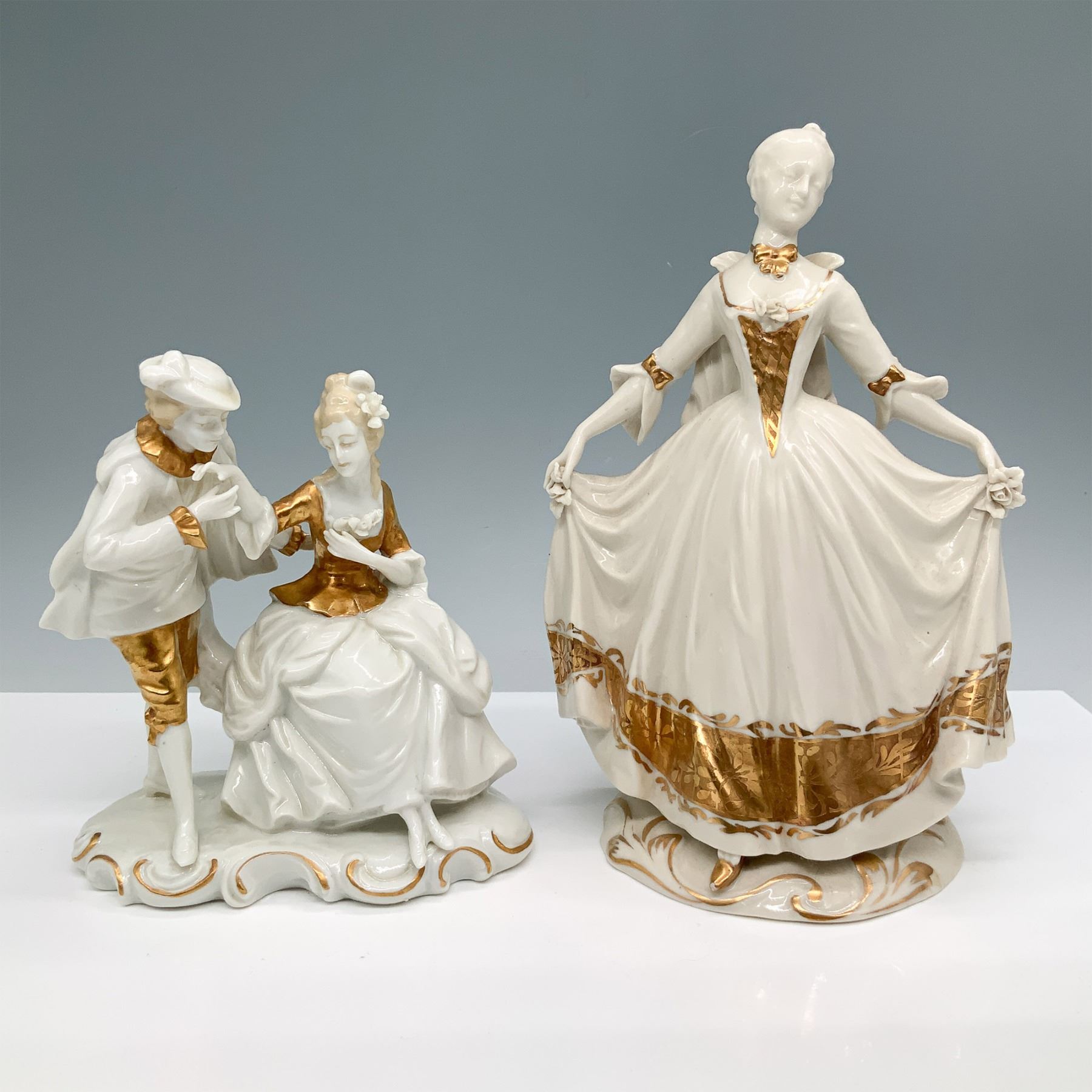 2pc German Porcelain Figurines, Courting Scene & Lady