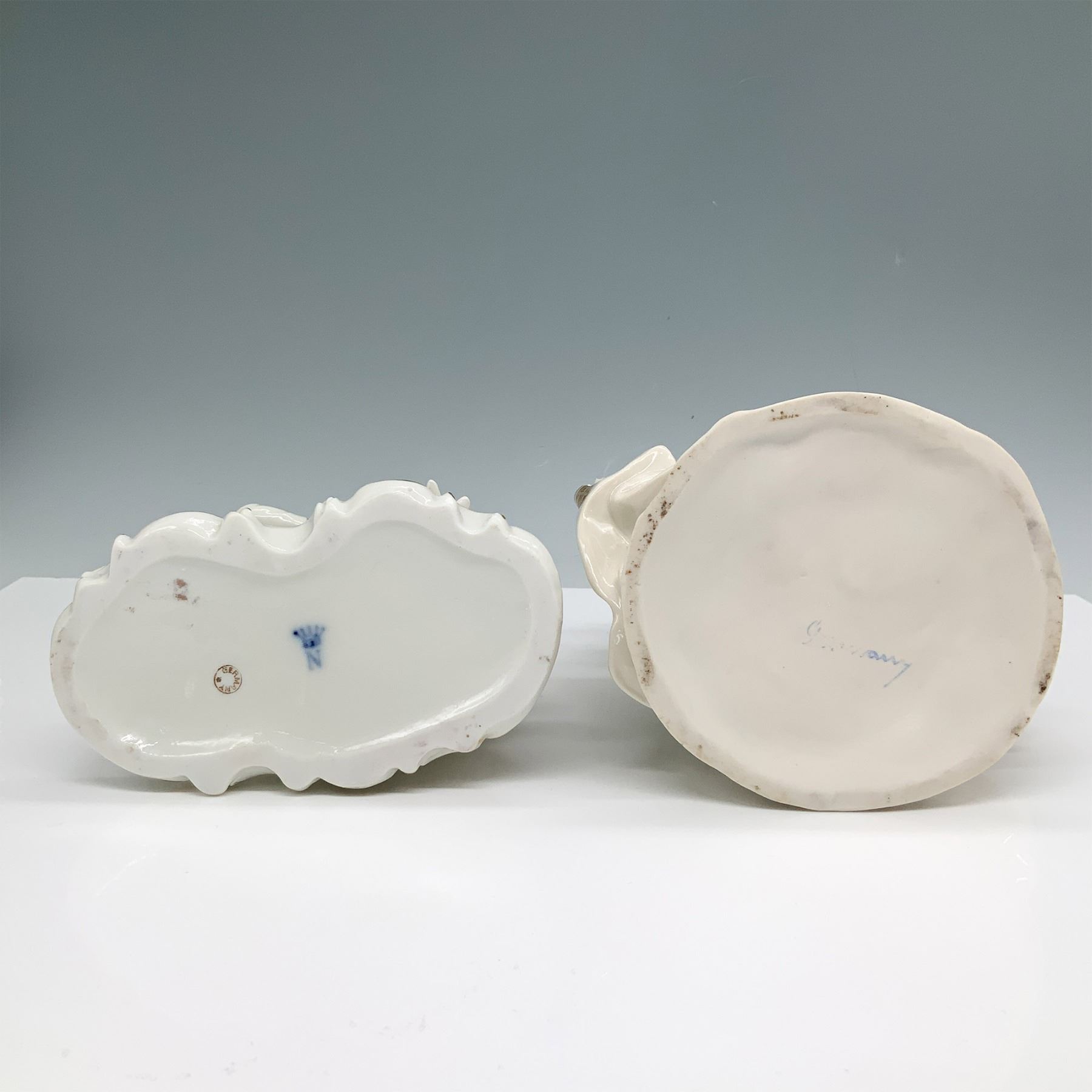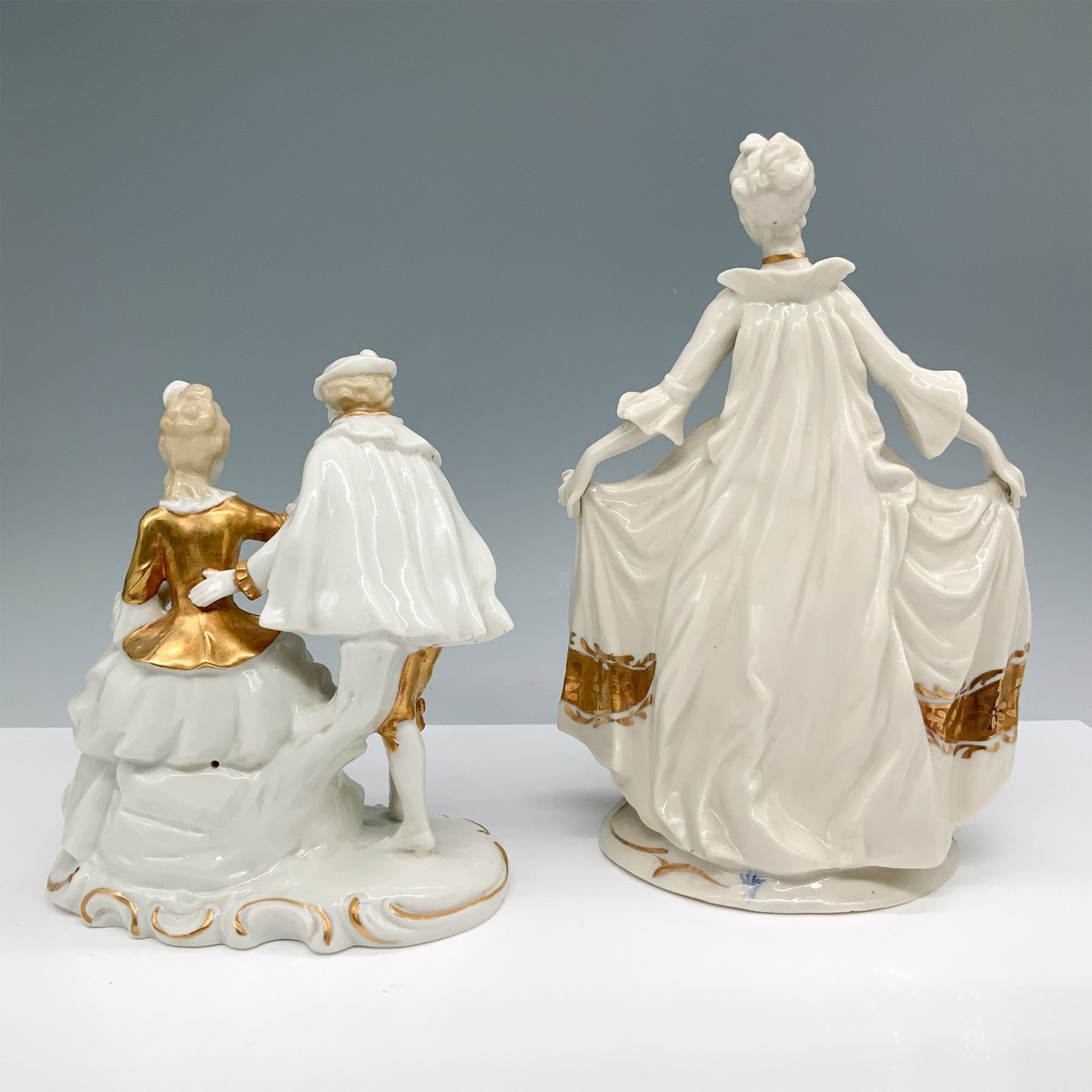 Elegant pair of German porcelain figurines featuring finely detailed Rococo-style figures with gilded accents. One piece depicts a gentleman courting a seated lady, while the other showcases a lady lifting her gown gracefully. Both are adorned with hand-painted gold embellishments highlighting their intricate period attire. The bases are marked, including a blue crown and N mark, indicative of German craftsmanship. A refined addition to any porcelain collection. Tallest item: 8.25"H.