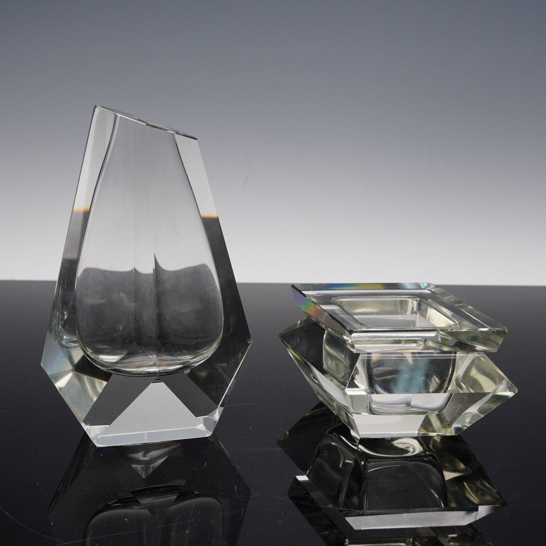 This elegant 2-piece glass set features an Art Deco-inspired design, showcasing sharp faceted angles and clear, crisp edges, creating a striking prism effect. The set includes a stunning geometric vase with a unique, angular profile and a matching lidded bowl, each radiating a brilliant light reflection with their precision-cut design.