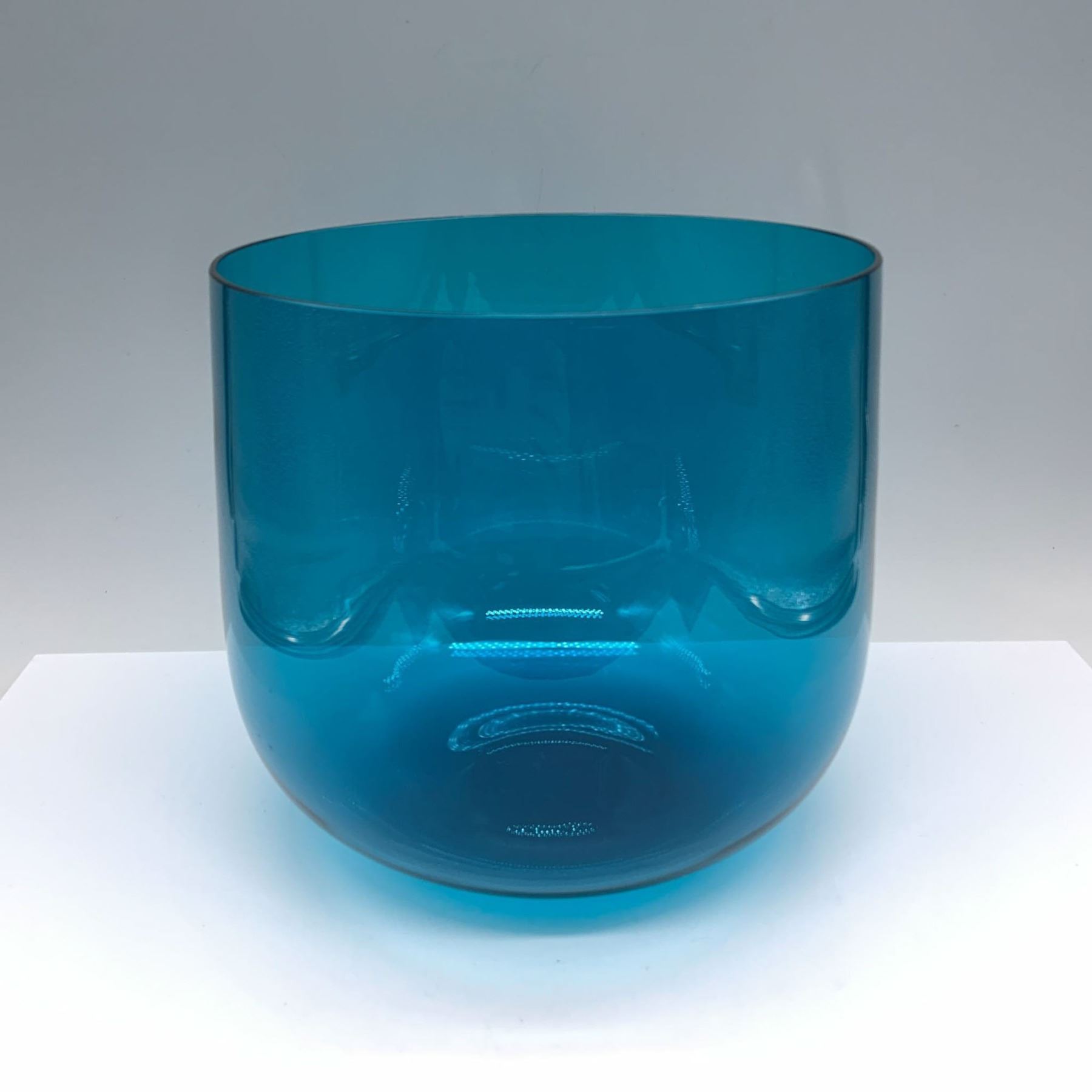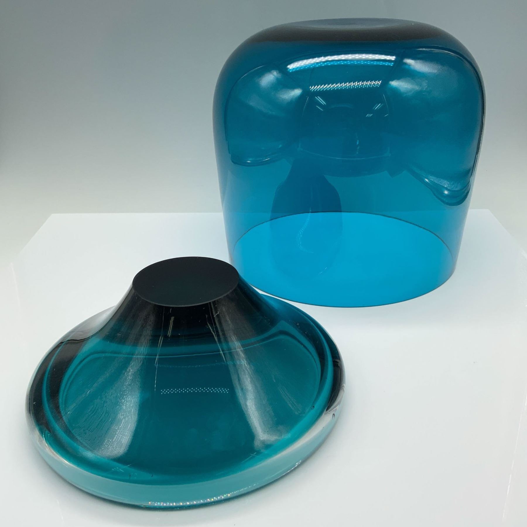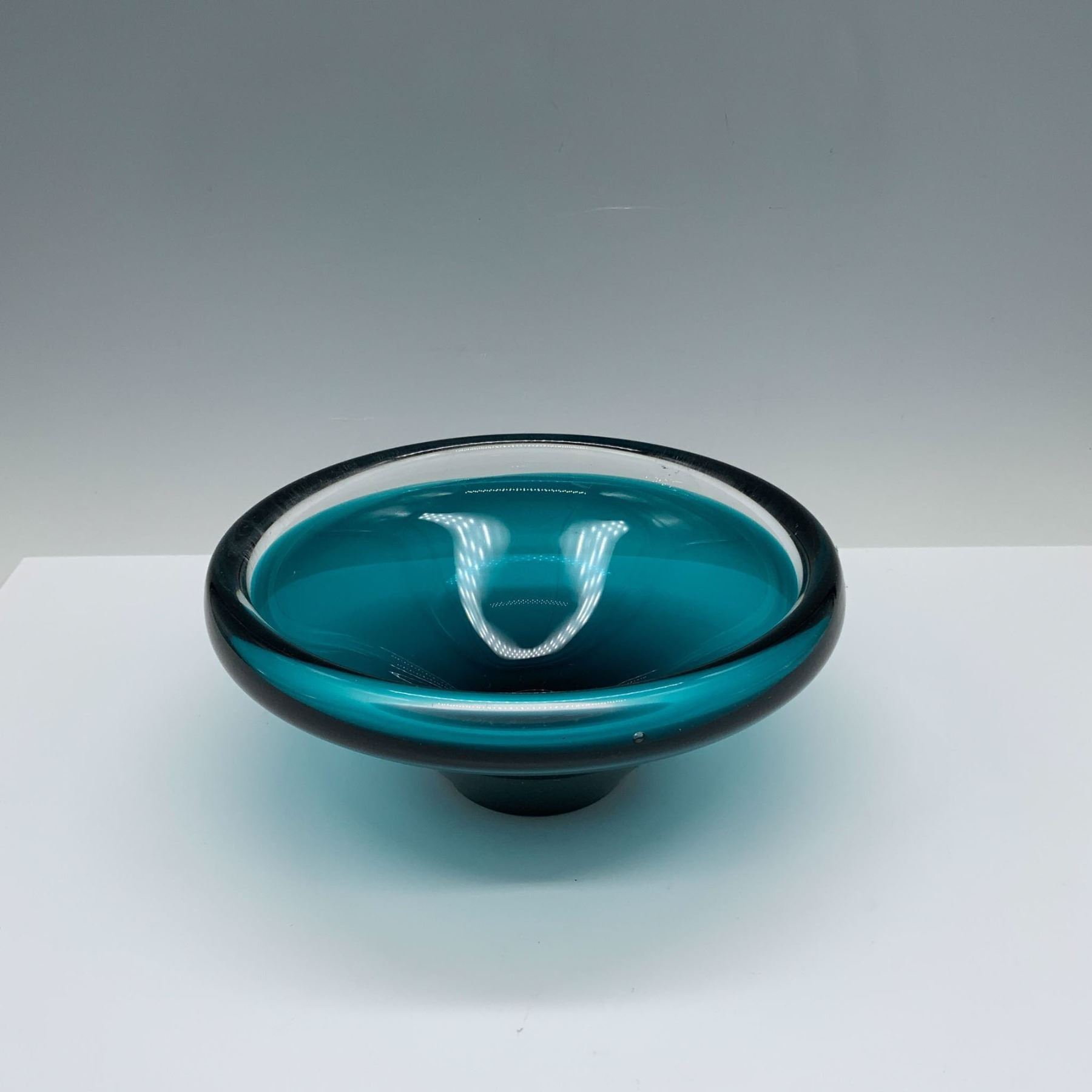 Stunning duo of transparent bowls with a beautiful deep blue hue that consists of a large wide body, and a modernist art glass dish. Largest item measures 7.5"H x 8" dia.