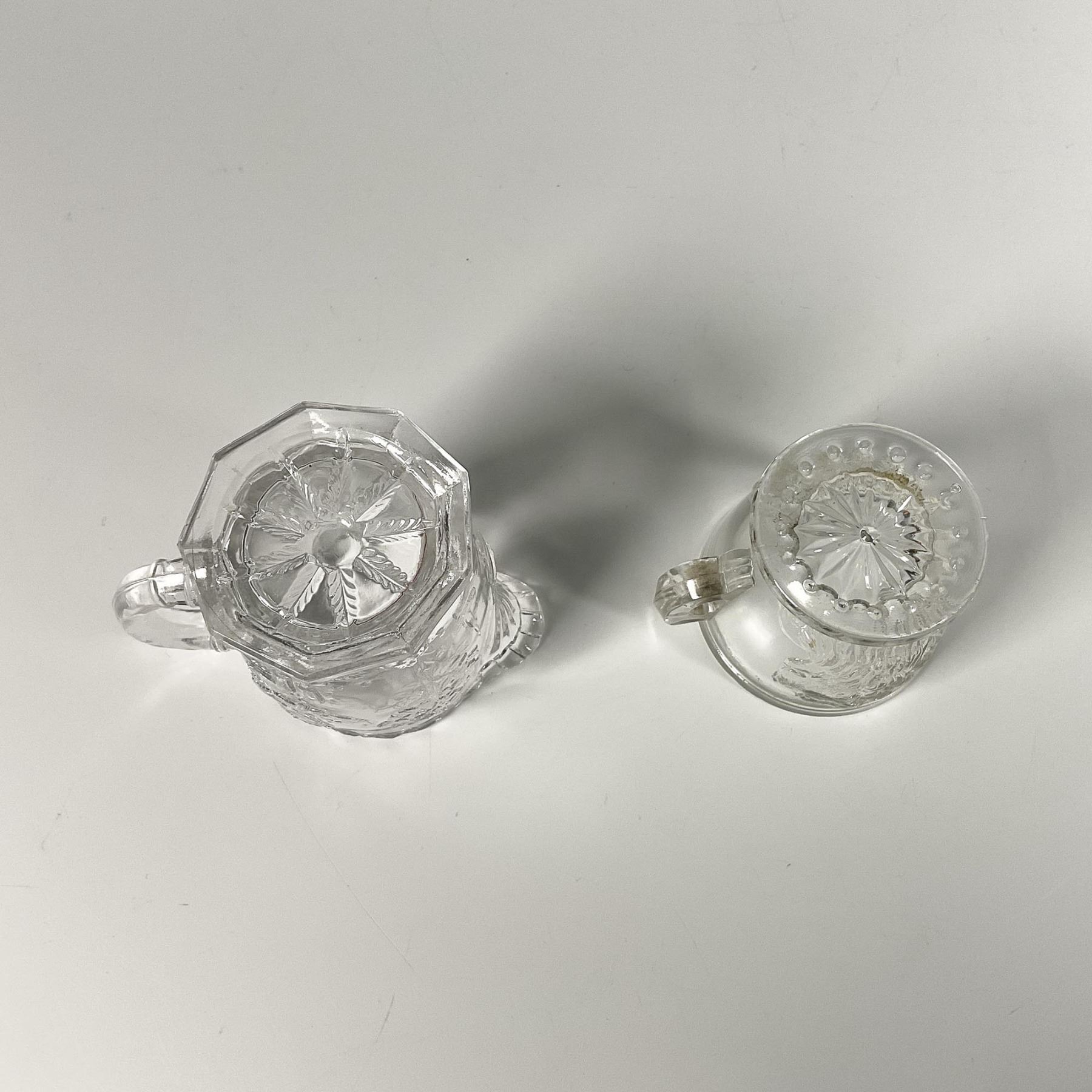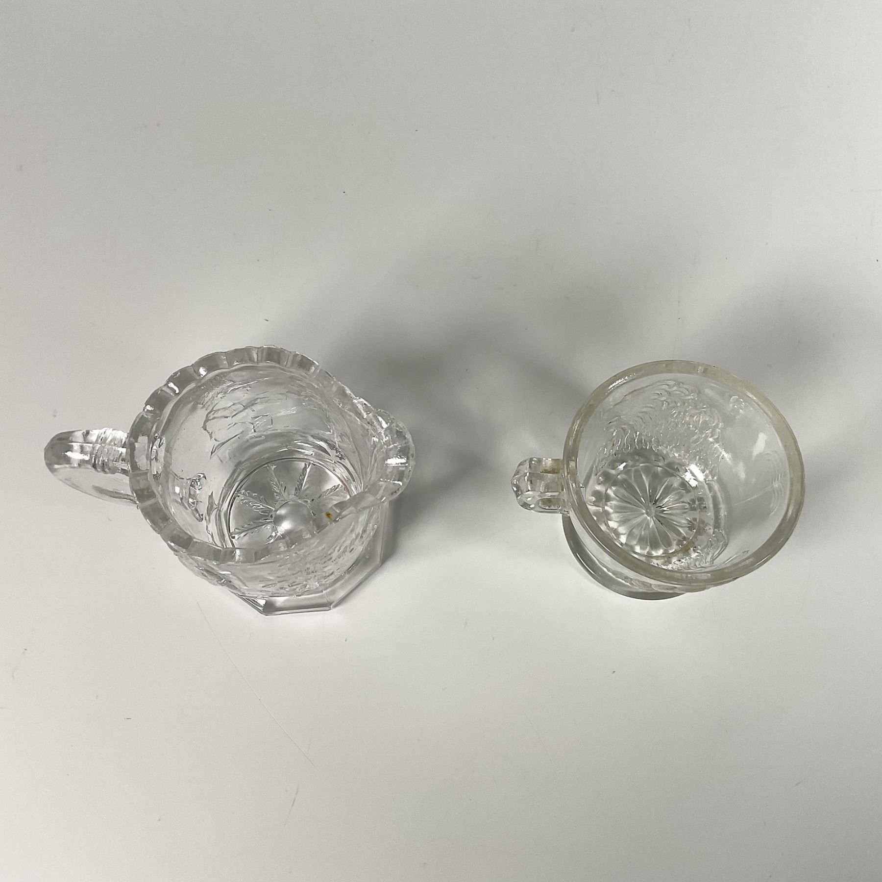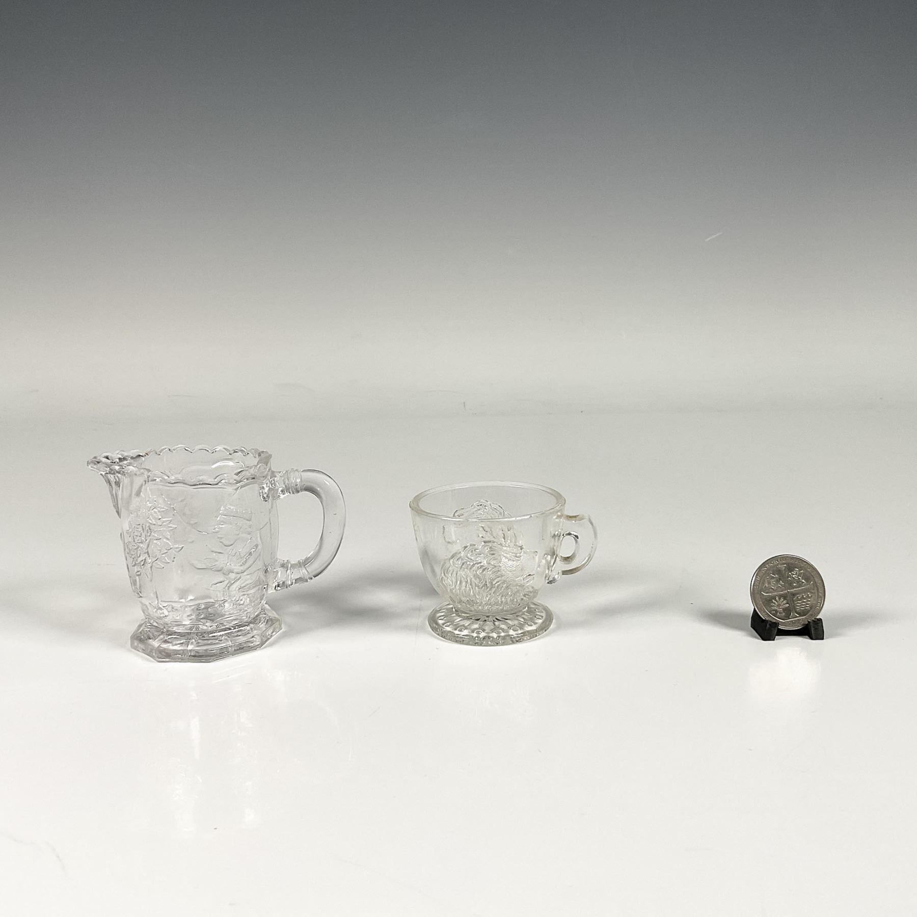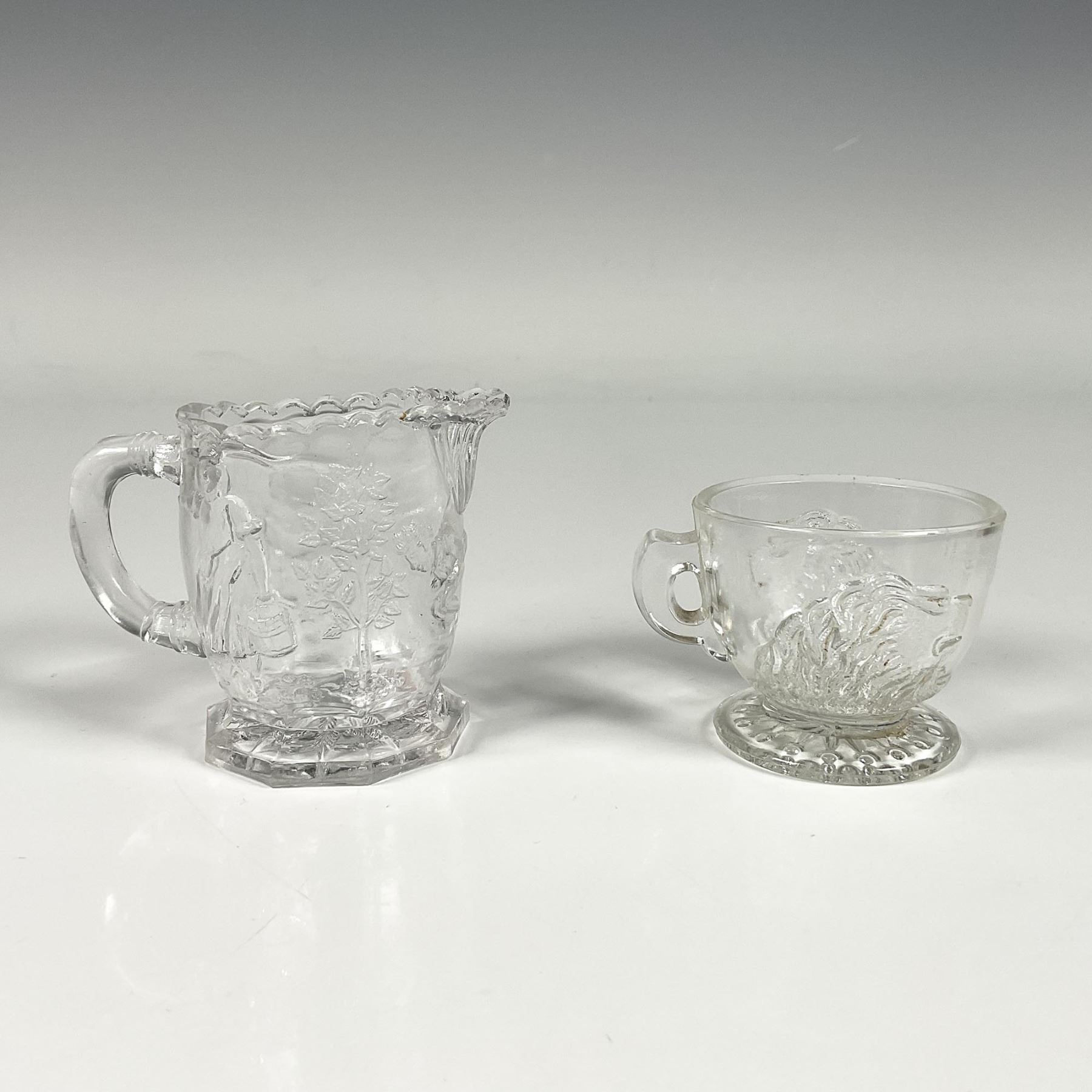 Clear glass creamer featuring a joyful scenery of various people, trees and a maple leaf on the bottom, alongside a teacup adorned with two lions. Creamer: 3.25"L x 2"W x 2.5"H. Teacup: 2.5"L x 2"W x 2"H.