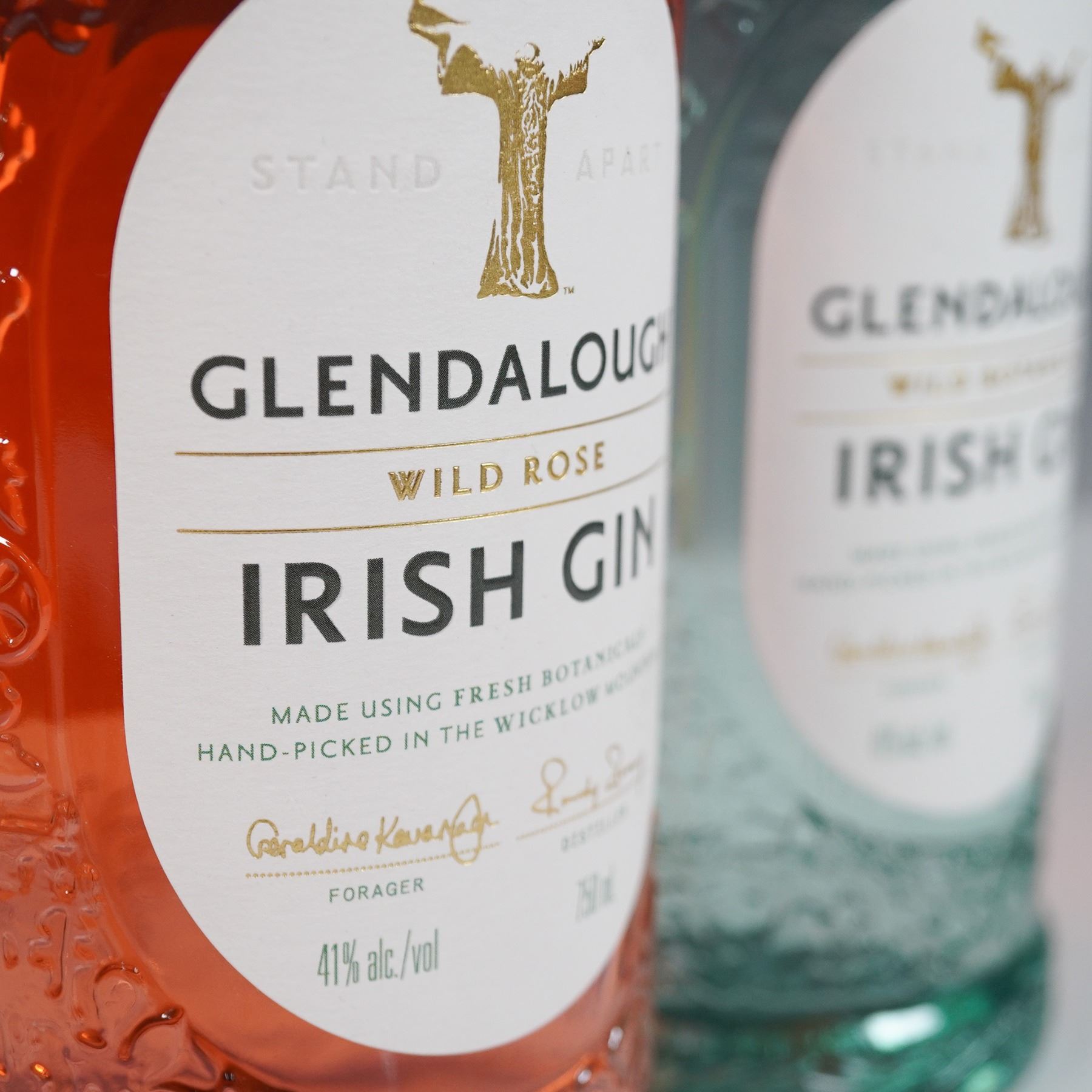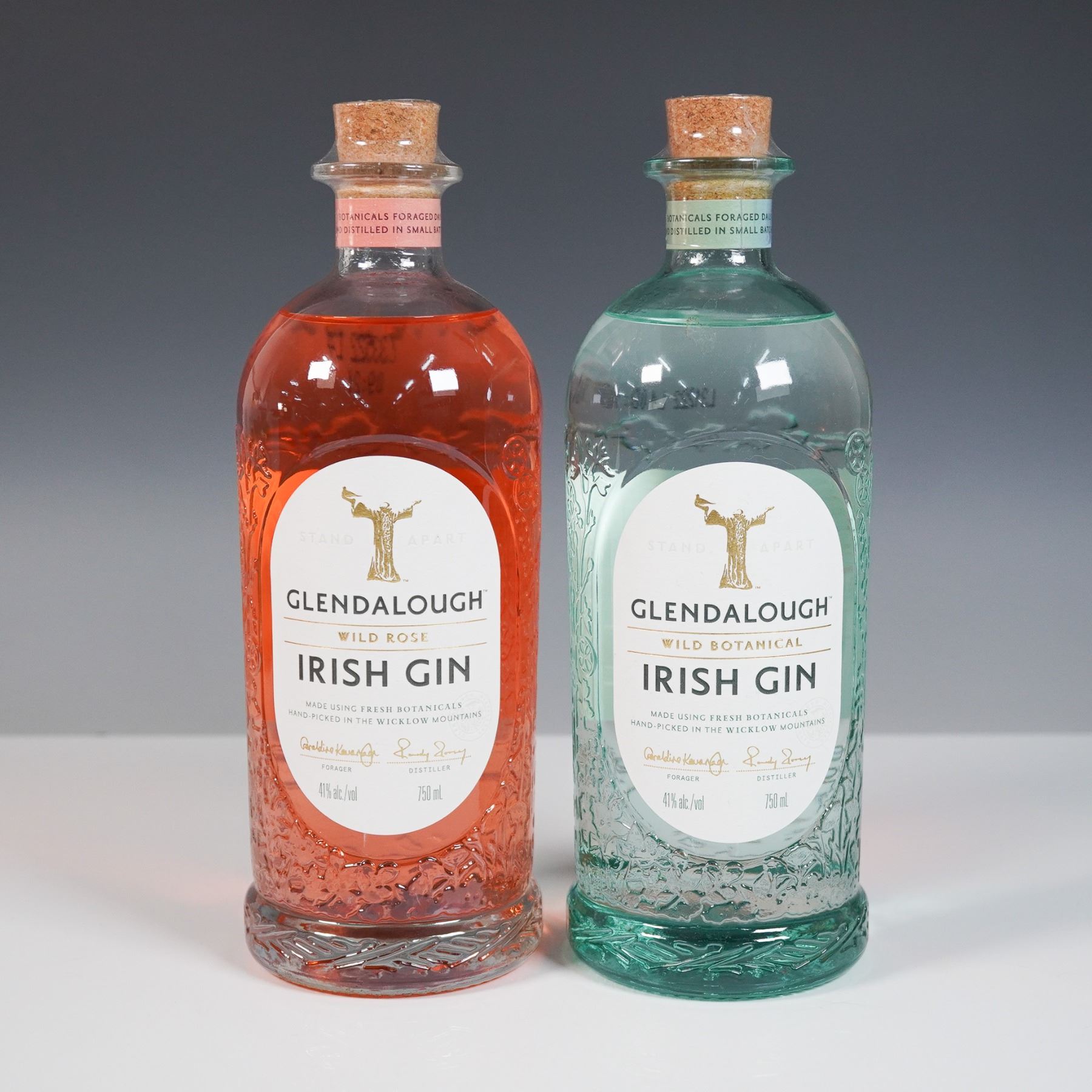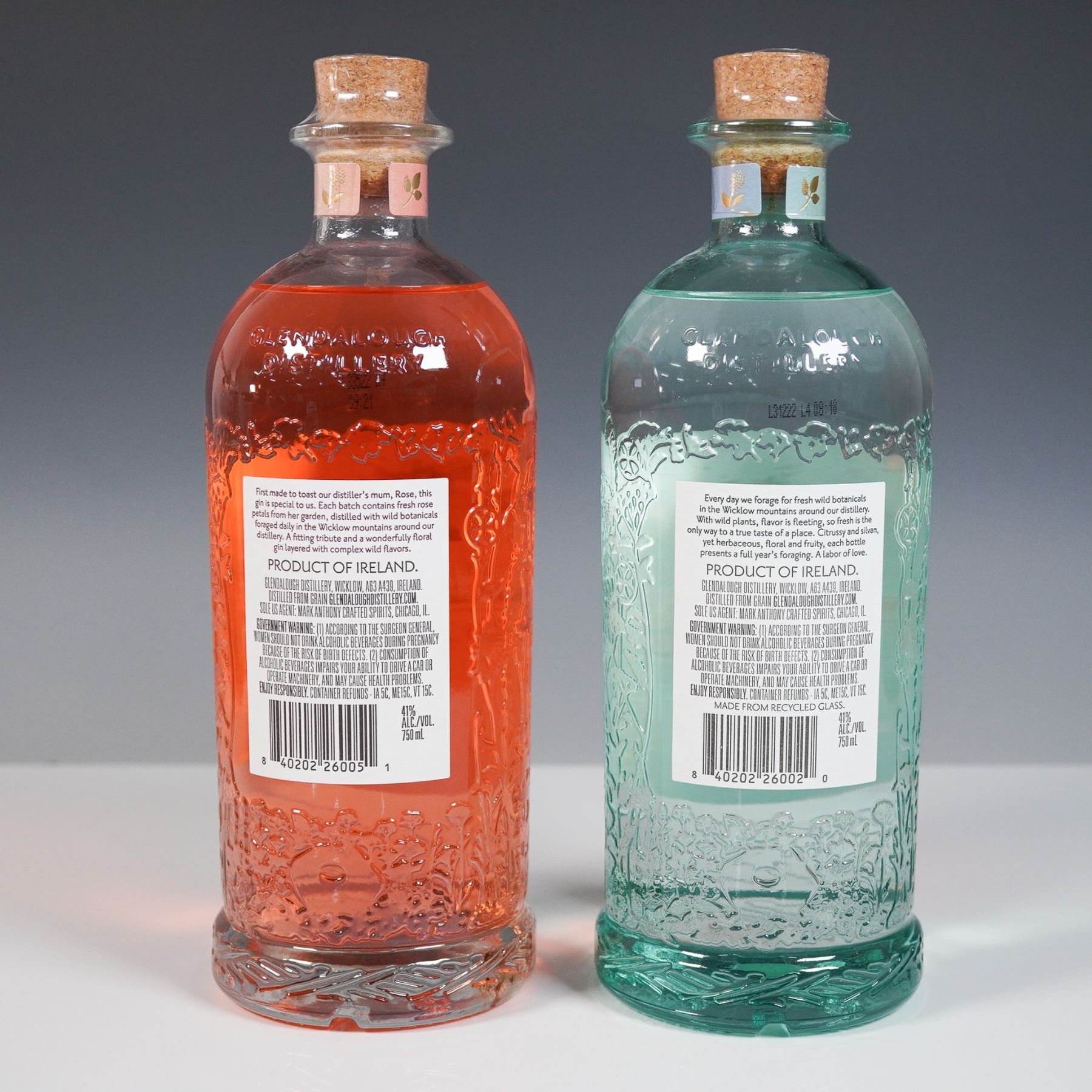Pair of Glendalough Irish Gin bottles, featuring the Wild Rose and Wild Botanical. Produced in Wicklow, Ireland, each gin is made with hand-foraged botanicals from the surrounding mountains. The Wild Rose variation is infused with fresh rose petals in tribute to the distiller's mother, delivering a delicate floral aroma and subtly sweet finish. The Wild Botanical variety features a blend of seasonal botanicals for a crisp, herbaceous profile. Both are presented in embossed glass bottles.