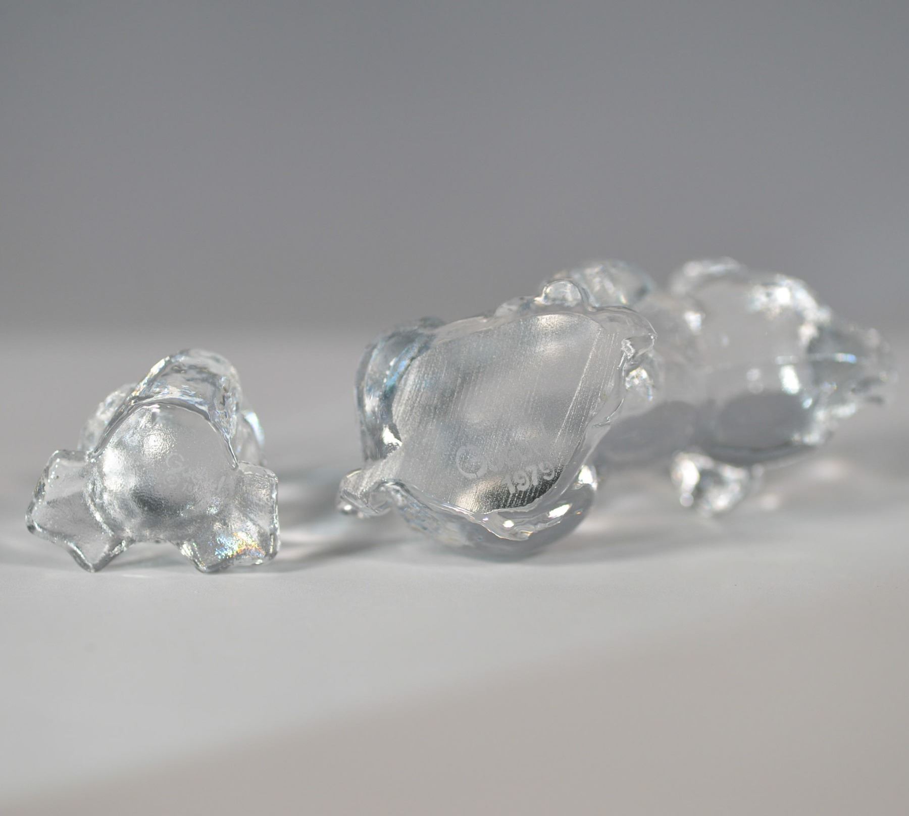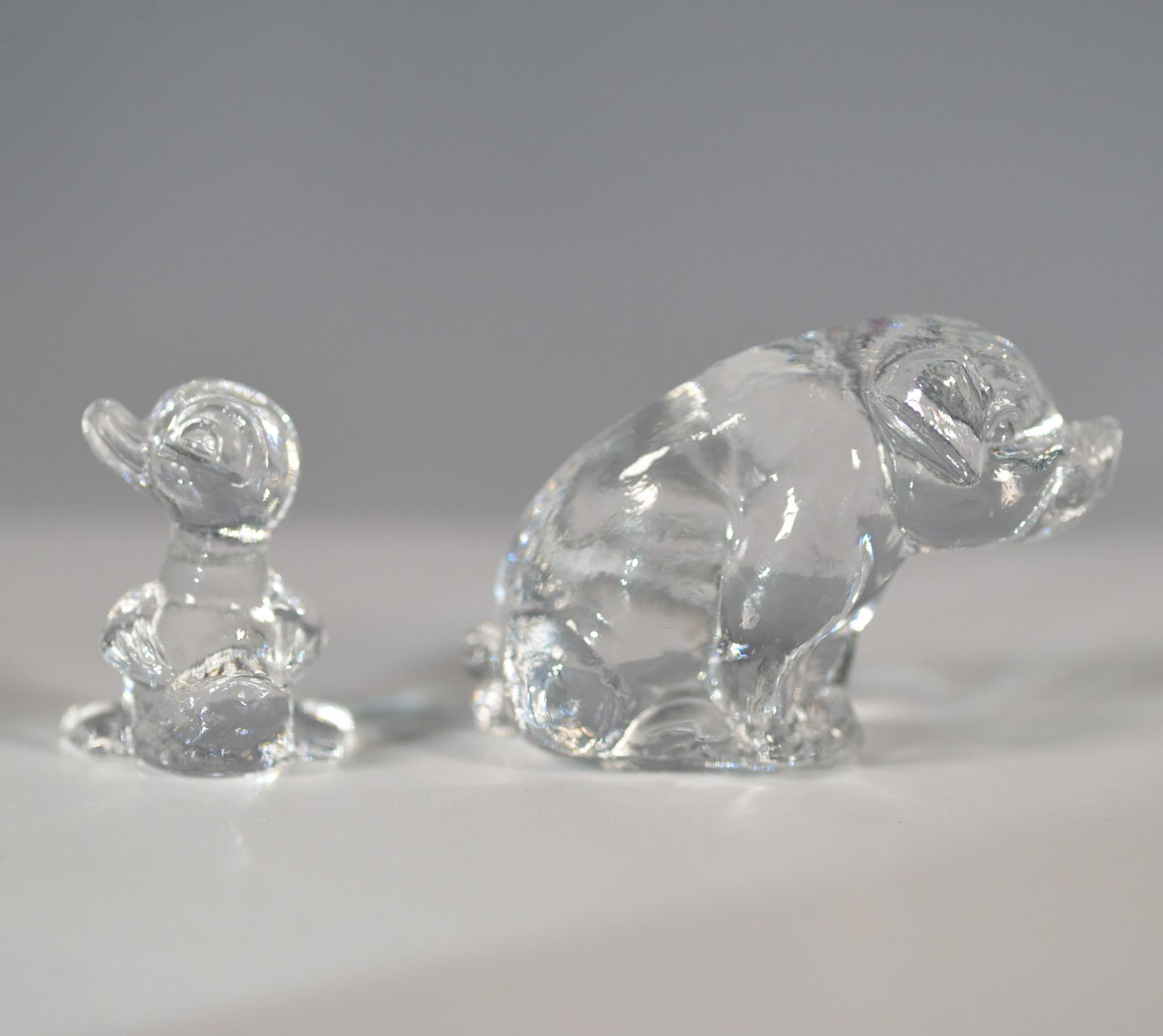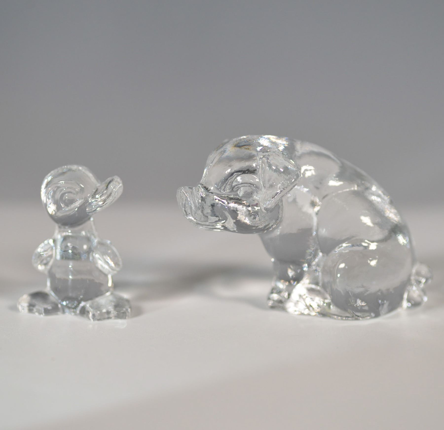 A Goebel crystal figurine set featuring a pig and duckling, elegantly crafted in clear crystal. These charming sculptures showcase Goebel's expertise in glass artistry, with smooth, rounded forms that enhance light reflection. Known for their fine porcelain and crystal designs, Goebel pieces are sought after by collectors for their craftsmanship and timeless appeal. Largest item measures 2"H.