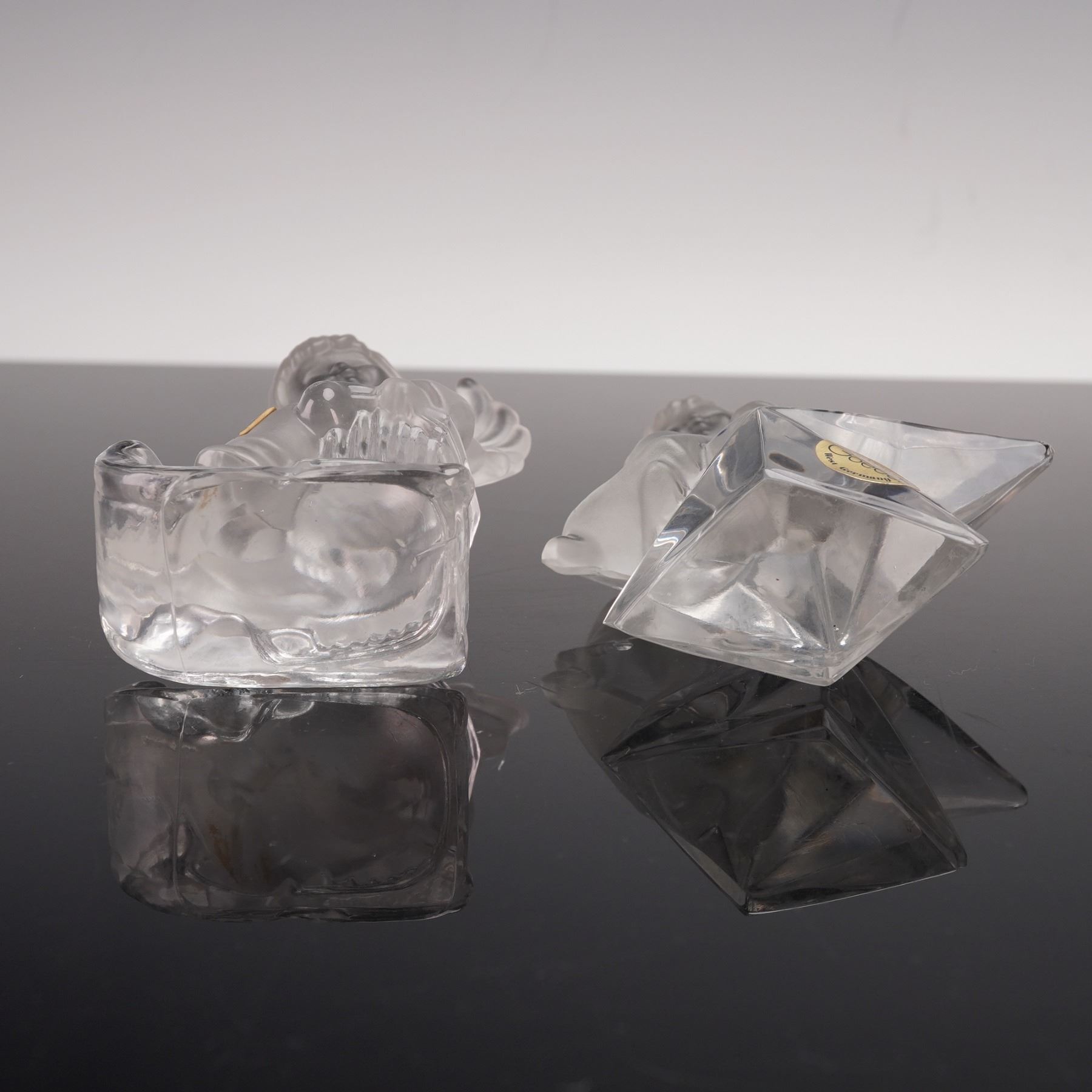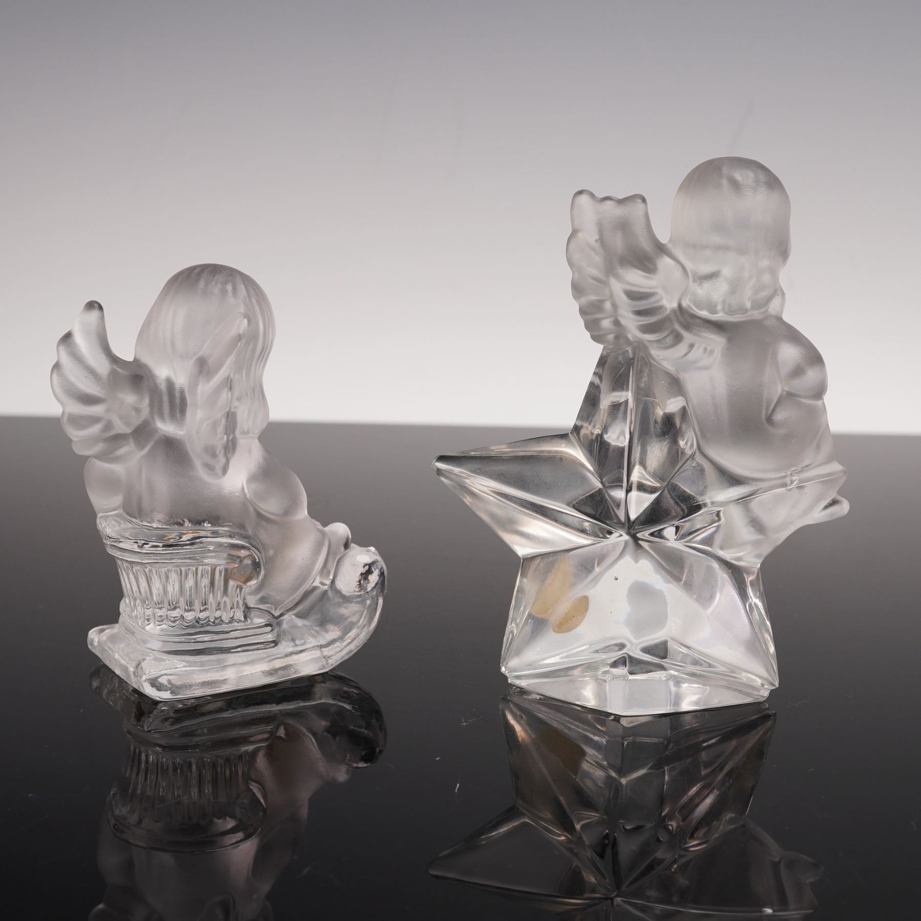 These two Goebel crystal angel figurines are made of frosted glass with clear accents that reflect light beautifully. One angel rests upon a faceted star while the other sits on a curved sled. Both figures feature detailed wings and gentle expressions, creating a peaceful and graceful appearance. Goebel Hummel manufacturing sticker.