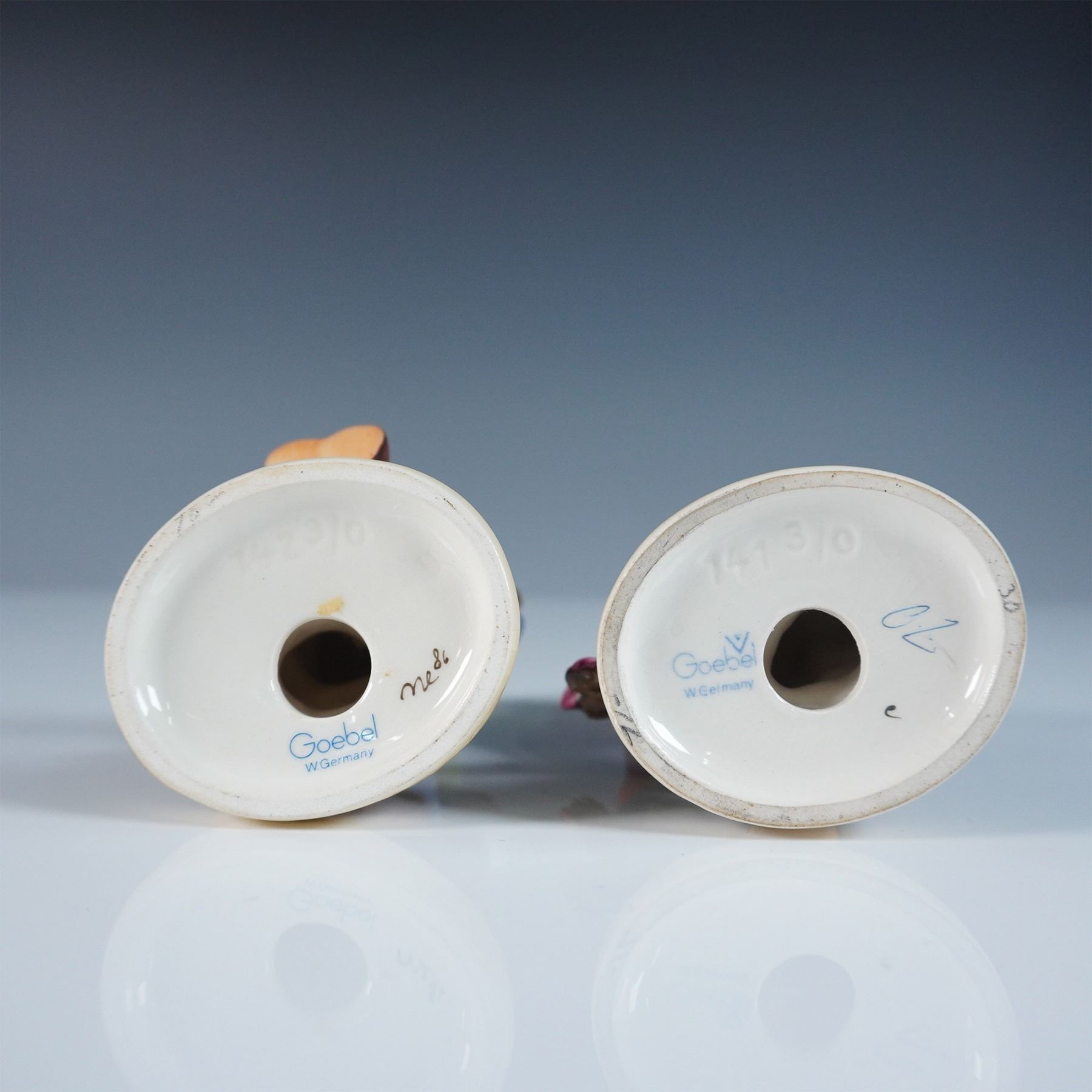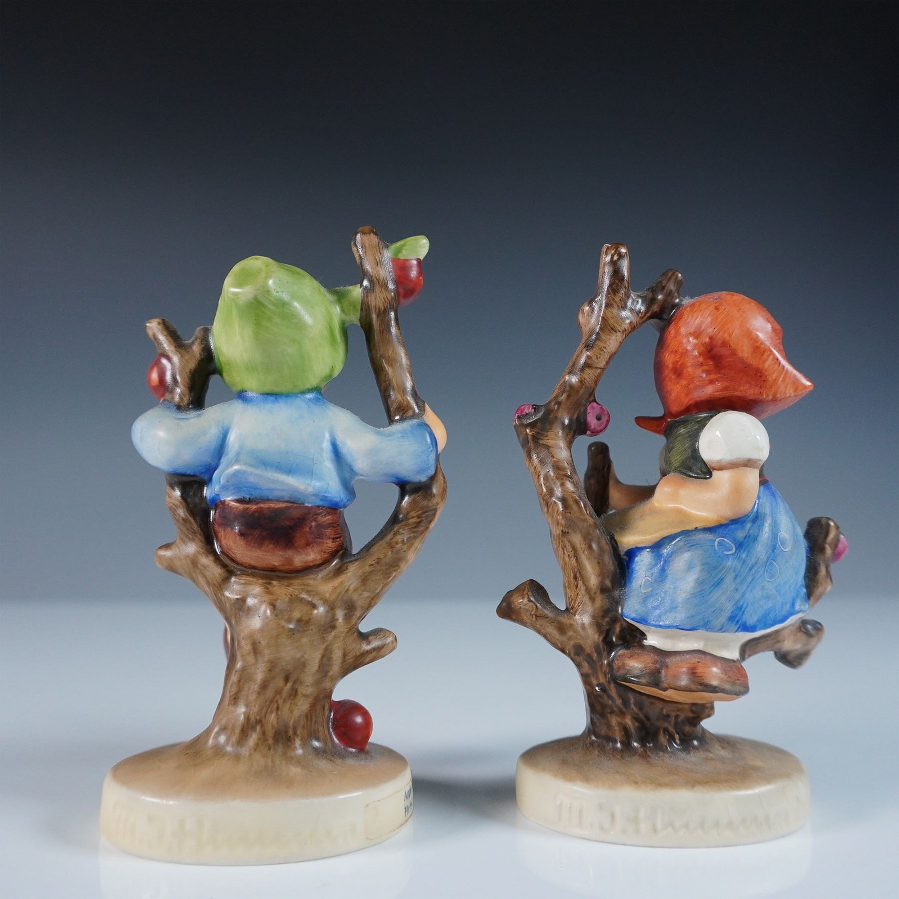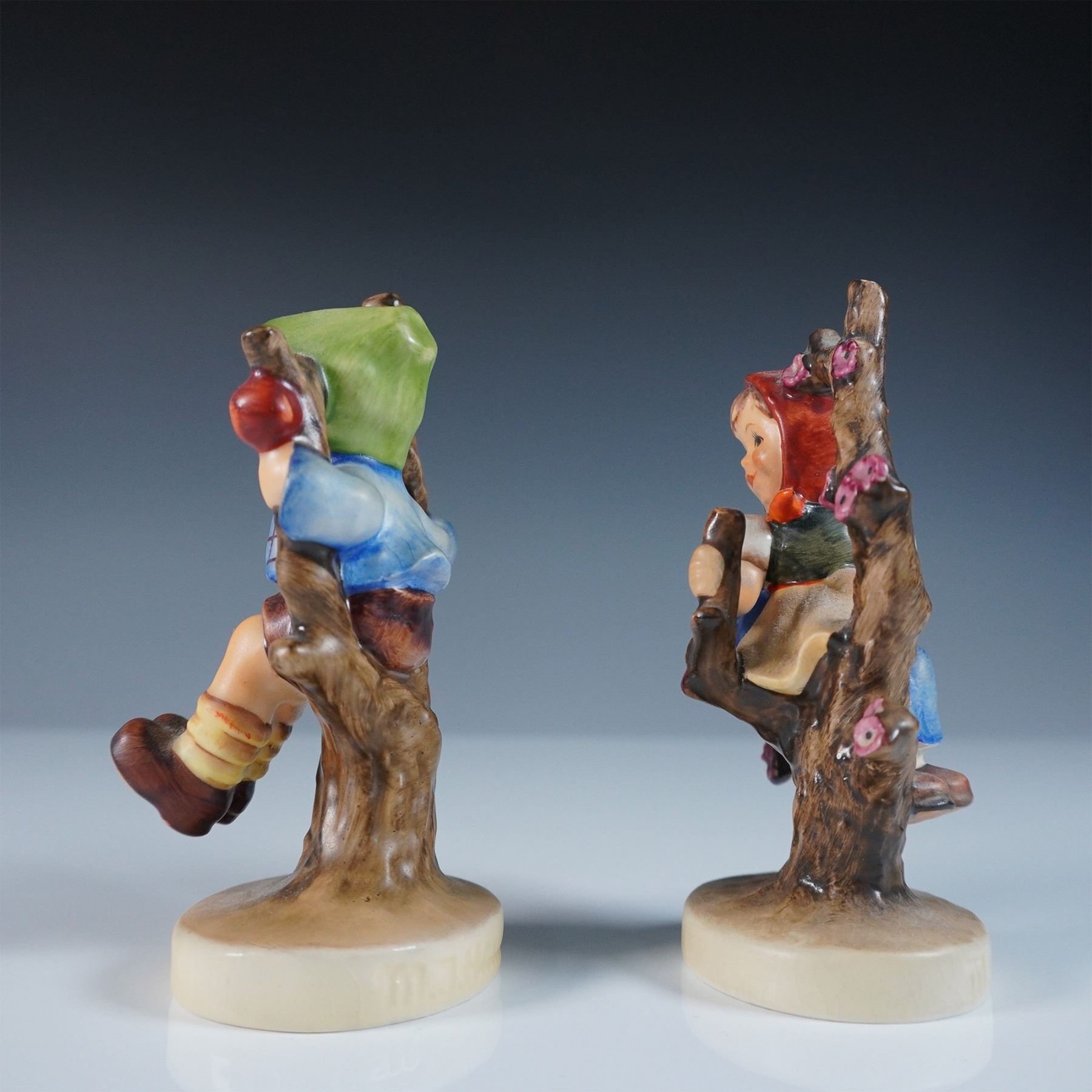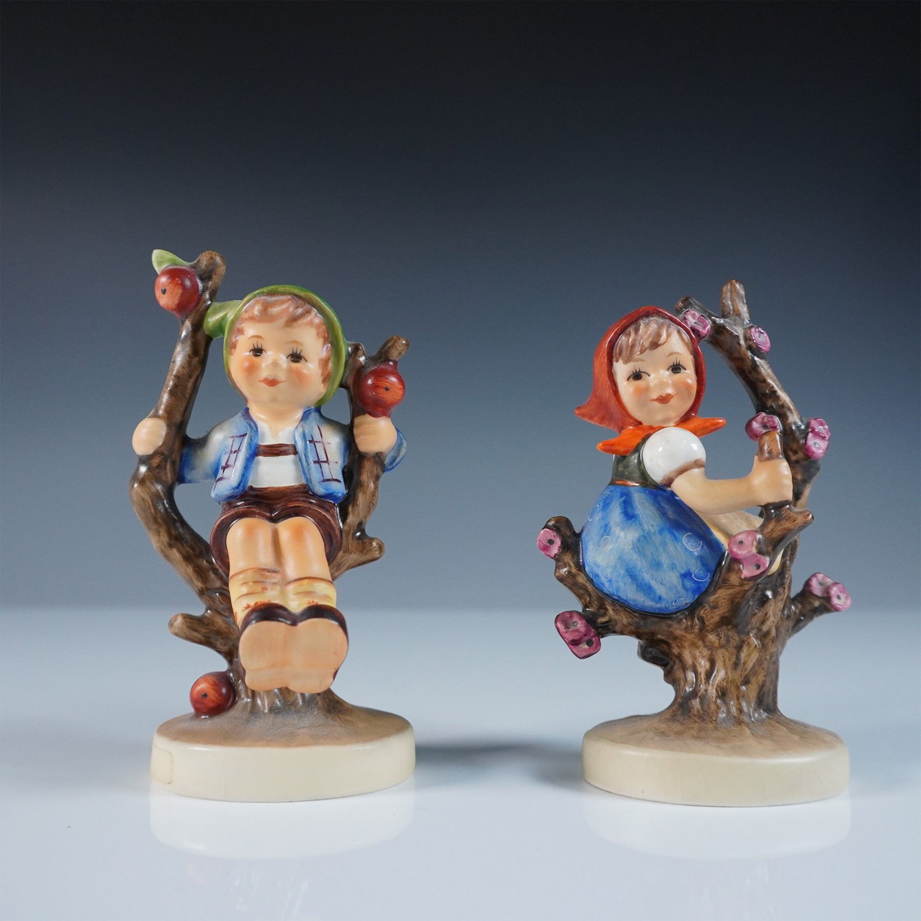 A delightful pair of Goebel Hummel figurines, featuring Apple Tree Boy and Apple Tree Girl. These beloved Hummel designs depict a young boy and girl sitting on blooming apple tree branches, dressed in traditional Bavarian attire with finely hand-painted details. Both figurines bear Goebel West Germany backstamps, indicating mid-to-late 20th-century production. Largest item measures 4.25"H.