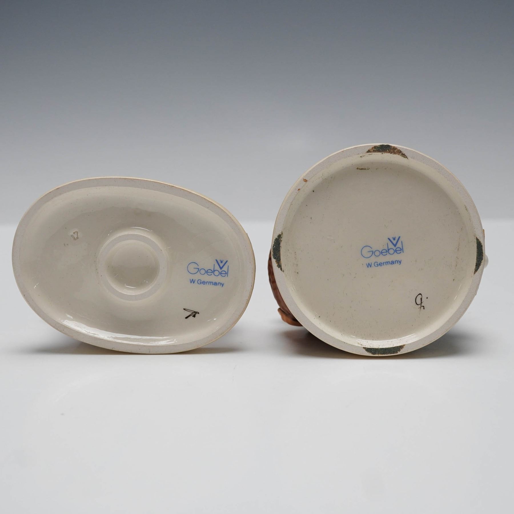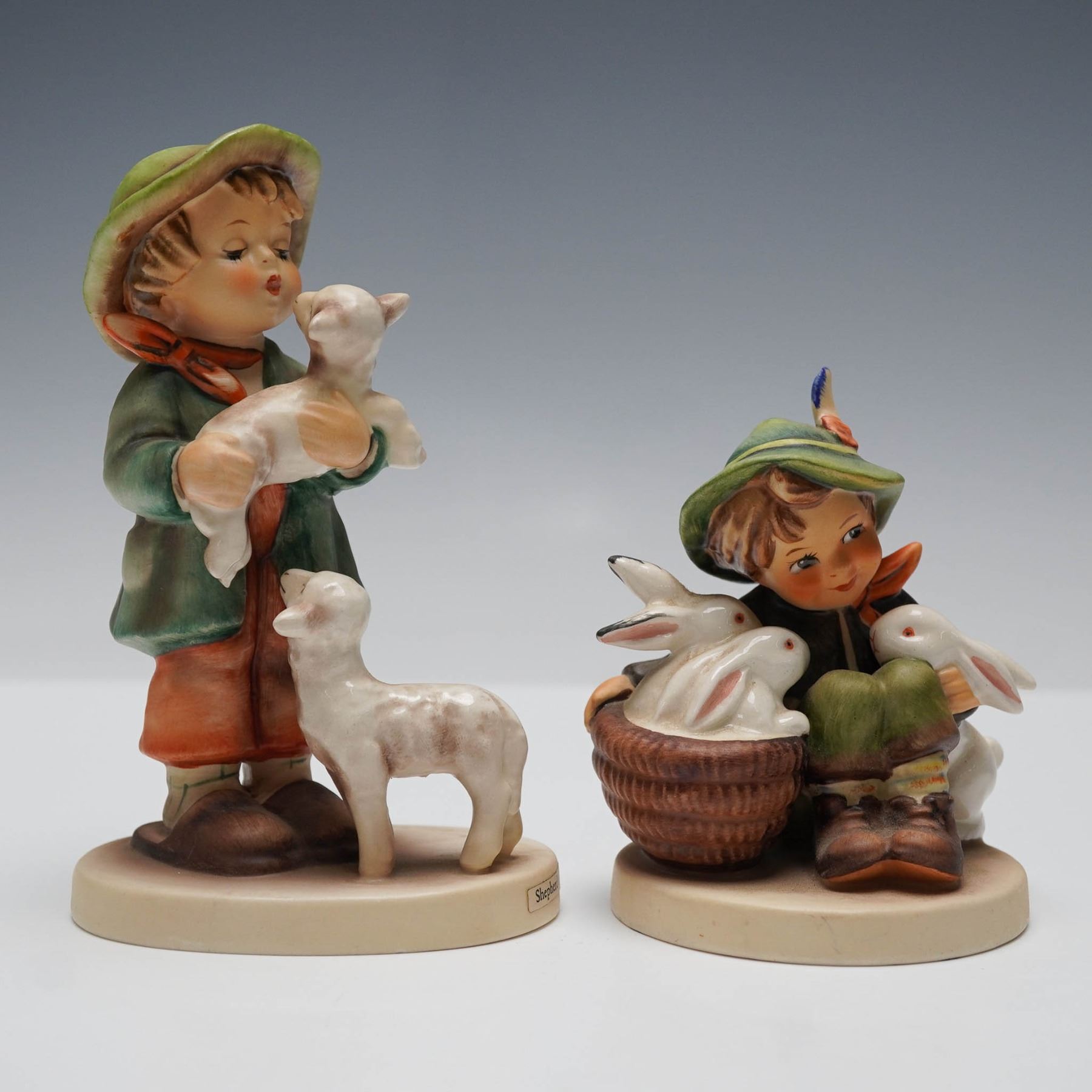 A delightful pair of Goebel Hummel porcelain figurines, each marked with the Goebel W. Germany backstamp. Playmates features a young boy seated with three white rabbits, one nestled in a basket and two under his arms, wearing a green hat with a feather. Shepherd’s Boy depicts a young child lovingly holding a lamb with another lamb at his feet, dressed in a green coat and orange trousers. Both figurines exhibit the soft pastel palette, fine hand-painted details, and expressive charm that define Hummel artistry. A lovely duo celebrating the tender bond between children and animals. Largest measures 5.5"H.