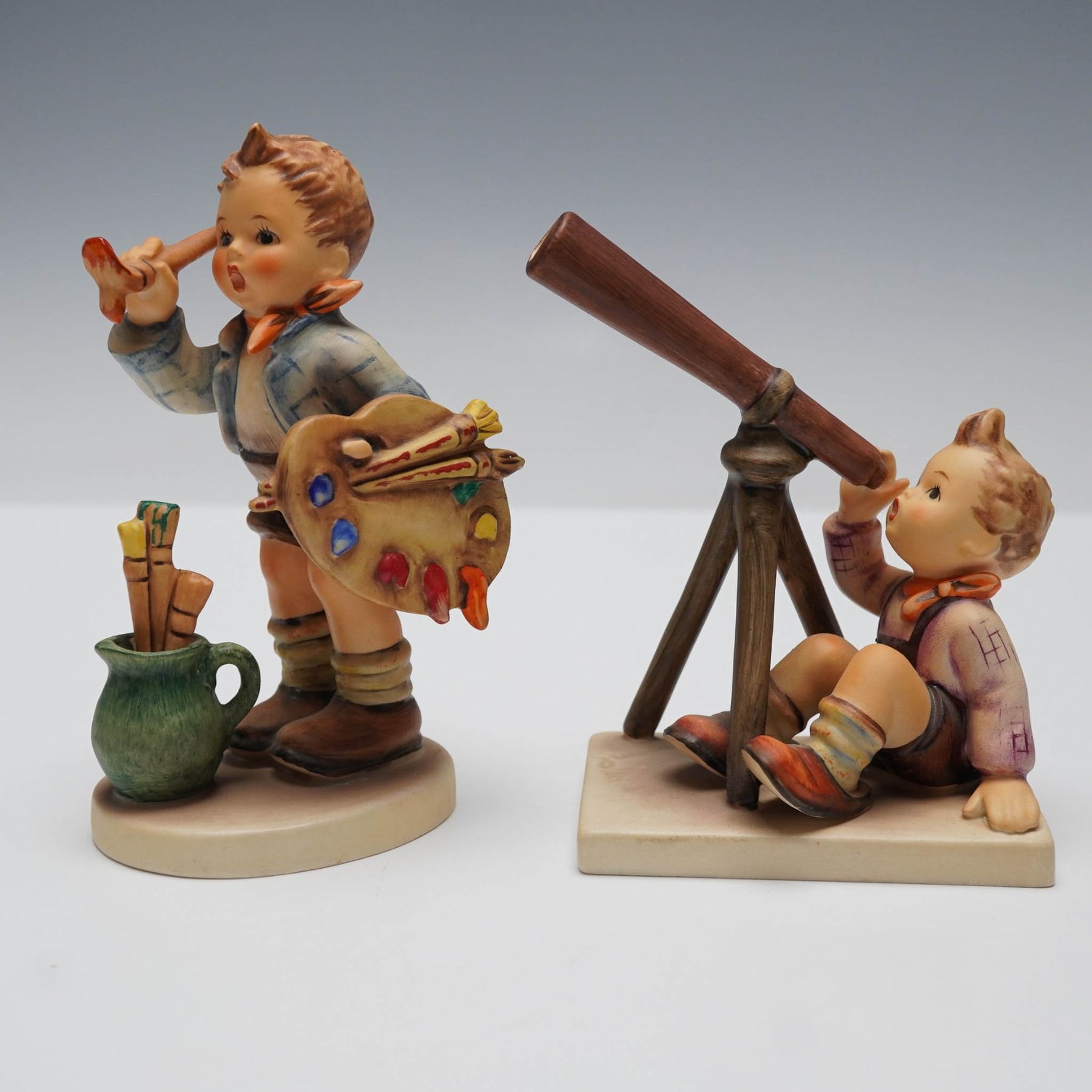 Pair of vintage Goebel Hummel figurines made in West Germany, featuring the charming subjects The Artist and Star Gazer. The Artist depicts a young boy in the midst of painting, complete with a palette and brush in hand, while Star Gazer captures a boy peering through a large telescope in seated position, gazing skyward. Both pieces are finished in the classic Hummel color palette with hand-painted details and bear the Goebel West Germany backstamp. Largest measures 4"L x 4.75"H.