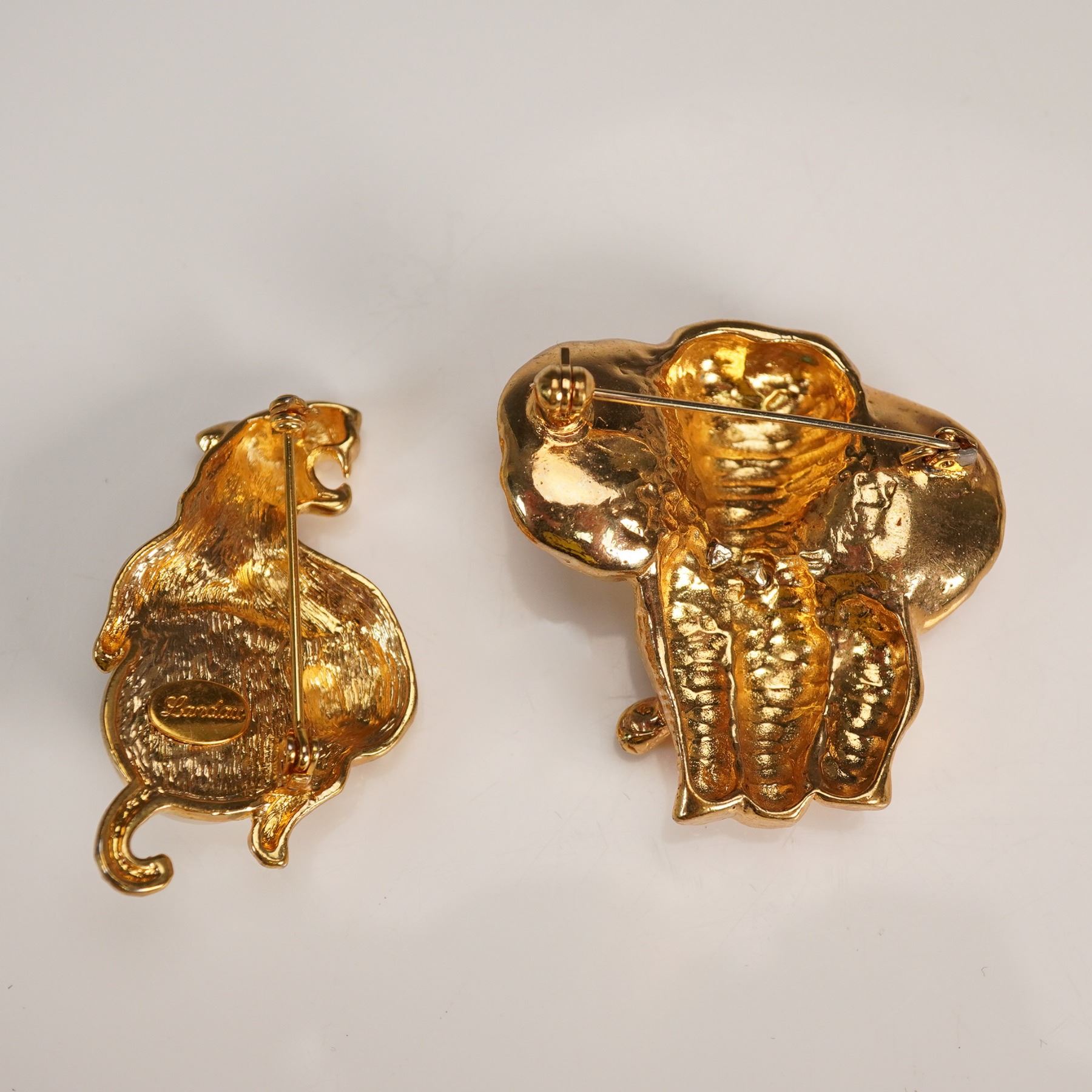 2pc Gold Tone Animal Brooch Set, Landau Tiger and Elephant