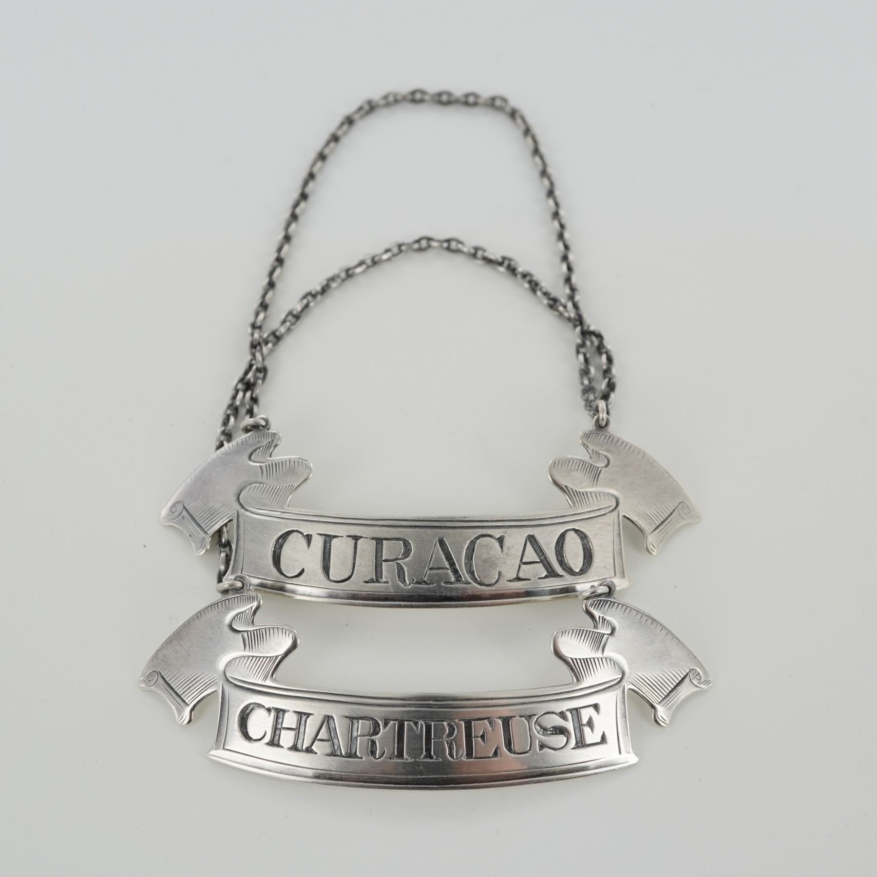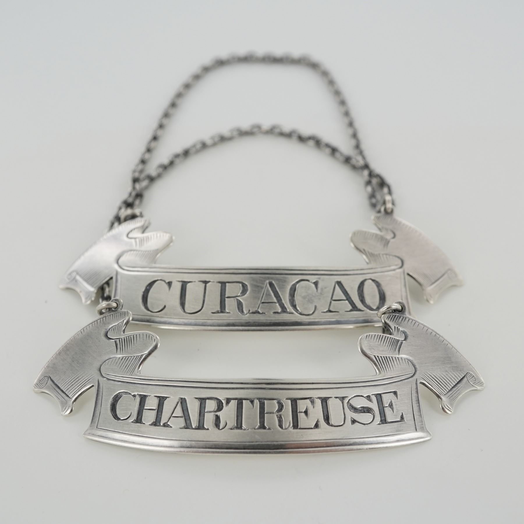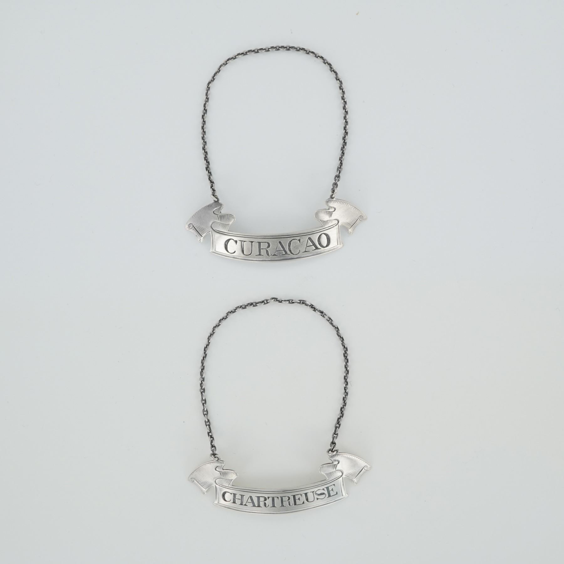 Each finely crafted in a banner form with flared ends and suspended from matching silver chains. One label engraved "CURACAO" and the other "CHARTREUSE," both featuring crisp lettering and decorative edge detailing. The reverse of each bears the hallmark with a lion passant, anchor, and maker's mark, stamped "STERLING 14." The overall silver is 20g.