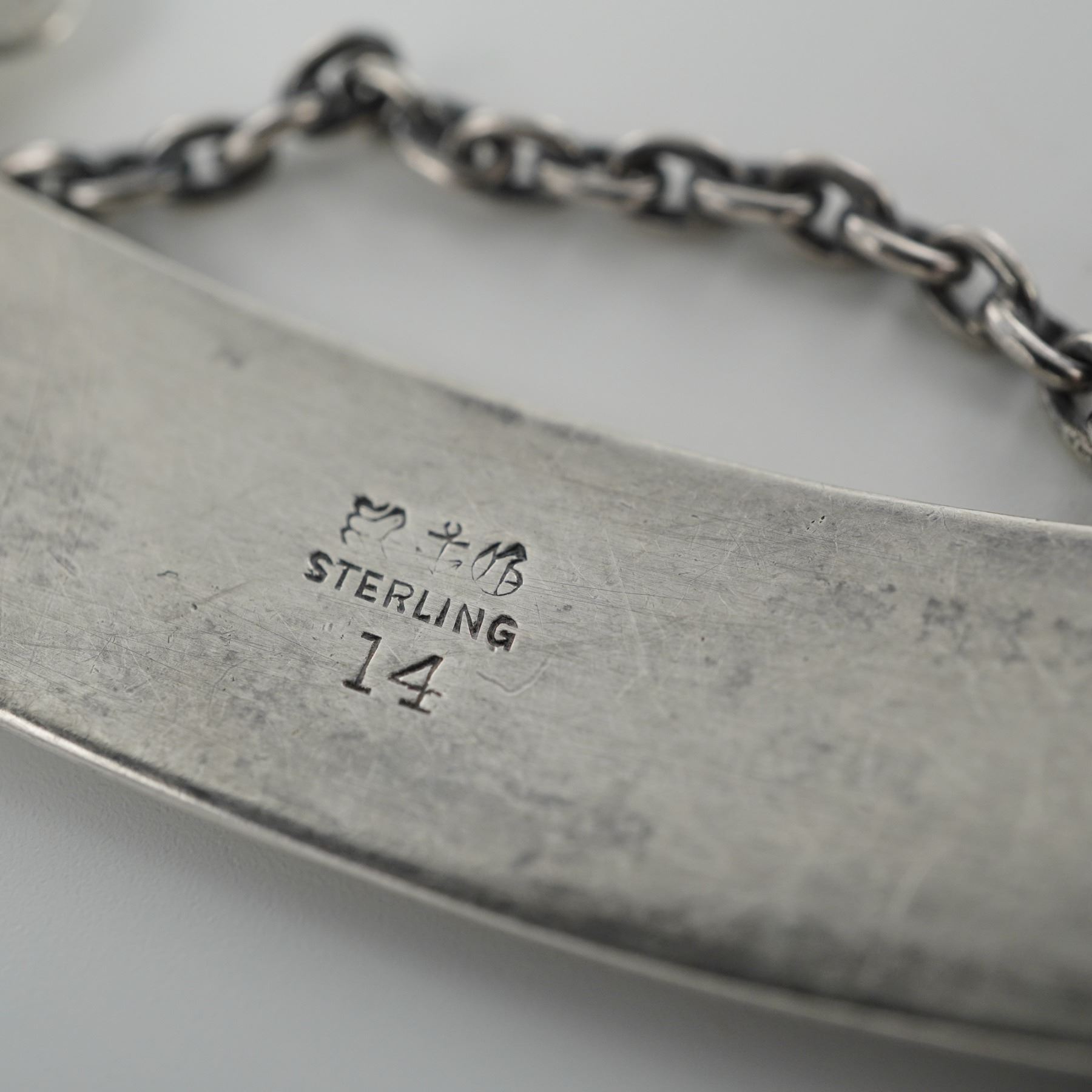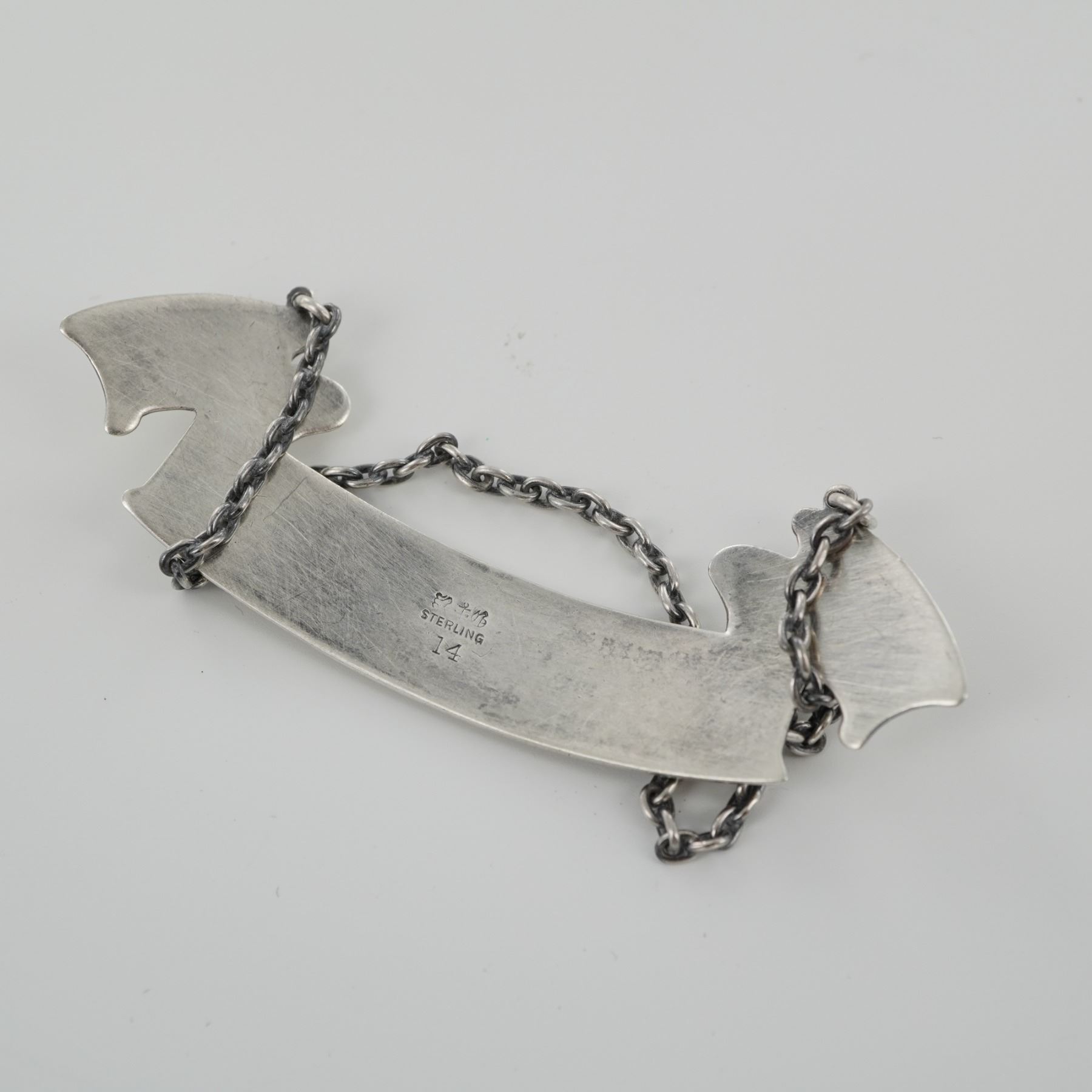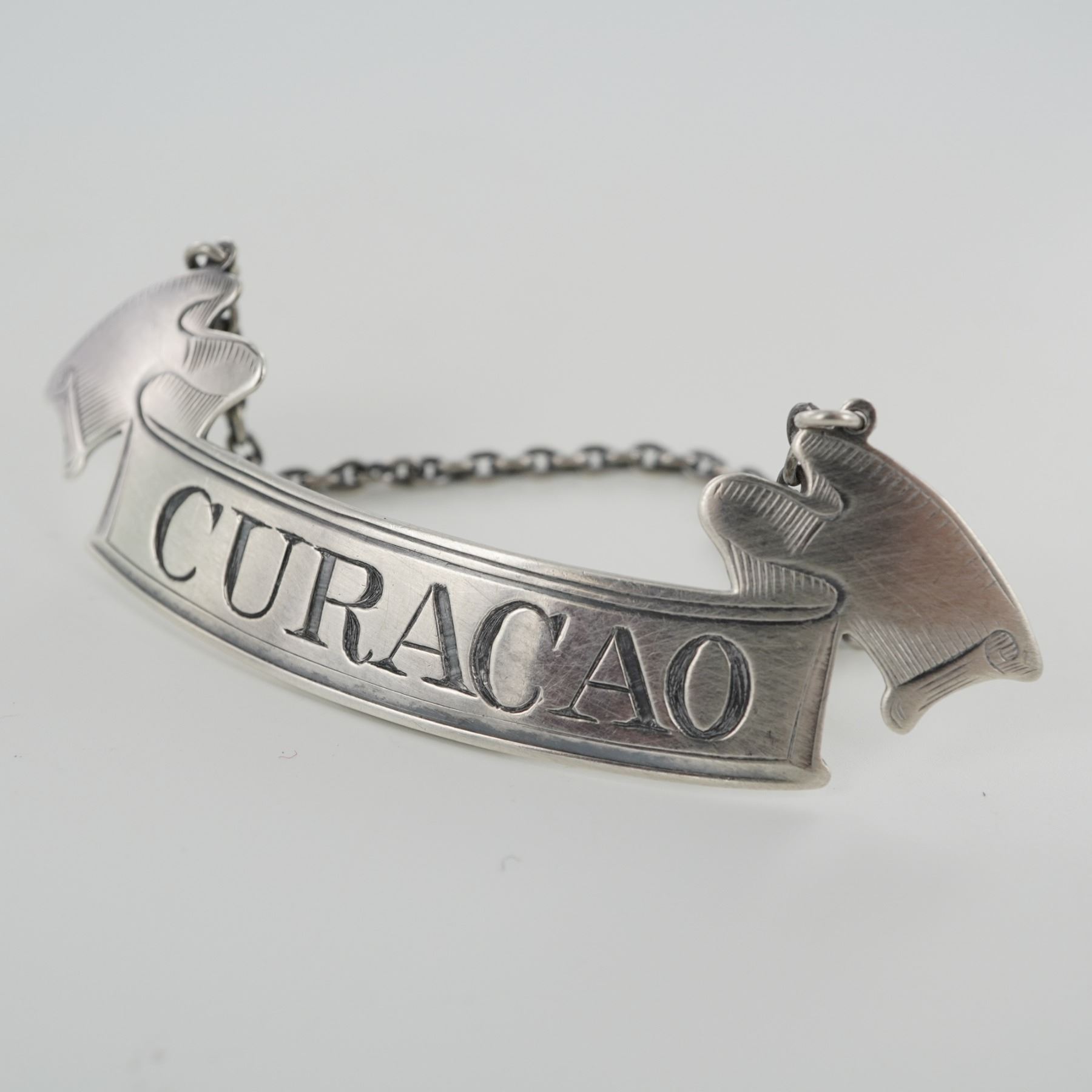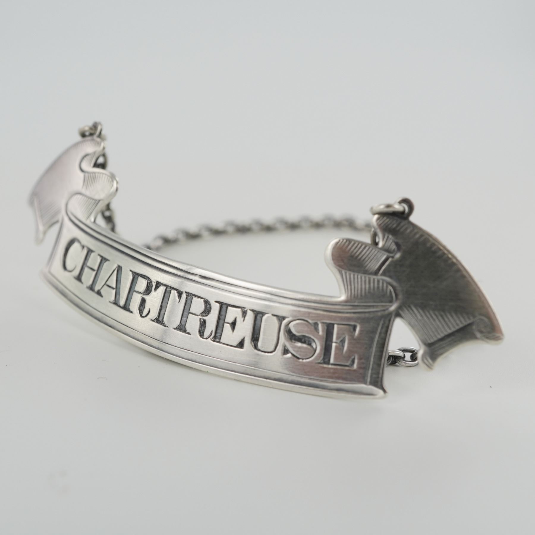 Each finely crafted in a banner form with flared ends and suspended from matching silver chains. One label engraved "CURACAO" and the other "CHARTREUSE," both featuring crisp lettering and decorative edge detailing. The reverse of each bears the hallmark with a lion passant, anchor, and maker's mark, stamped "STERLING 14." The overall silver is 20g.