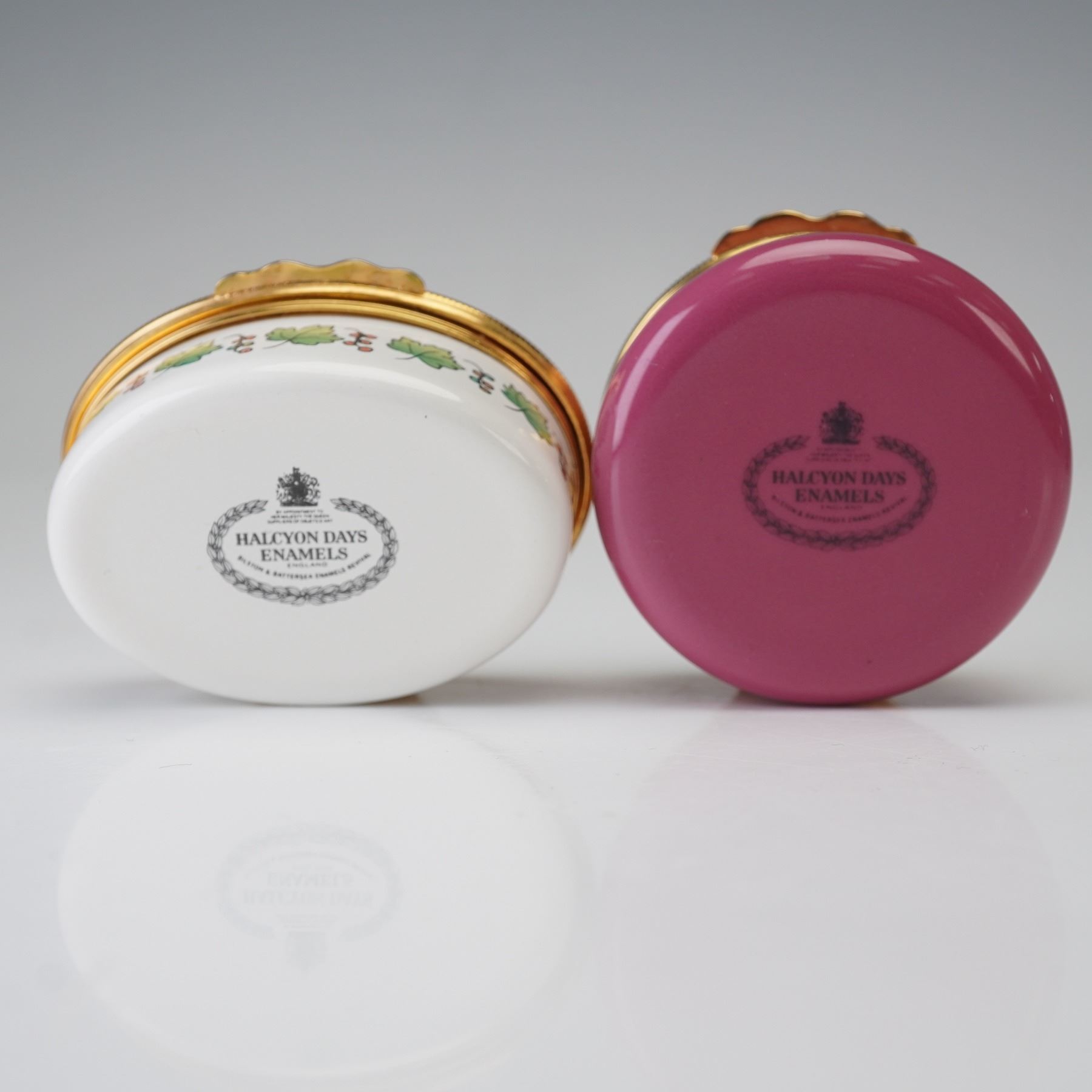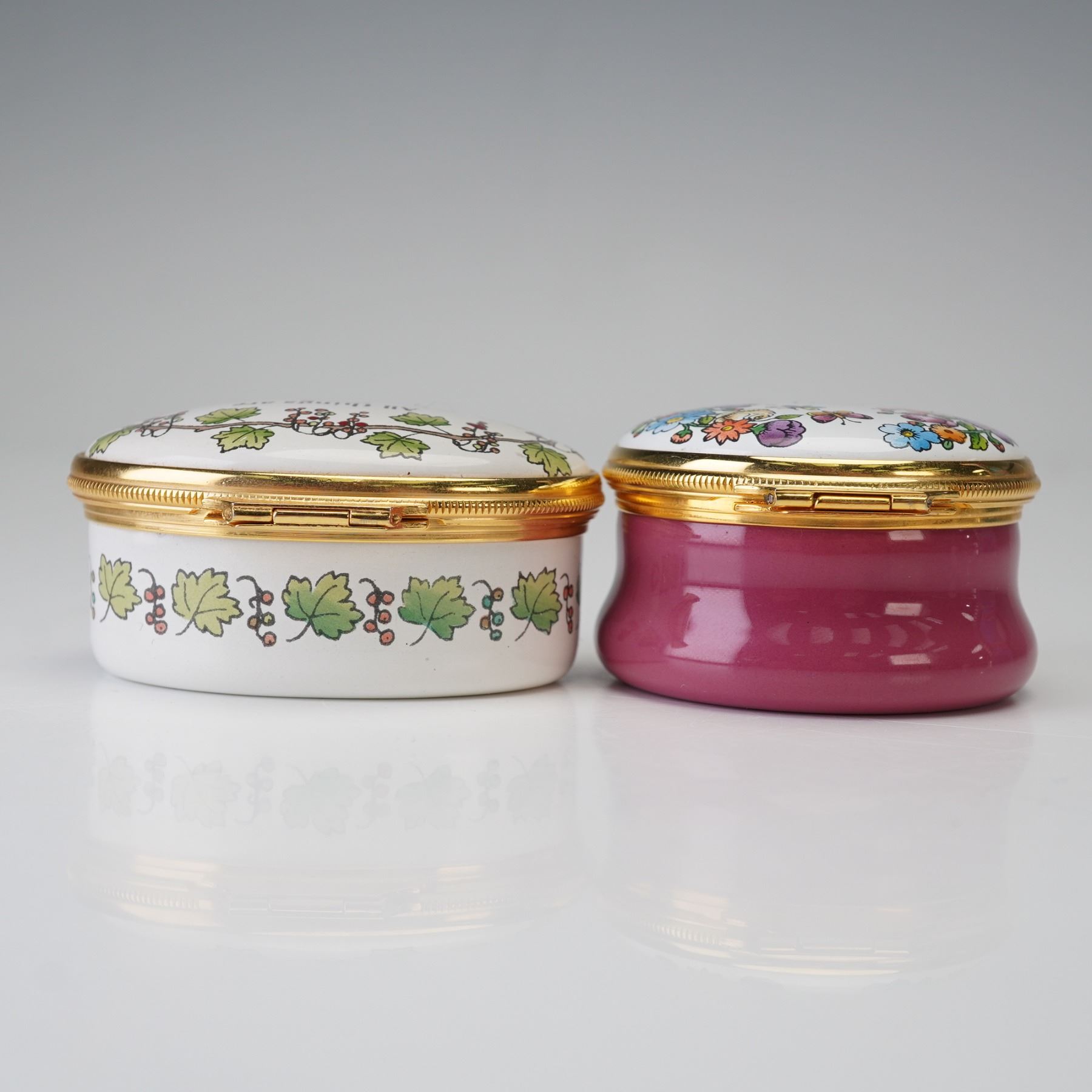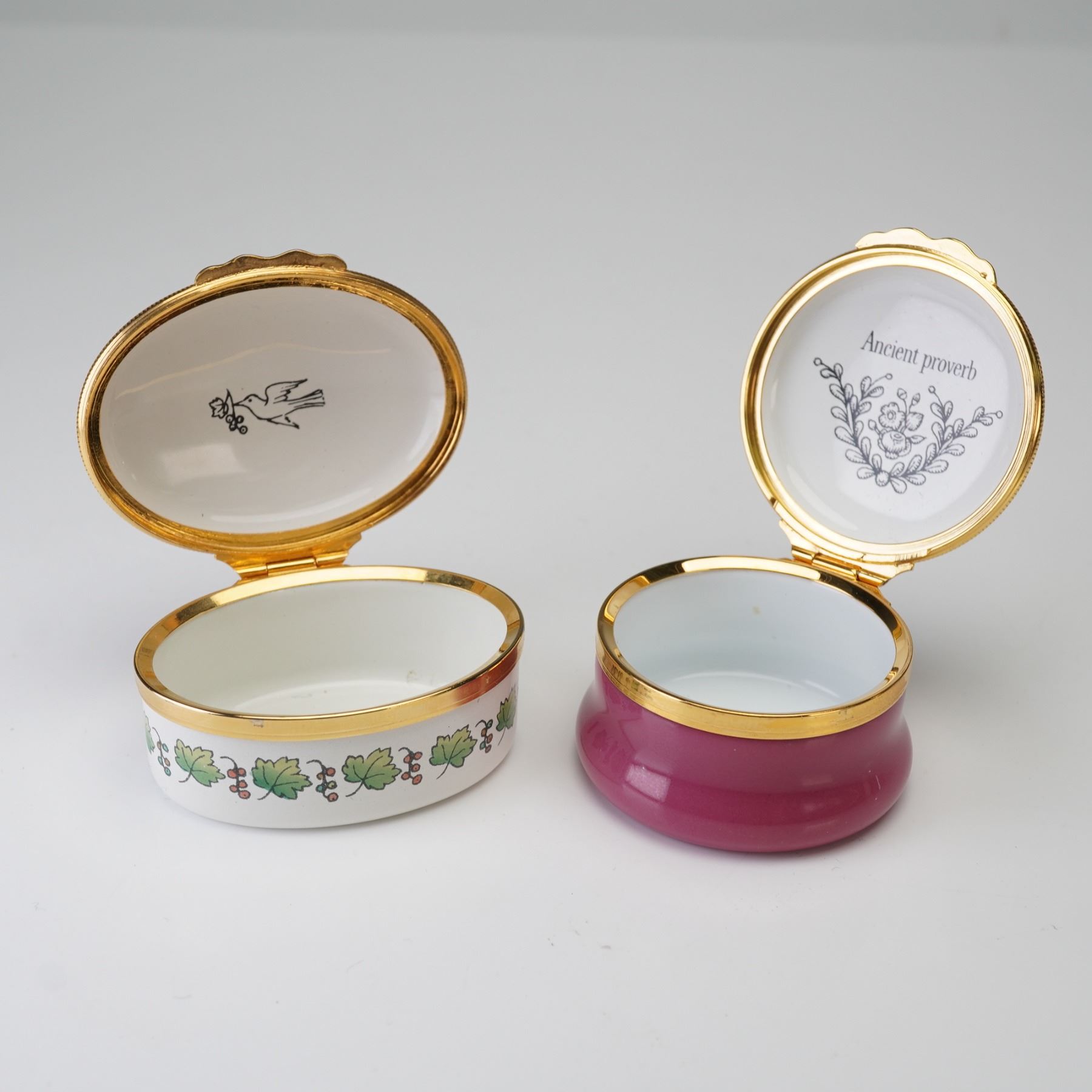 Comprising one oval enamel box inscribed "All things are sweetened by risk," decorated with bluebirds, grapevines, and interior image of a dove; and one circular enamel box with pink base, inscribed "Friendship is love with understanding," surrounded by a floral wreath and interior inscription "Ancient proverb." Both with gilt metal mounts and marked underside "Halcyon Days Enamels."