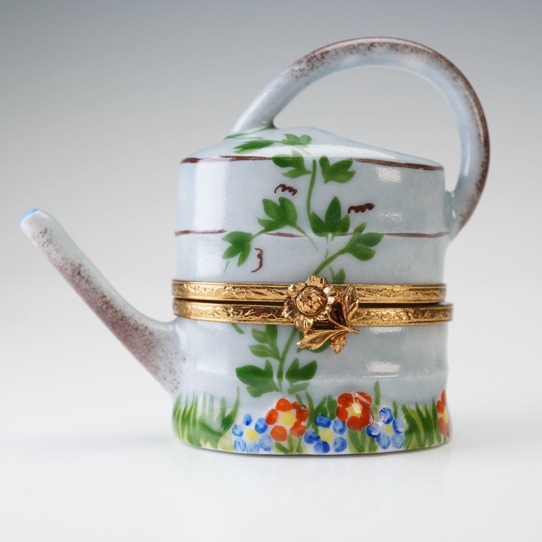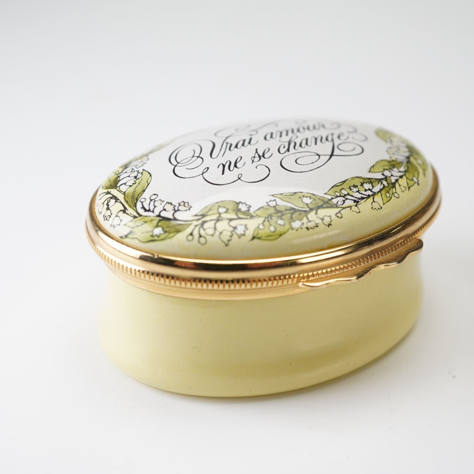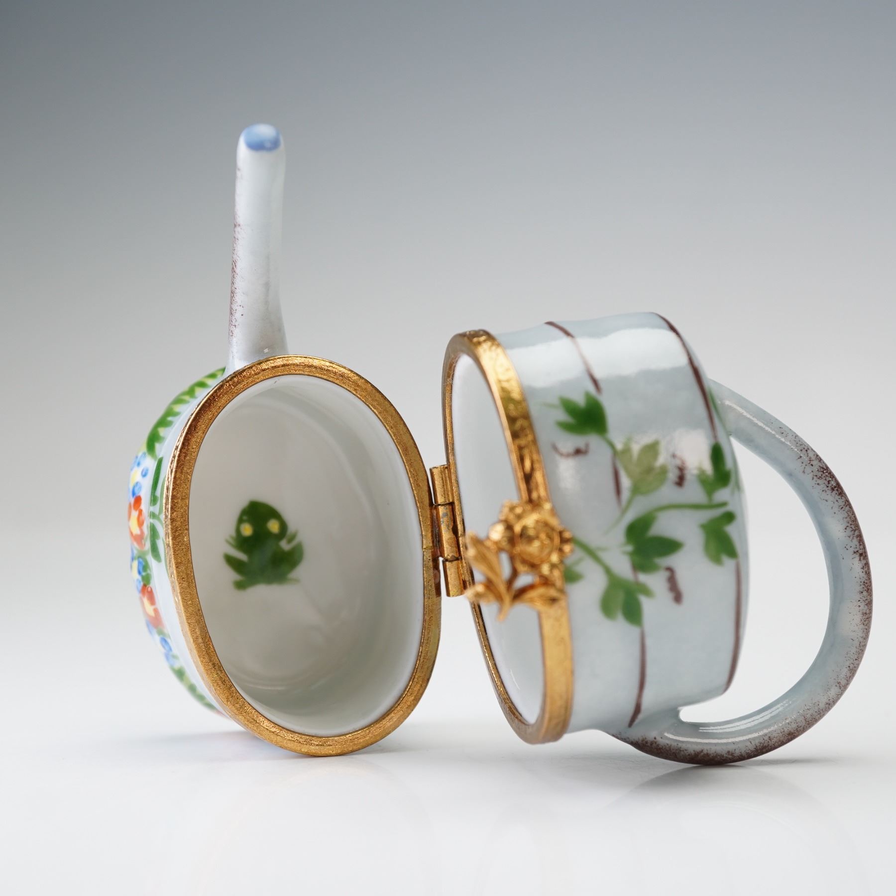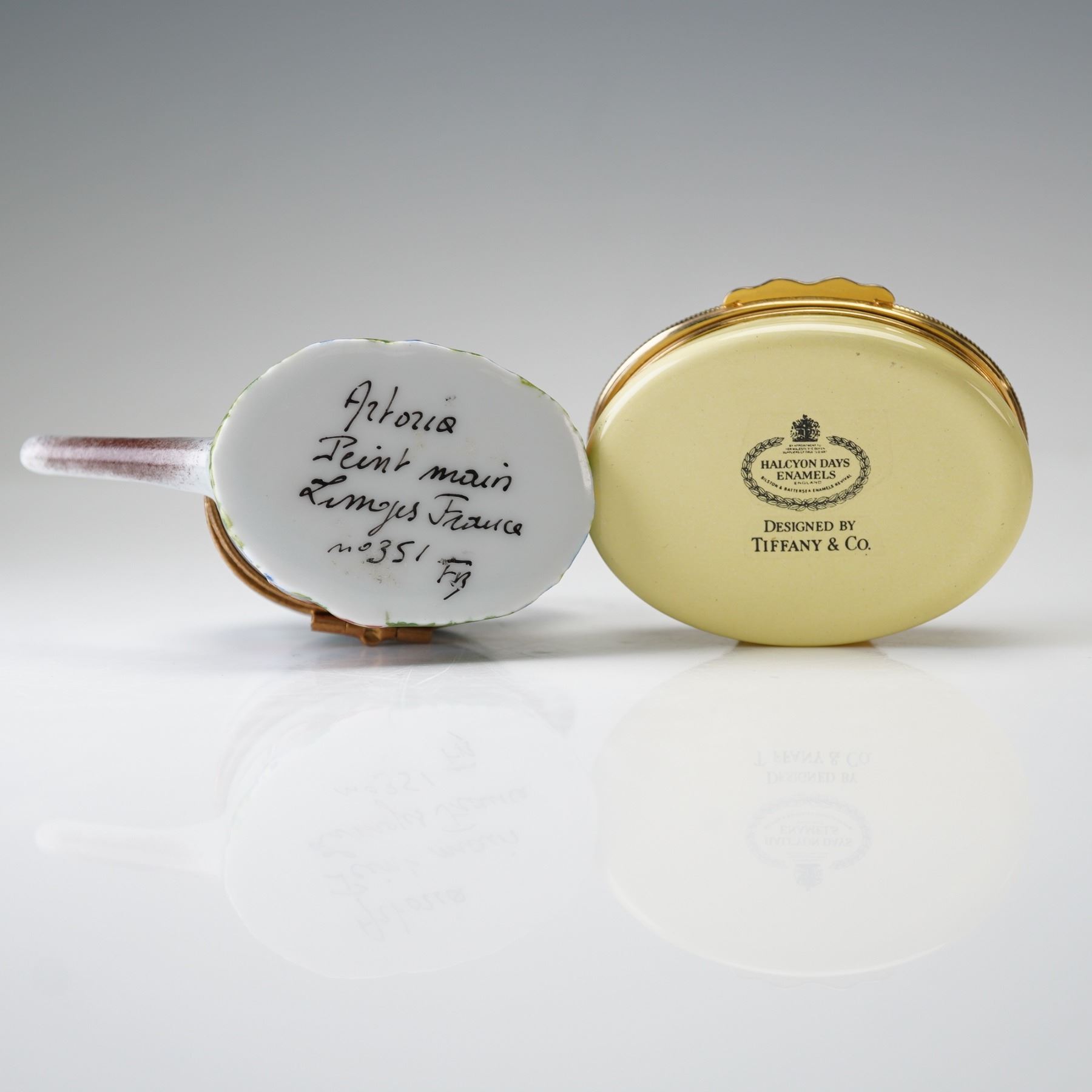 A lovely pair of collectible porcelain boxes, including a watering can Limoges example, hand-painted with floral motifs and accented with gilt bronze fittings. The underside is marked: Atoria, Peint main, Limoges France, No. 351. Accompanying it is a Halcyon Days enamel box designed by Tiffany & Co., its lid inscribed "Vrai amour ne se change" surrounded by a garland of white blossoms and greenery.