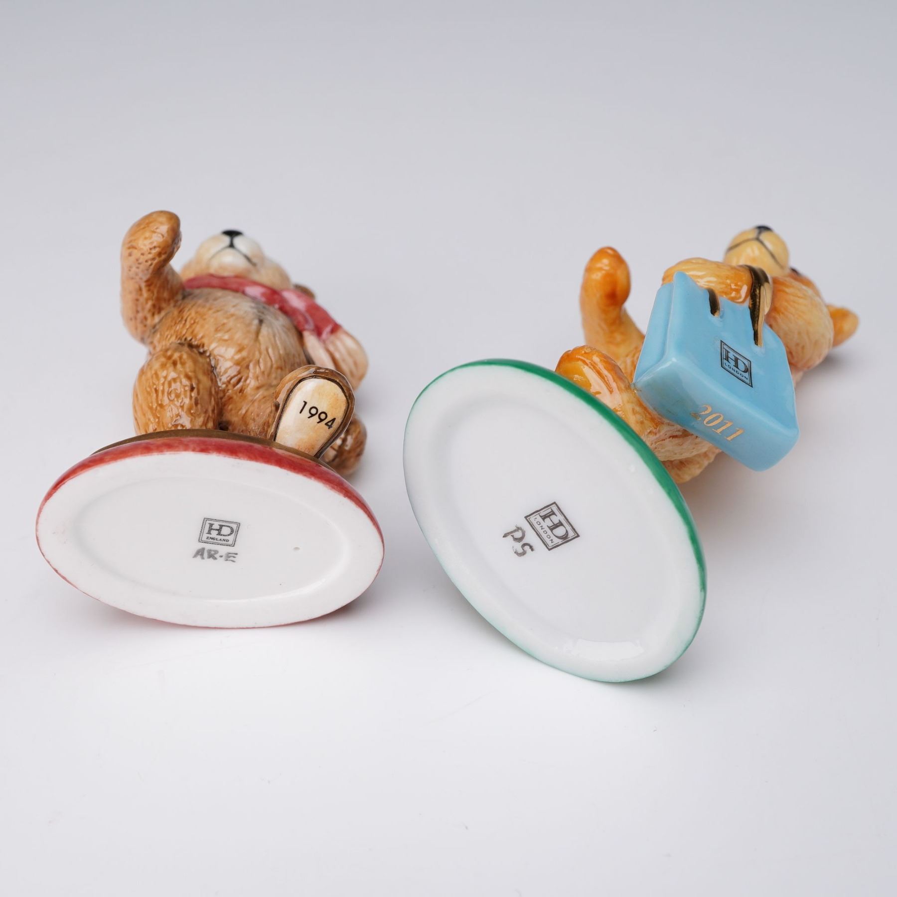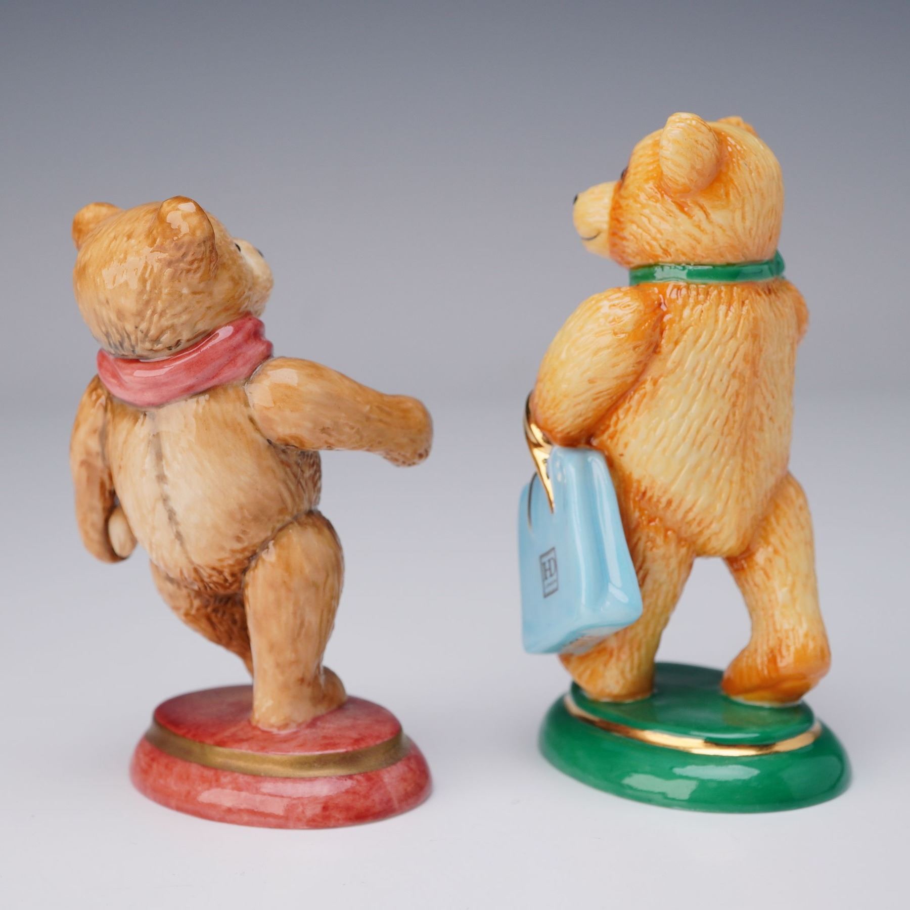 Duo of Halcyon Days enamel teddy bear figurines, each hand-painted and finely detailed. The first bear, dated 1994, wears a red scarf and stands on a red base marked AK-E. The second bear, dated 2011, carries a light blue briefcase with an HD logo and stands on a green base marked R.S. Both pieces display the Halcyon Days backstamp to the underside.